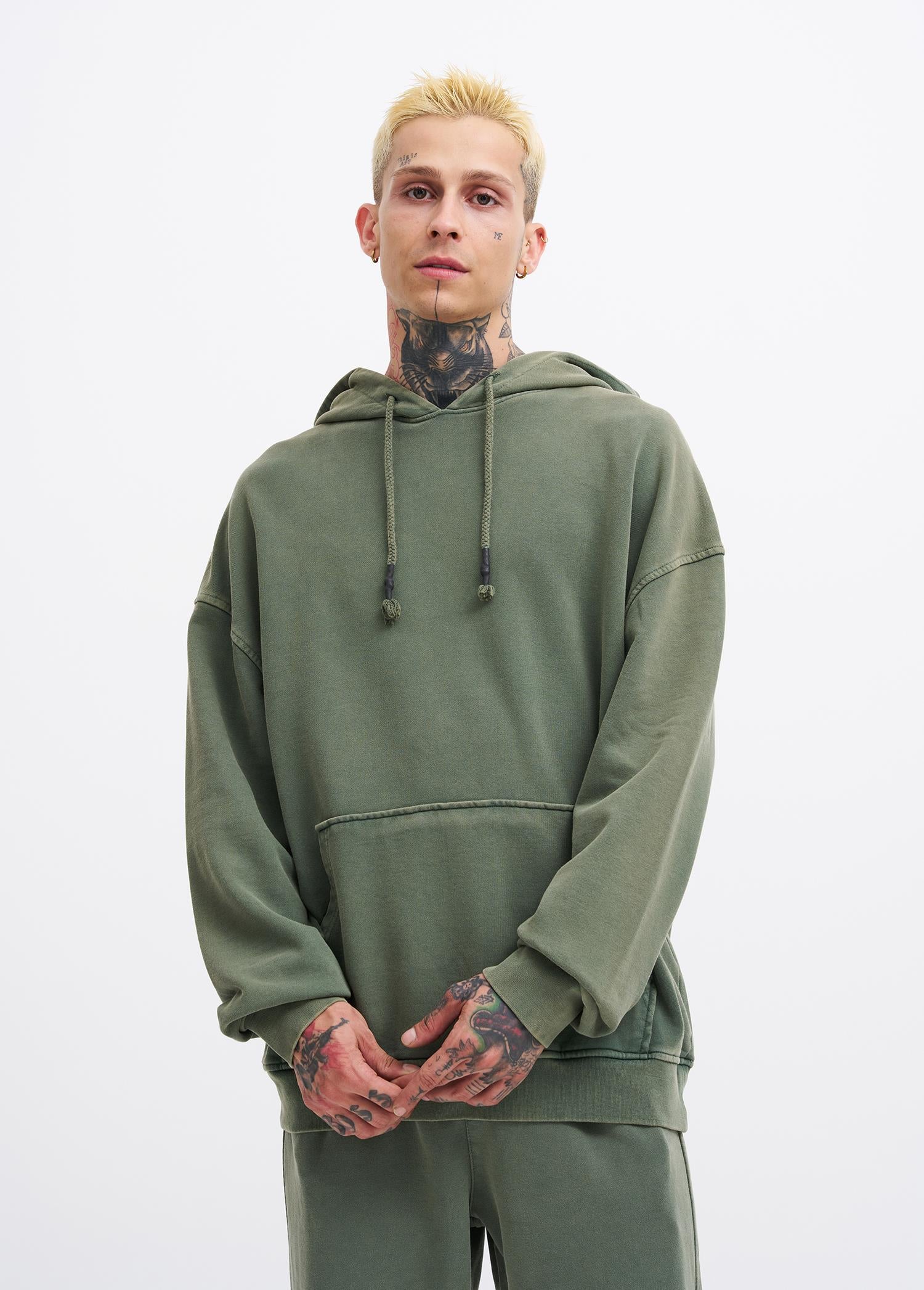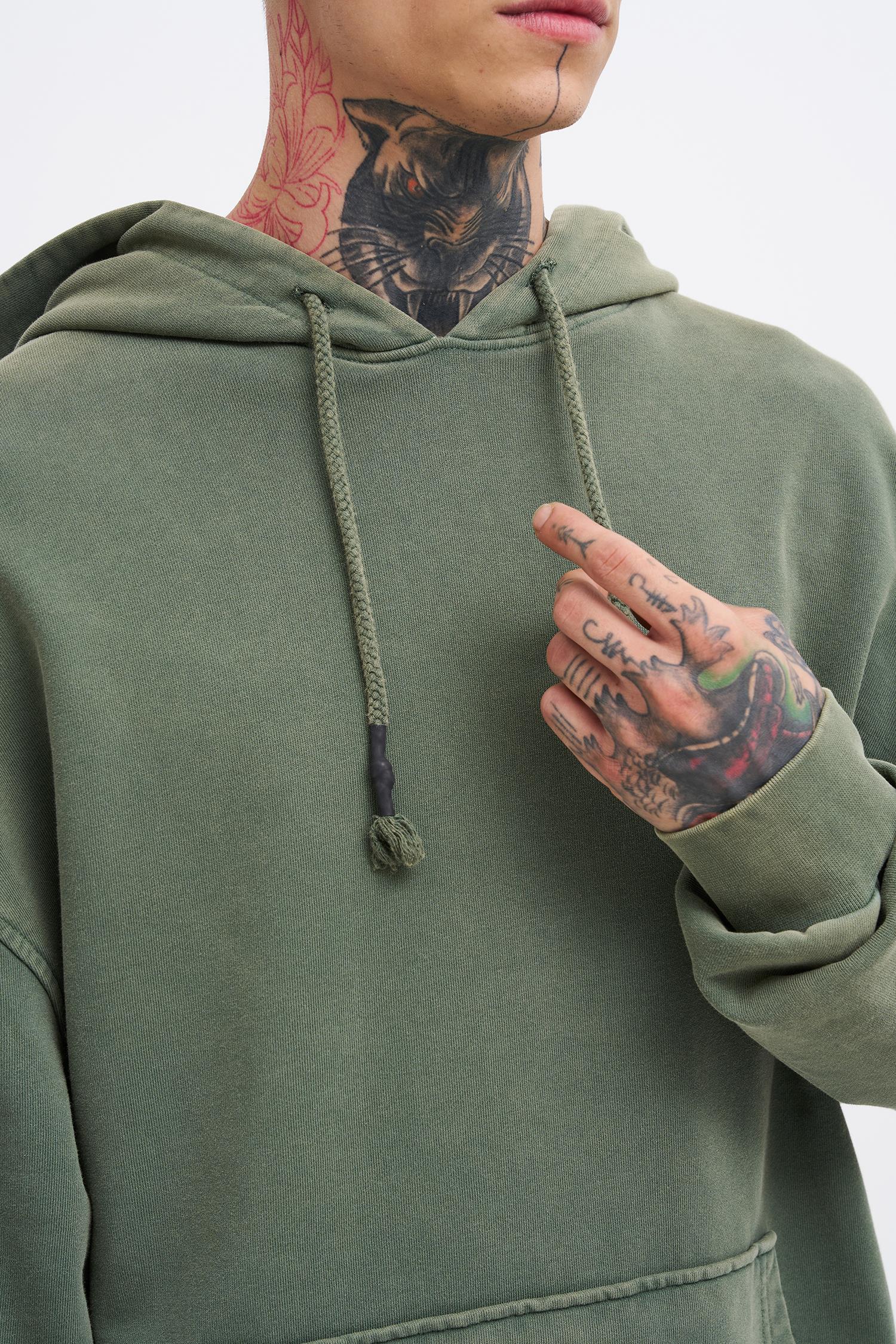 Erkek Yıkamalı Basic Kapüşonlu Oversize Sweatshirt Yağ Yeşili