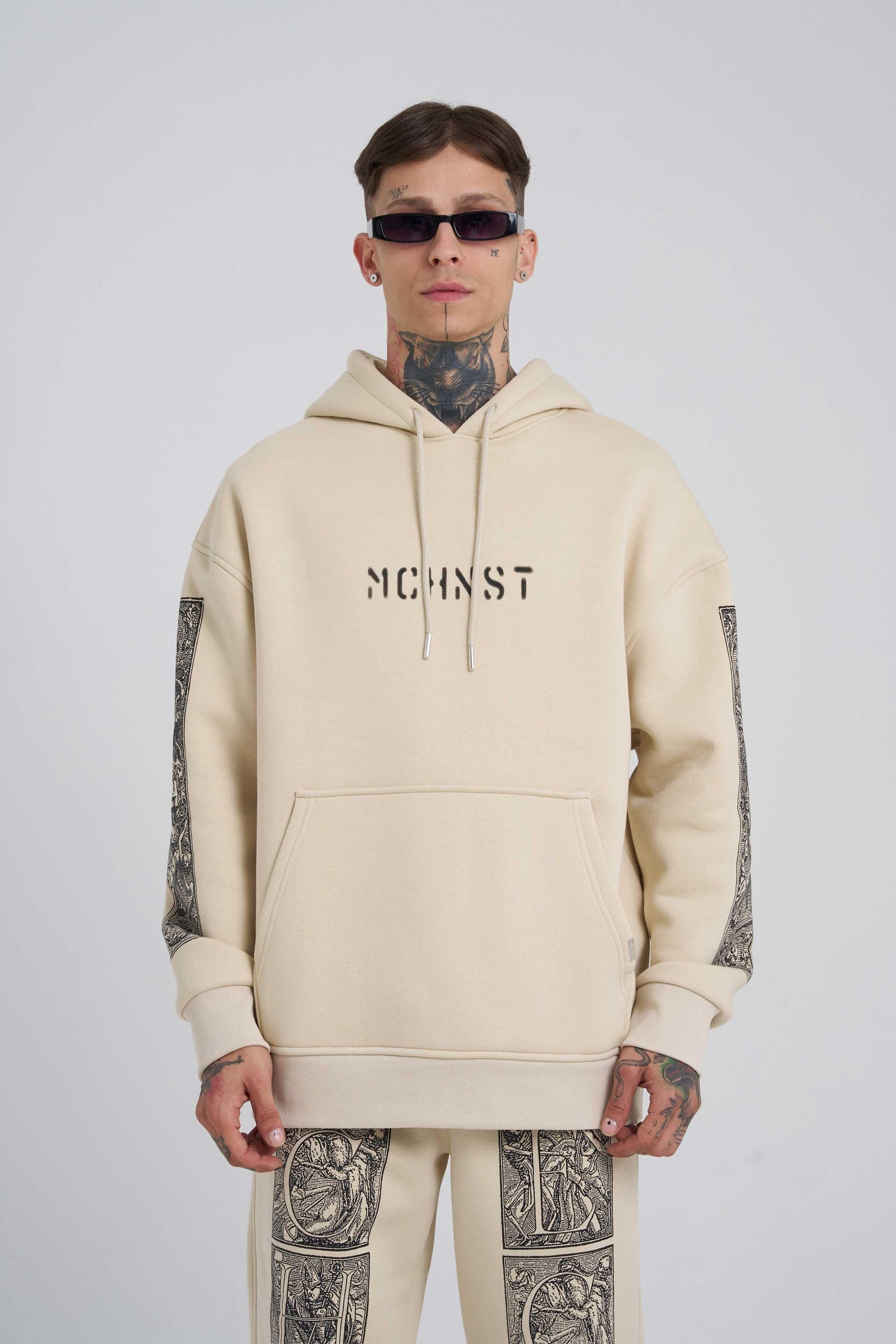 Erkek Nakışlı Kanguru Cepli Oversize Sweatshirt Açık Bej