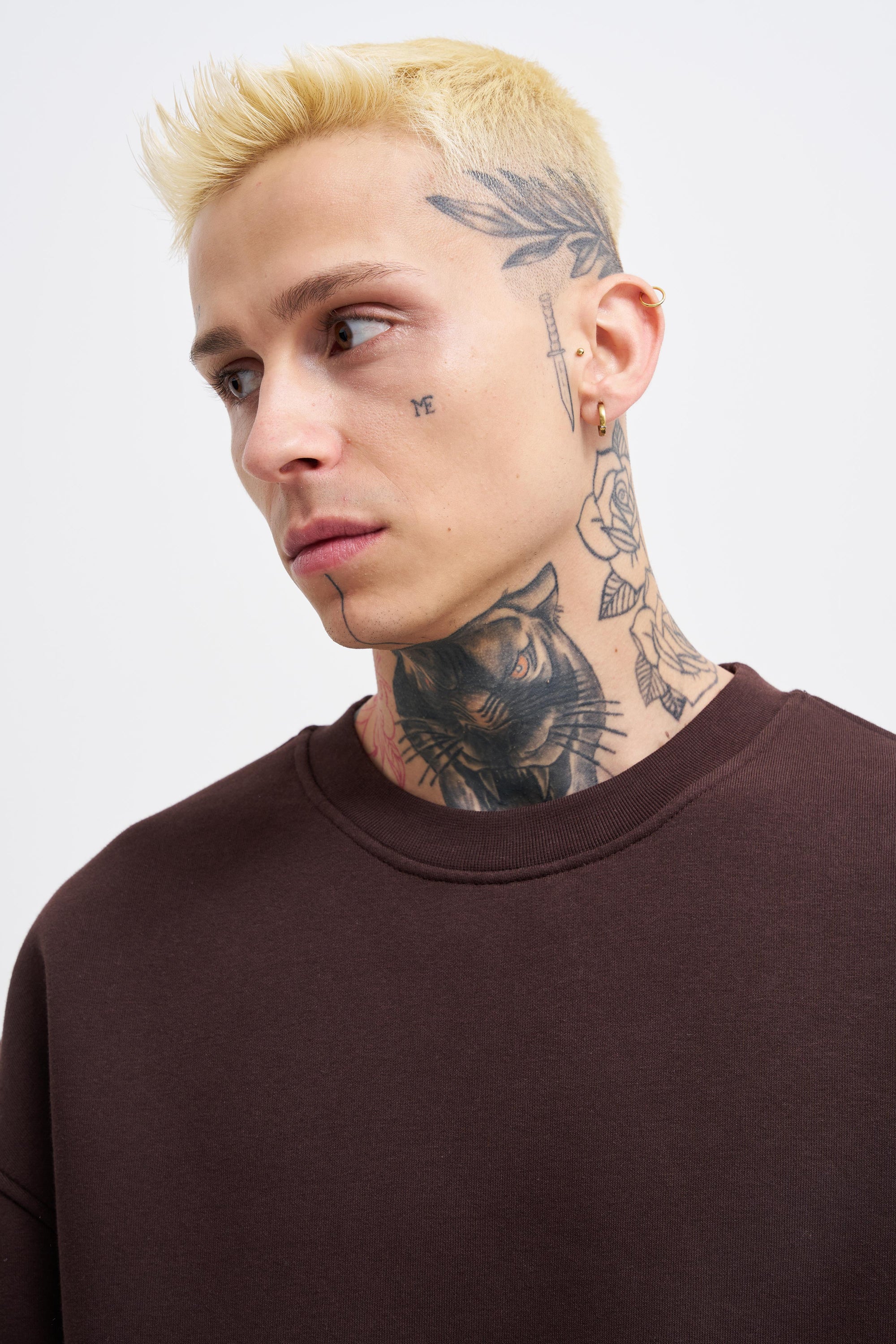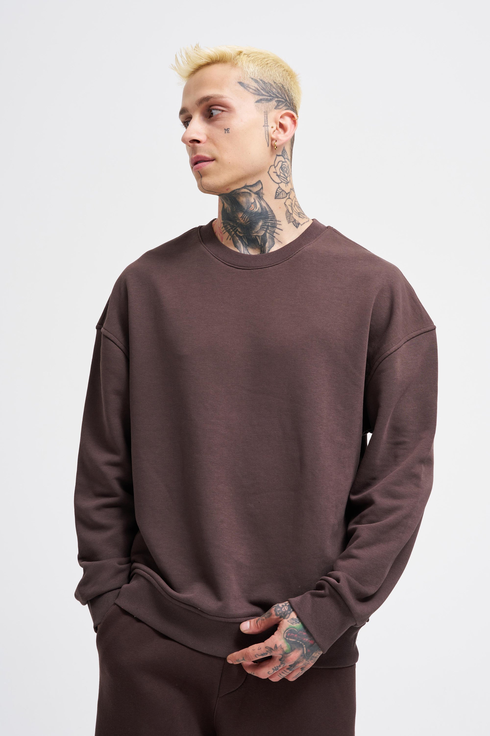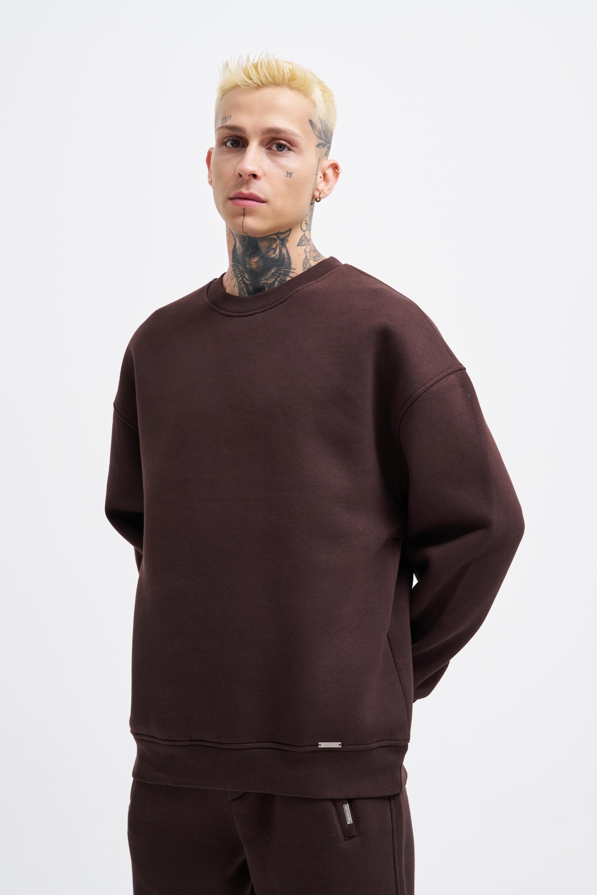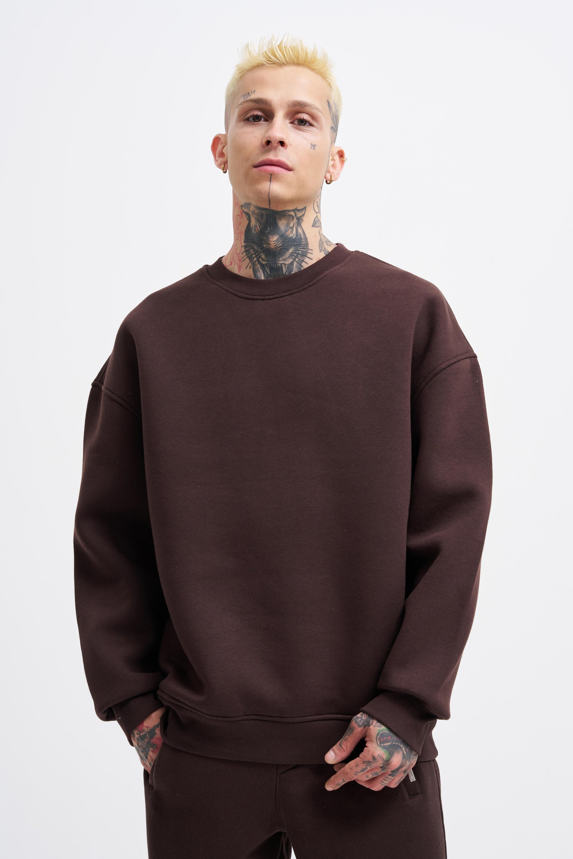 Erkek Basic Bisiklet Yaka Oversize Sweatshirt Koyu Kahverengi