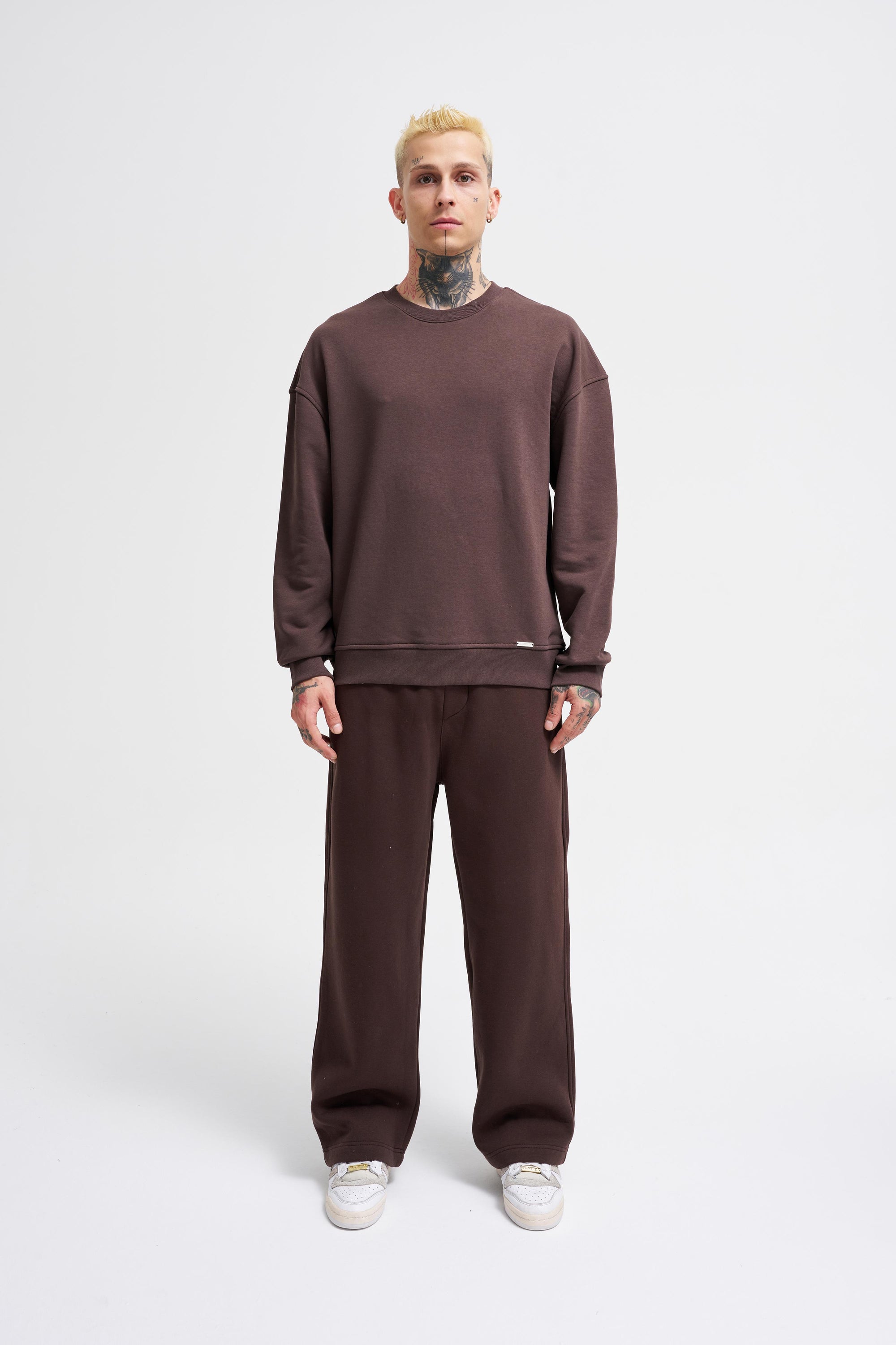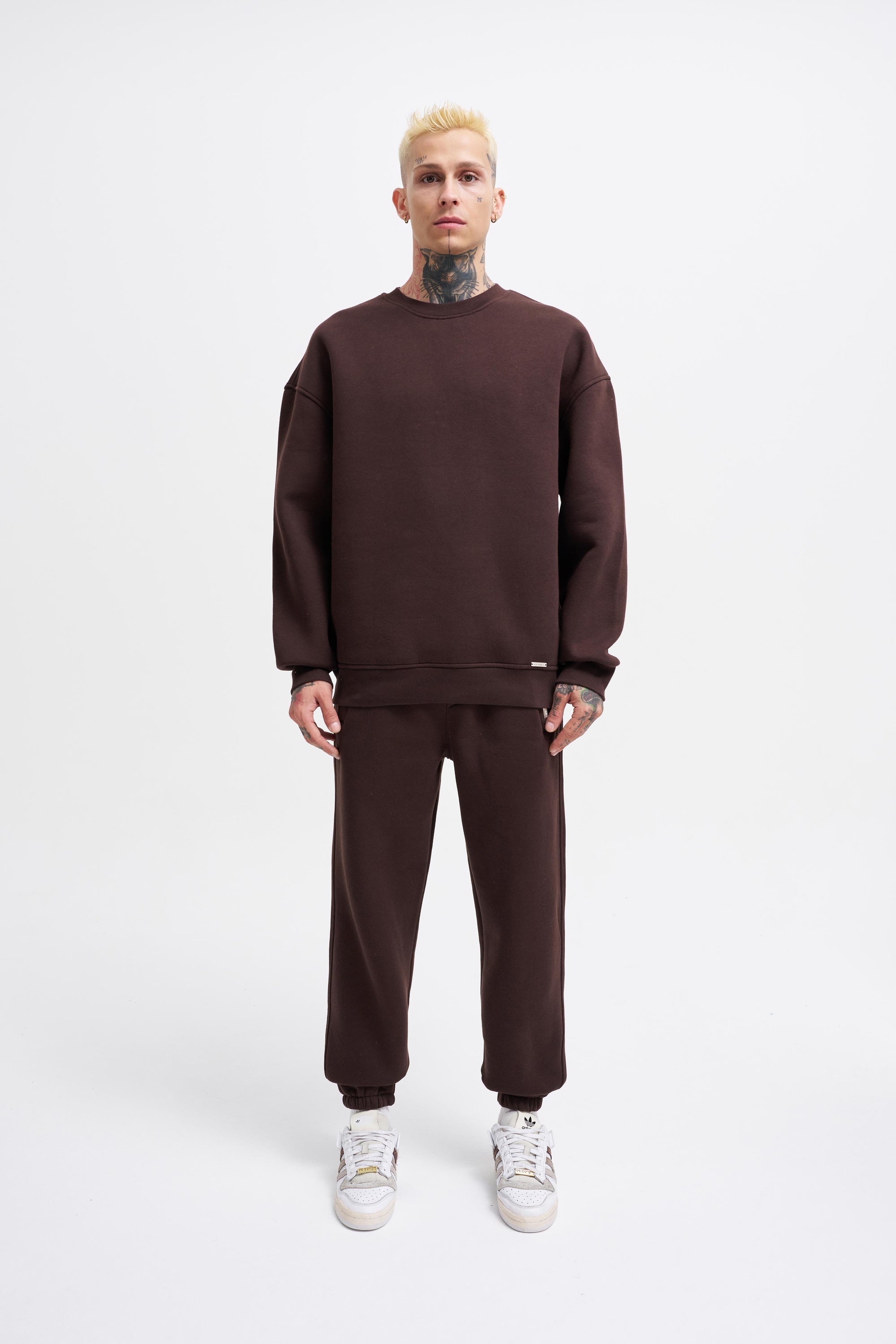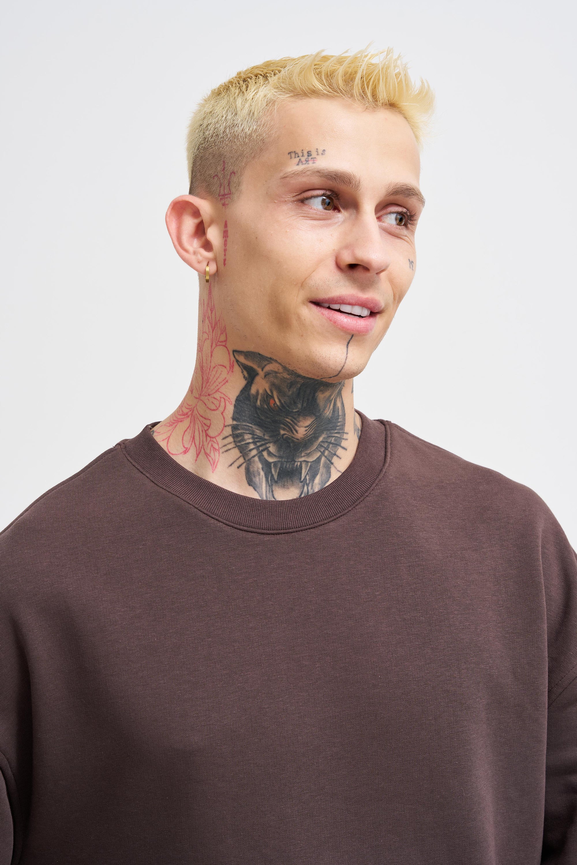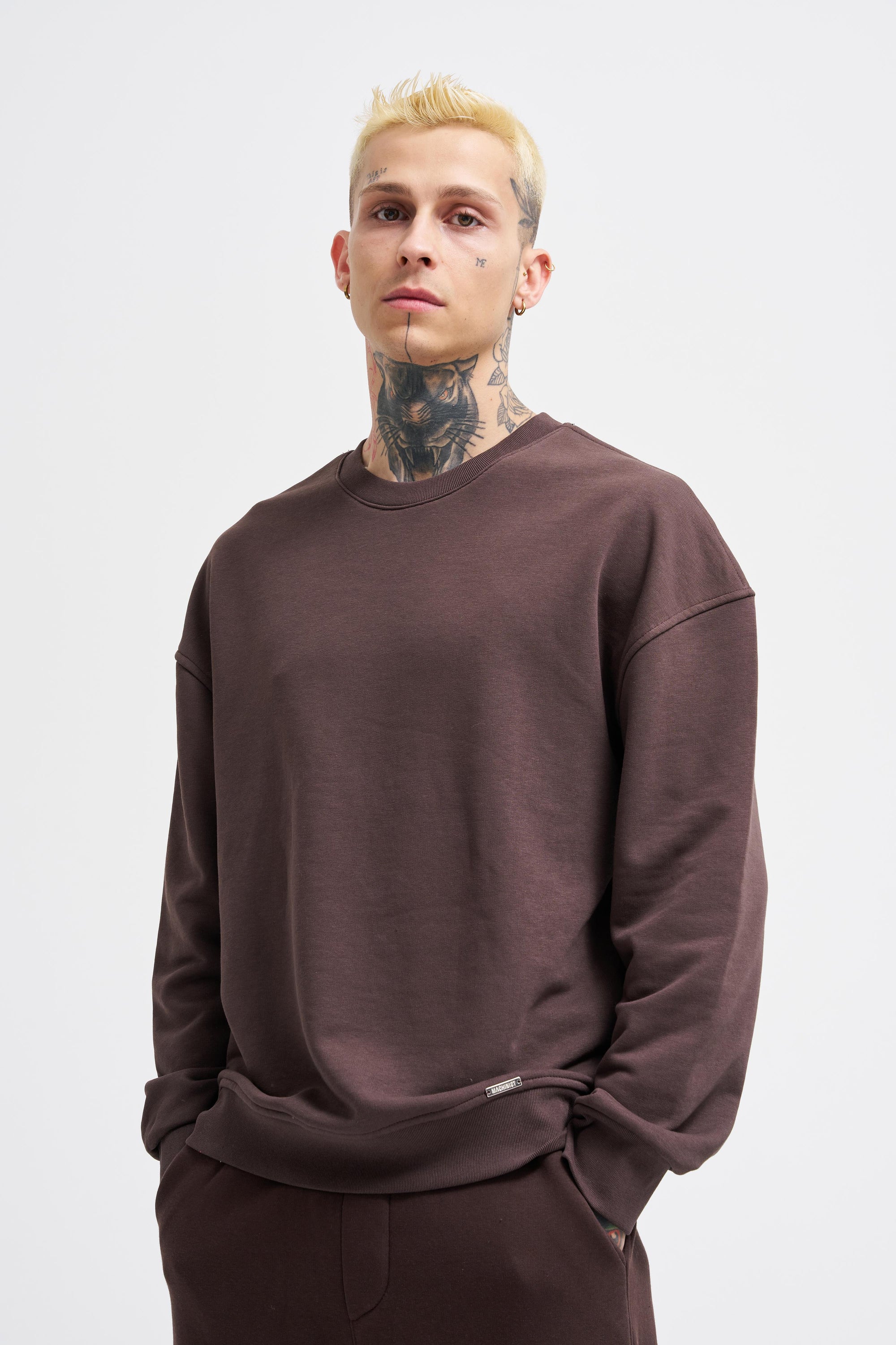 Erkek Basic Bisiklet Yaka Oversize Sweatshirt Koyu Kahverengi