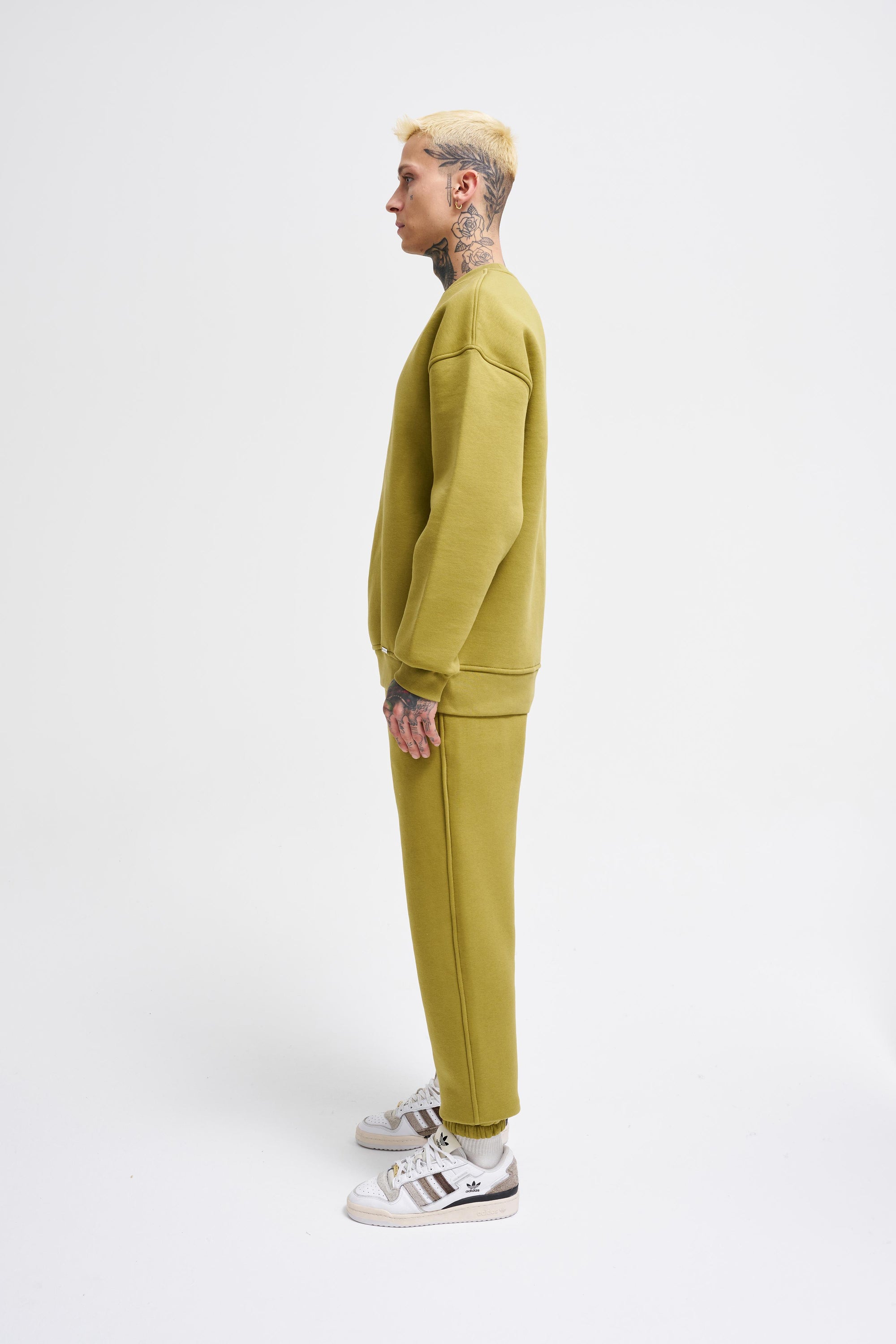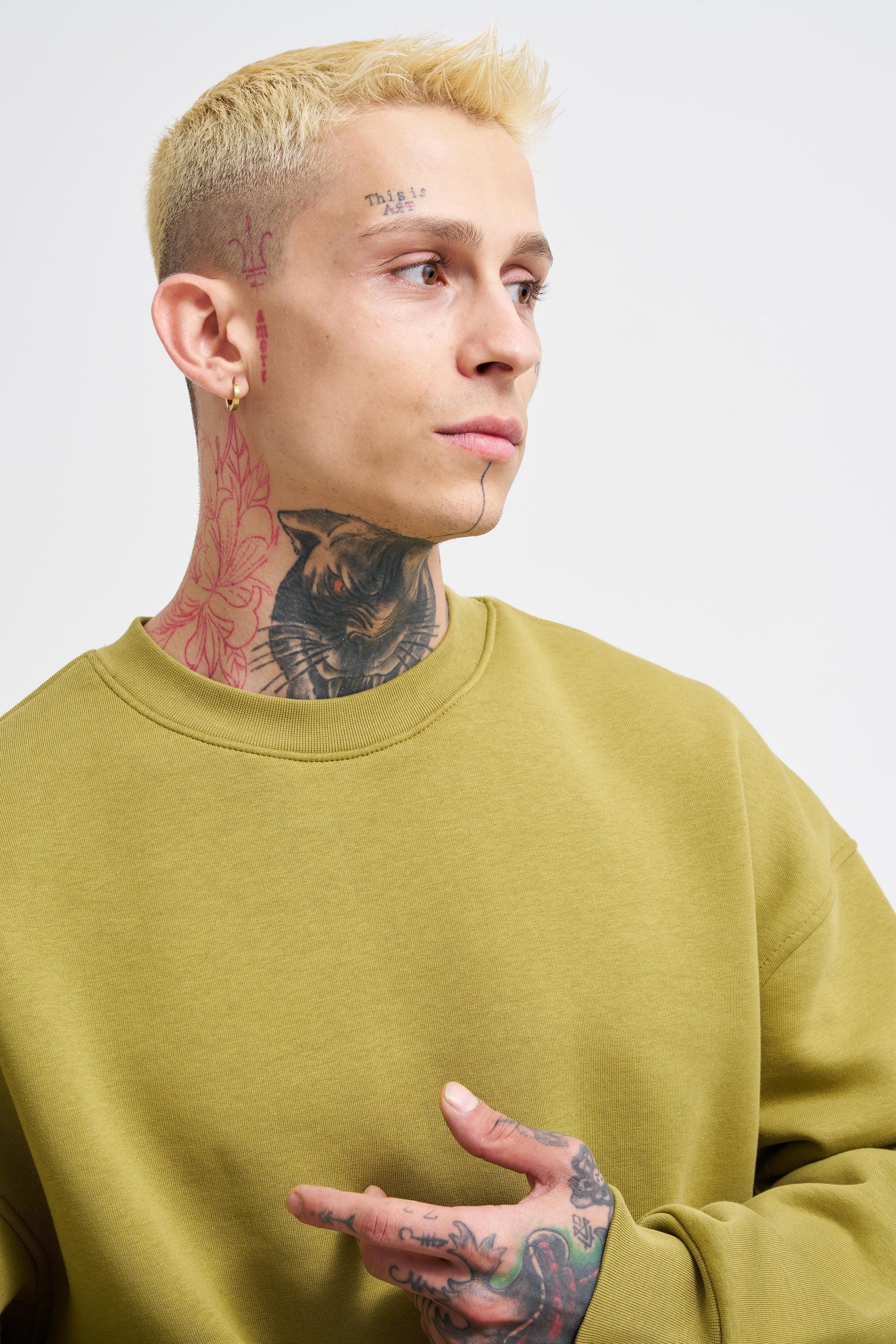 Erkek Basic Bisiklet Yaka Oversize Sweatshirt Yağ Yeşili