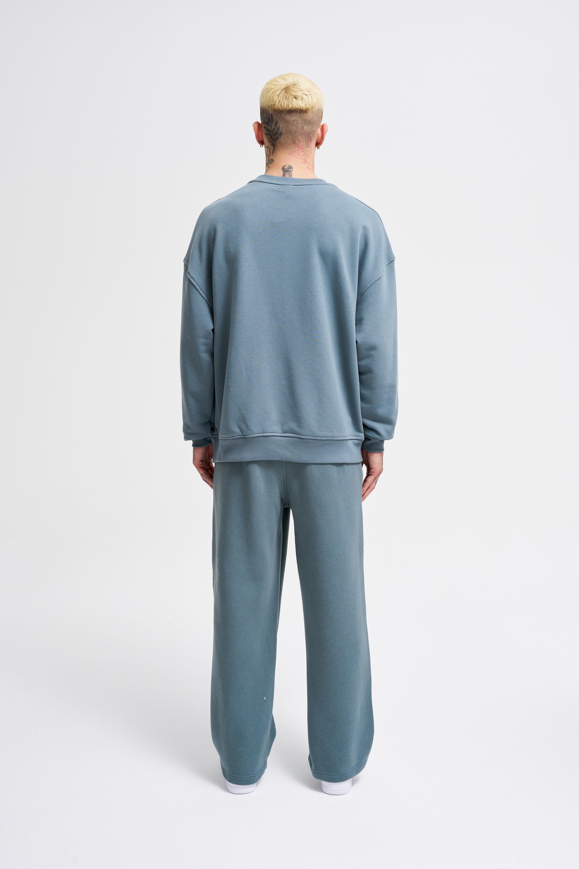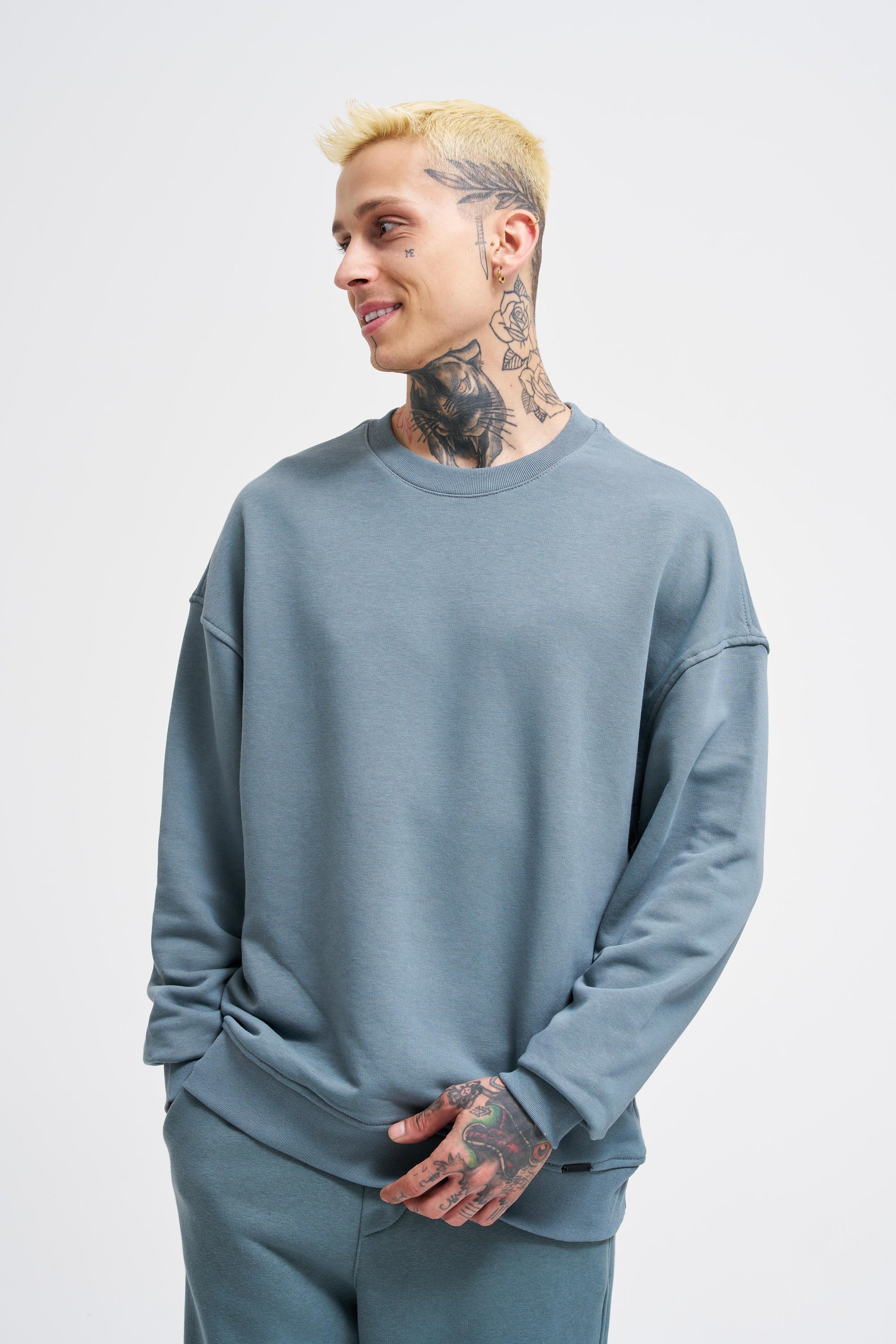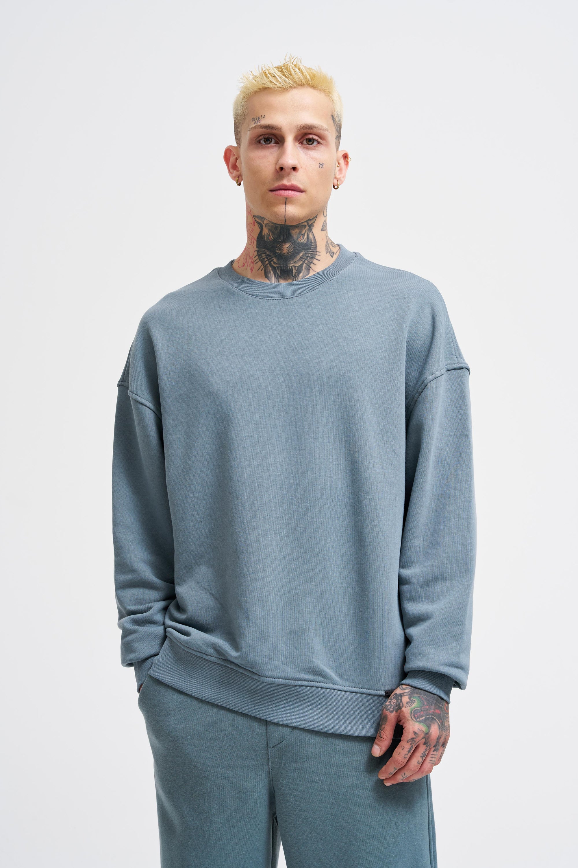 Erkek Basic Bisiklet Yaka Oversize Sweatshirt Mavi Duman