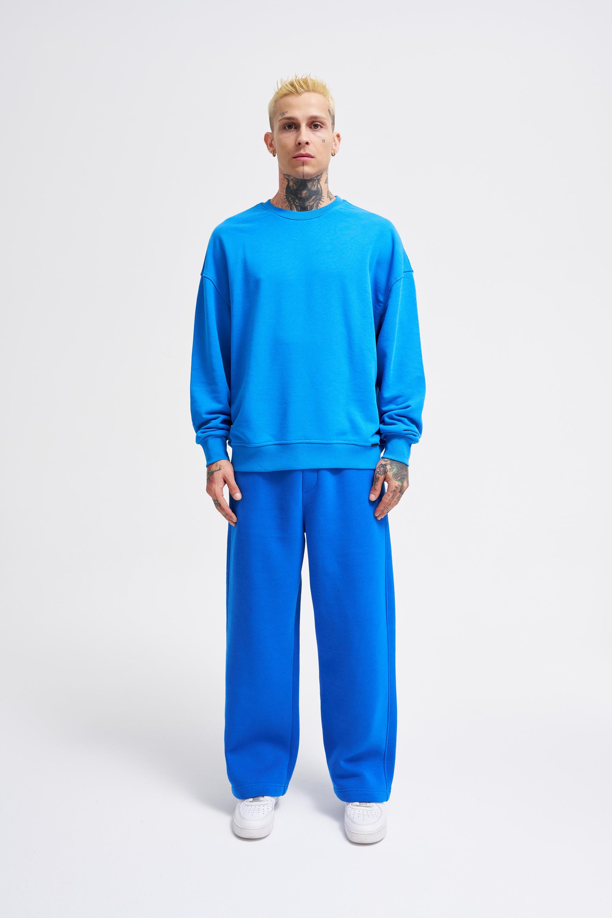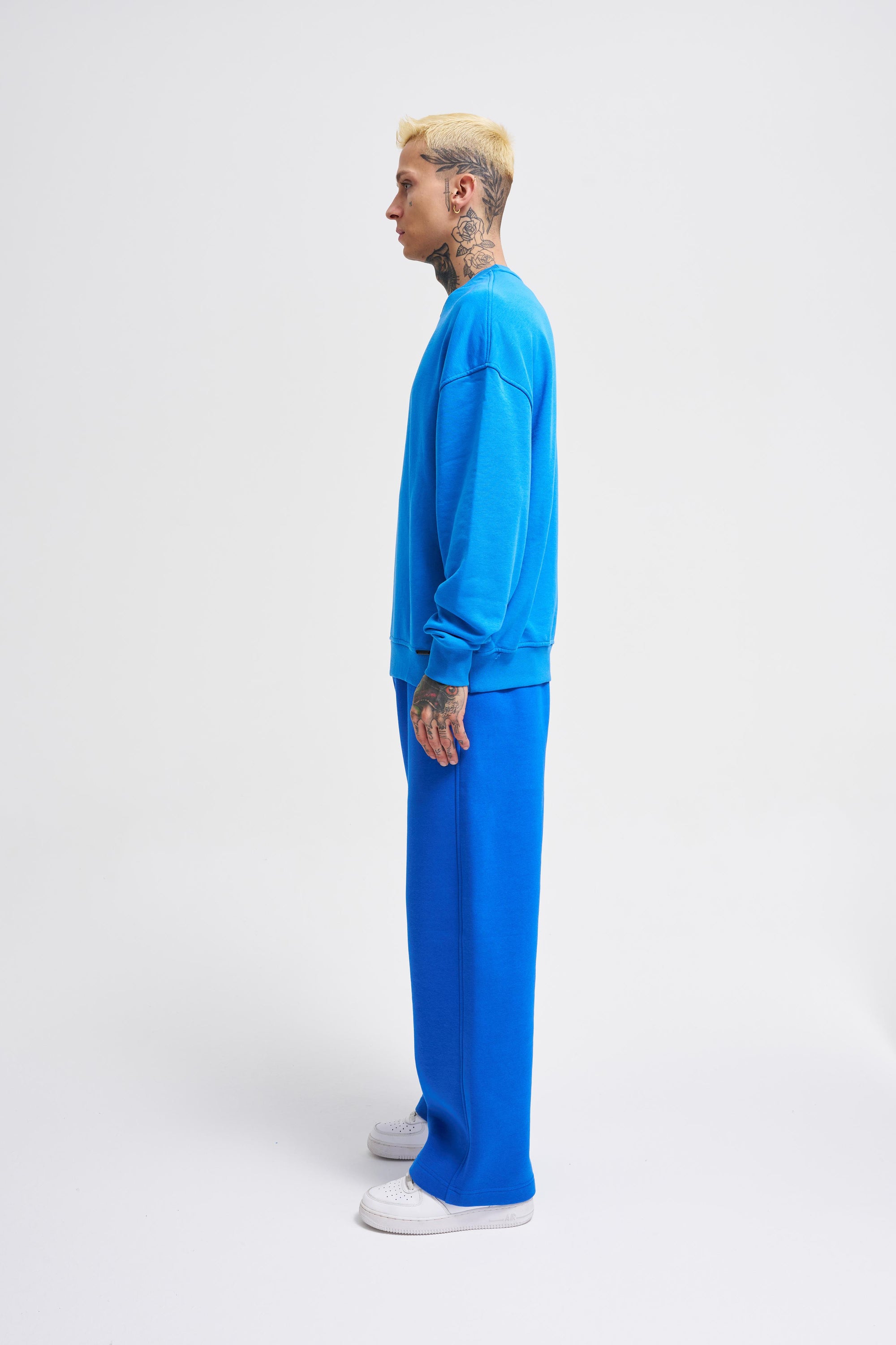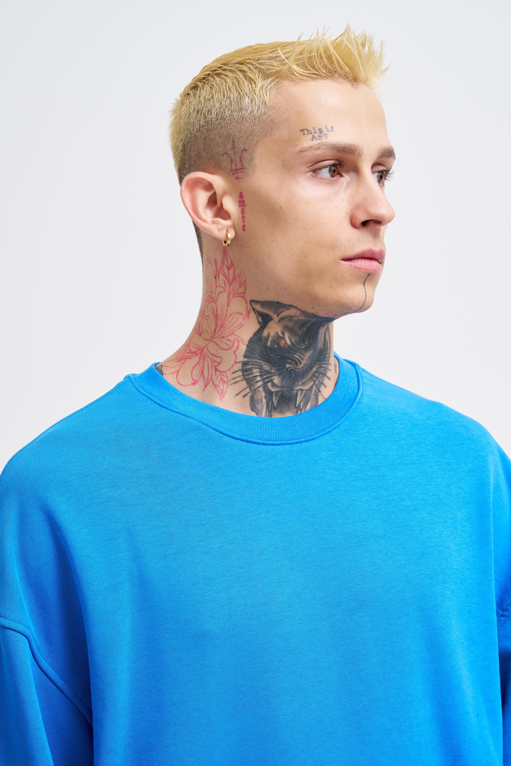 Erkek Basic Bisiklet Yaka Oversize Sweatshirt Saks Mavi