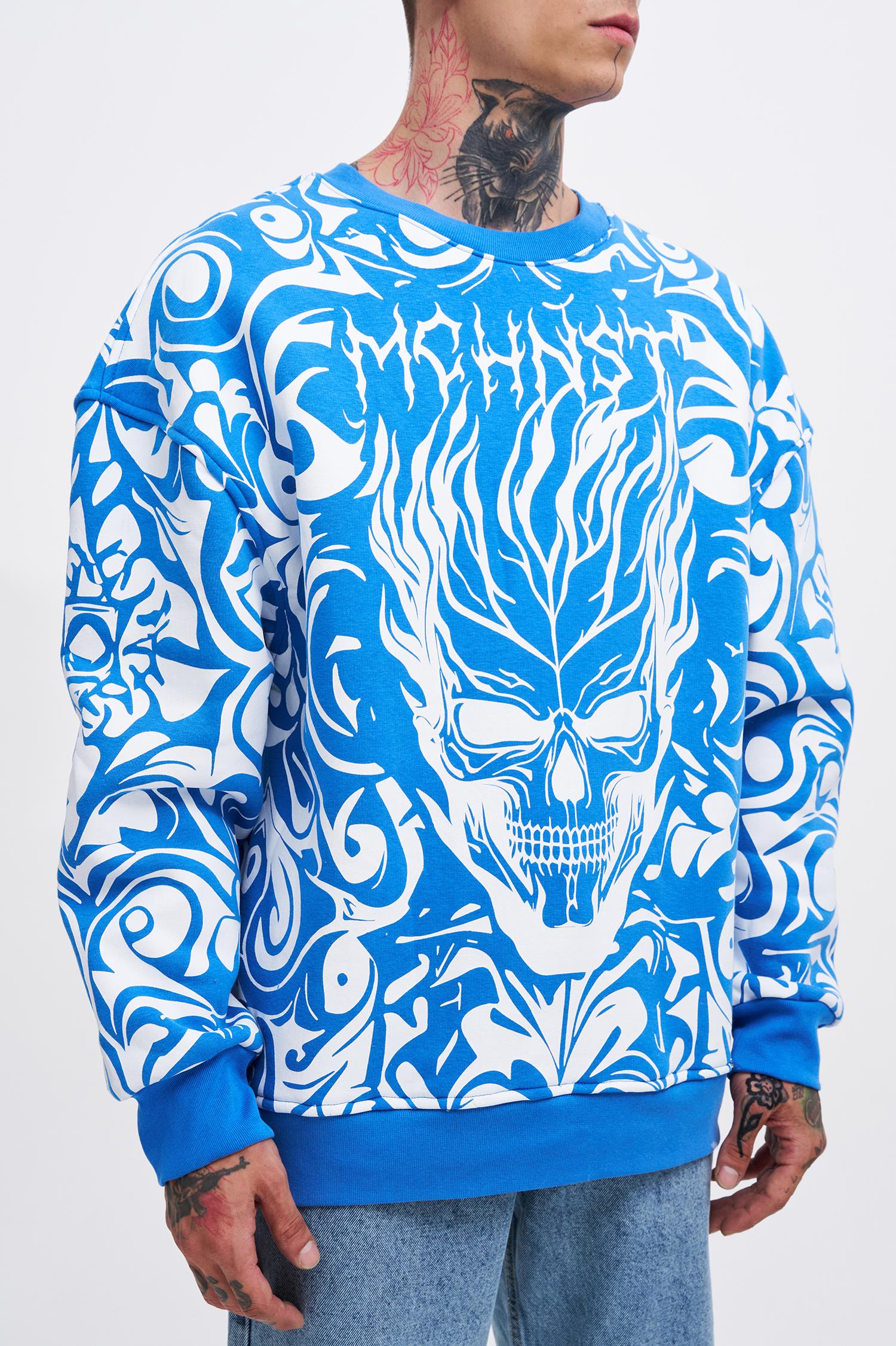 Erkek Skull Baskılı Oversize Sweatshirt Saks Mavi