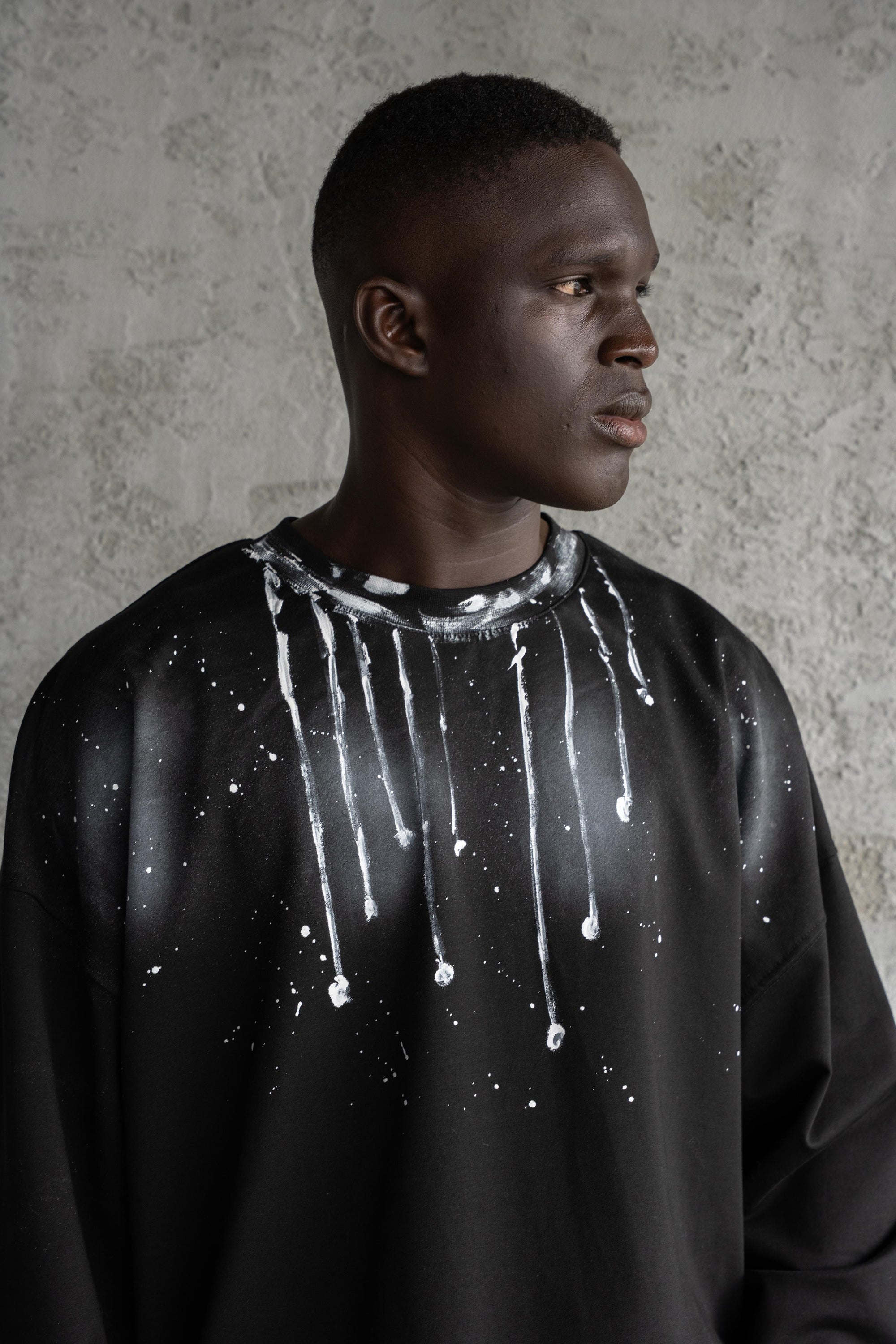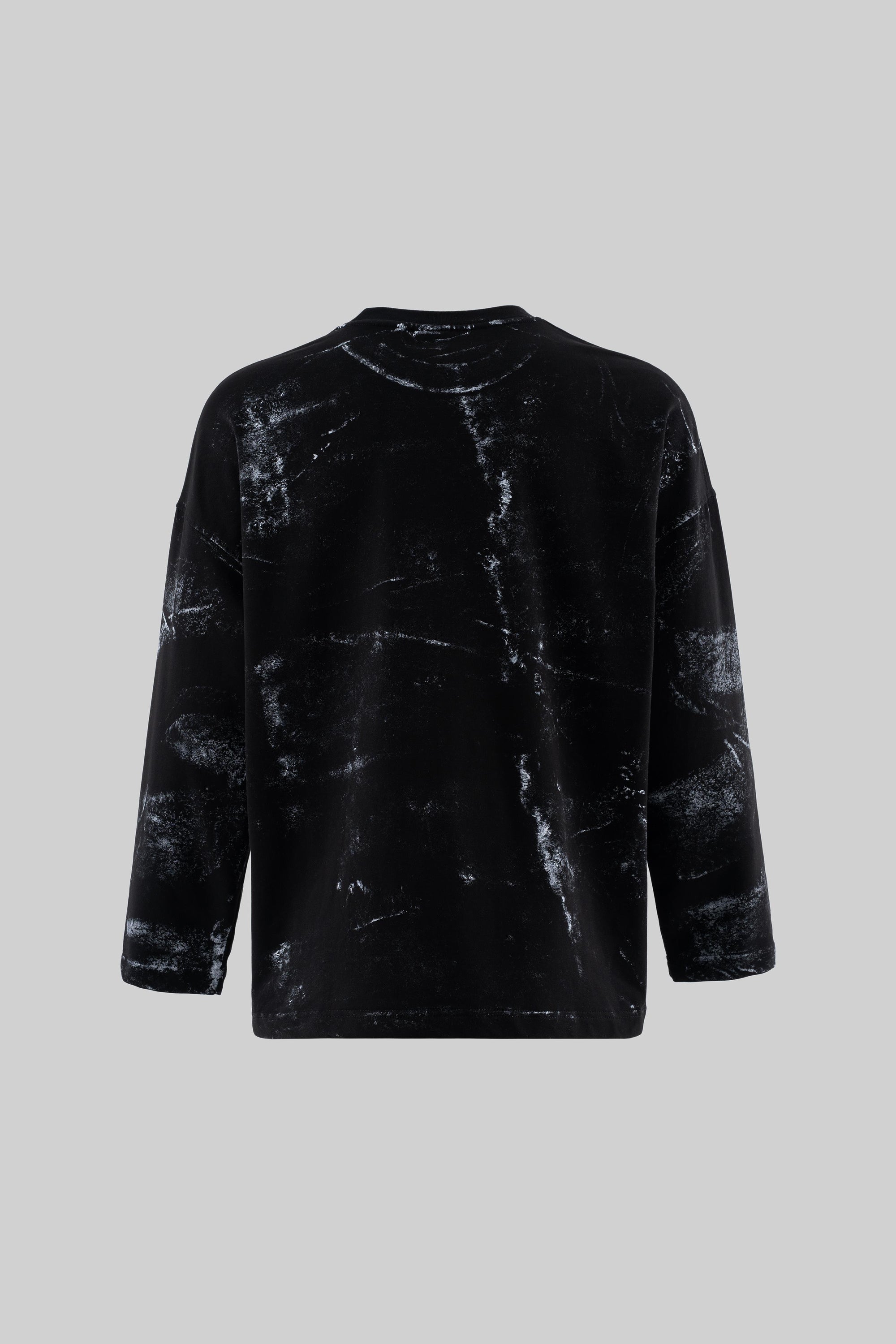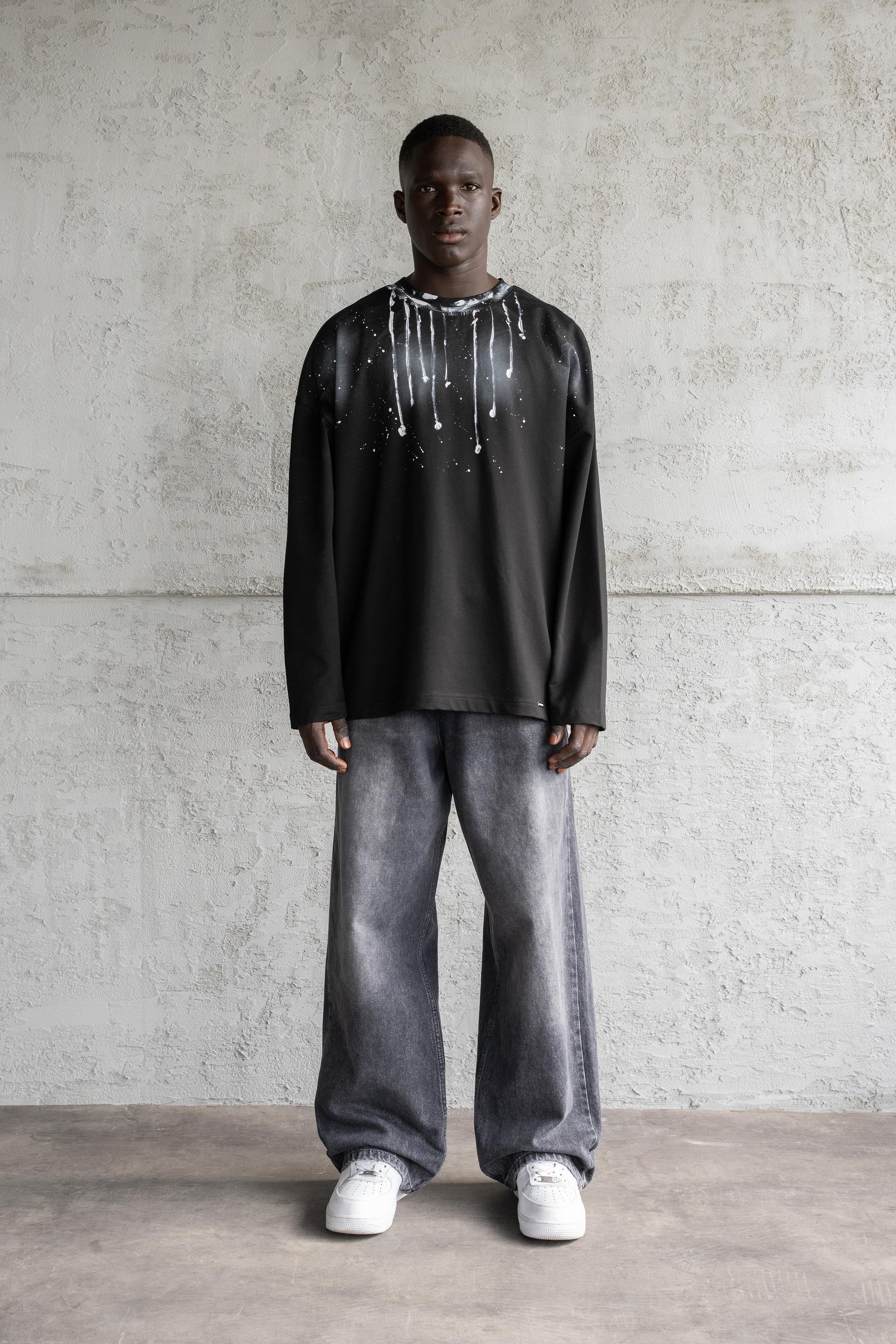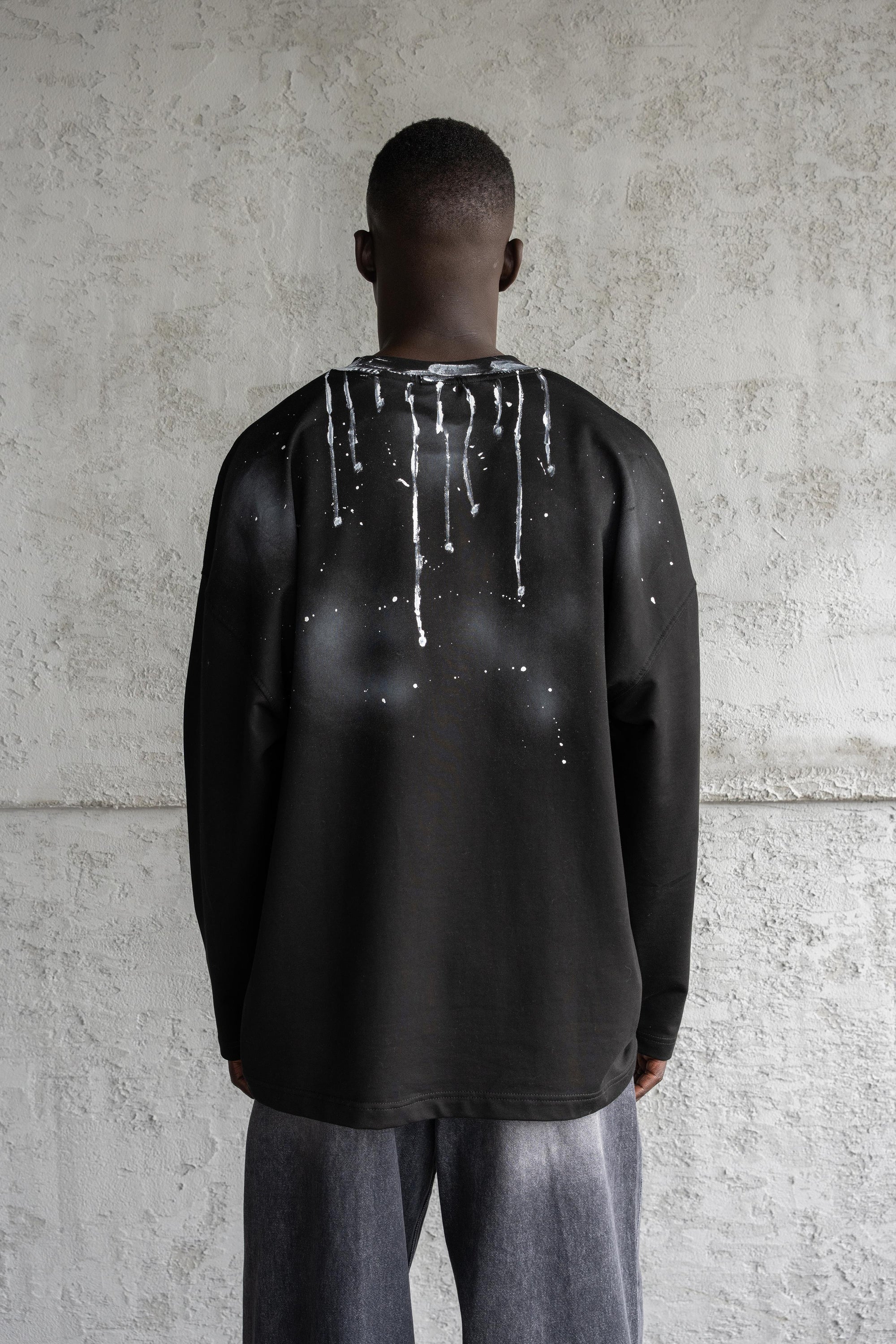 Erkek Hand Made Boya Baskılı Oversize Uzun Kollu Tişört Siyah