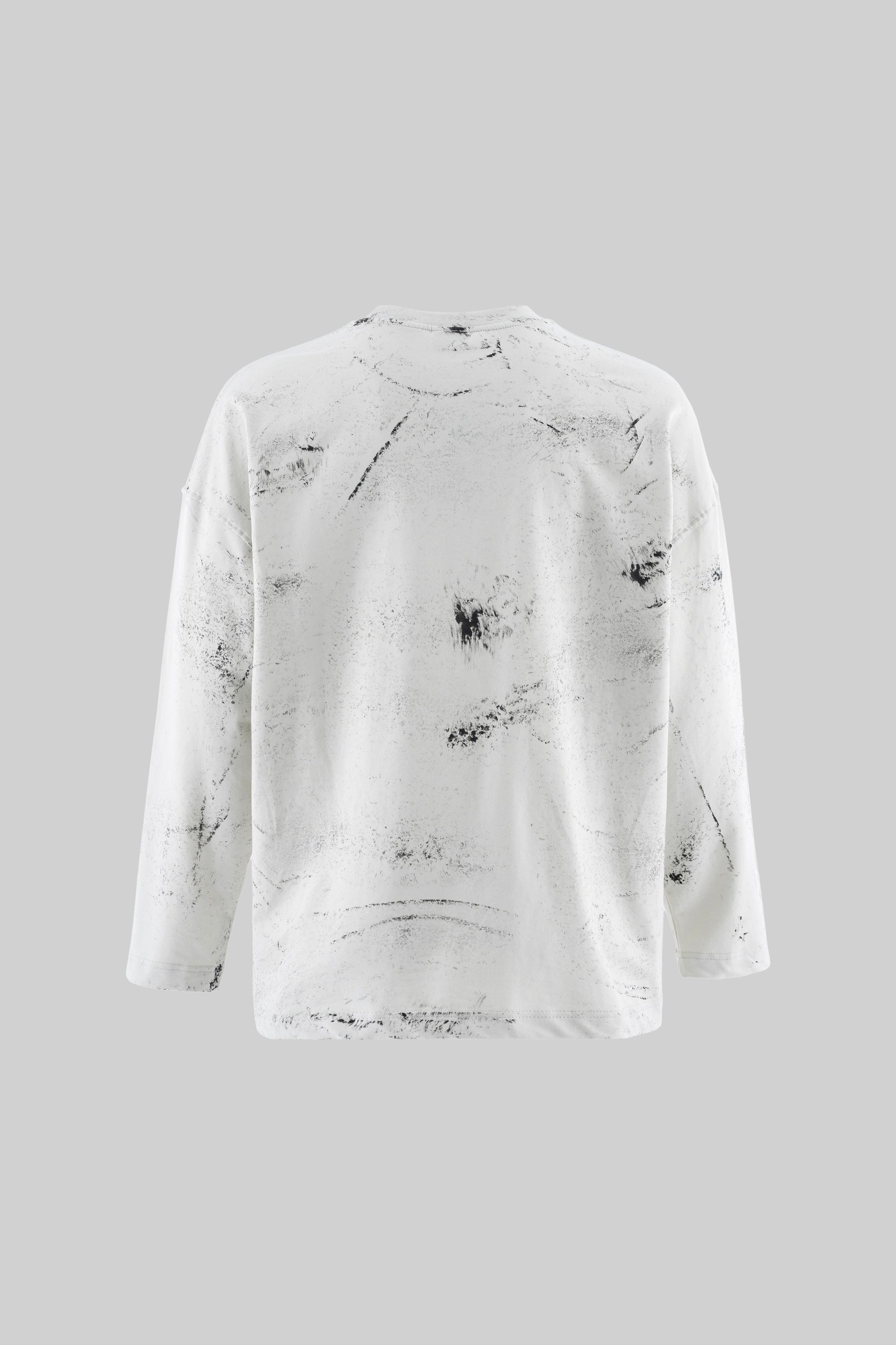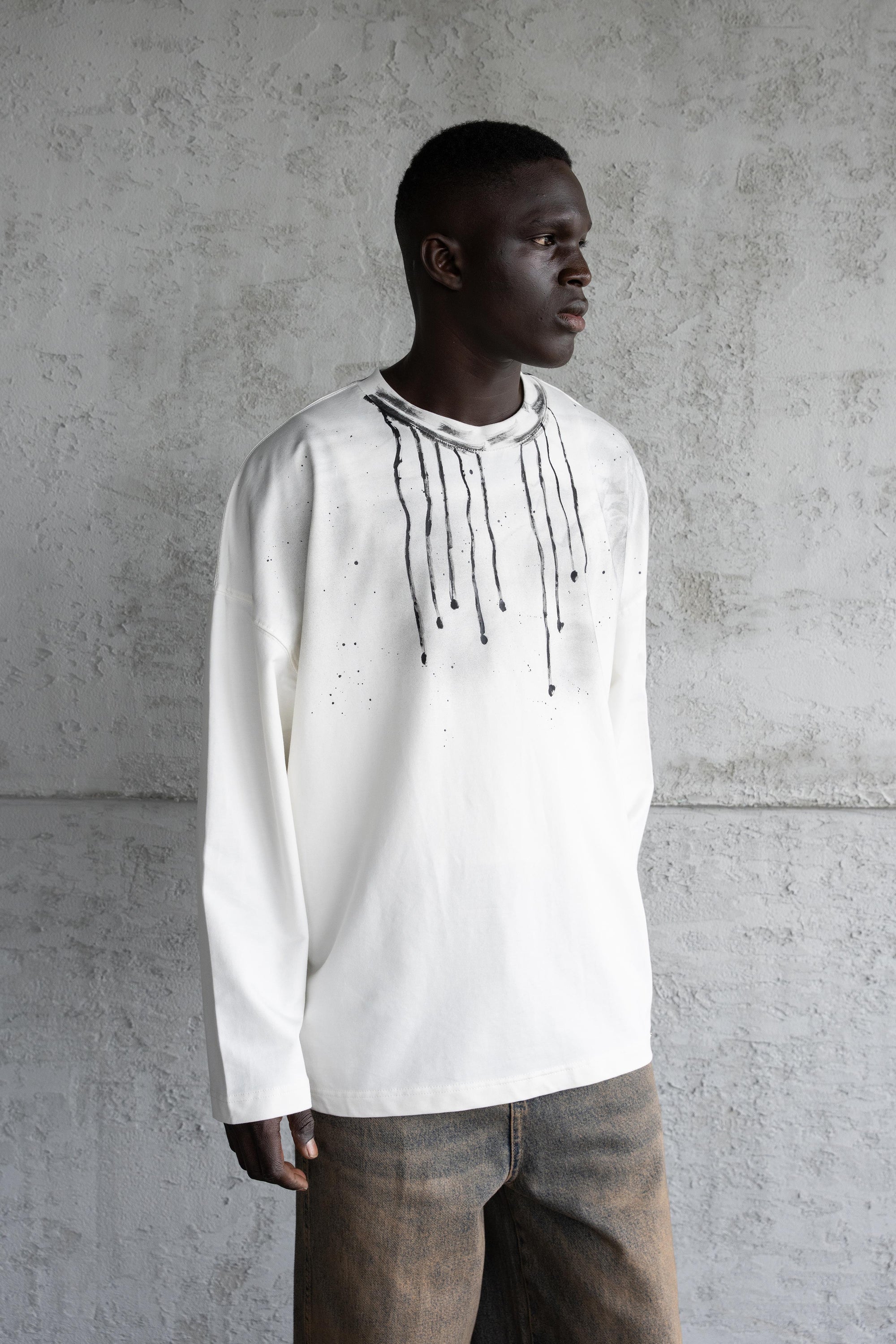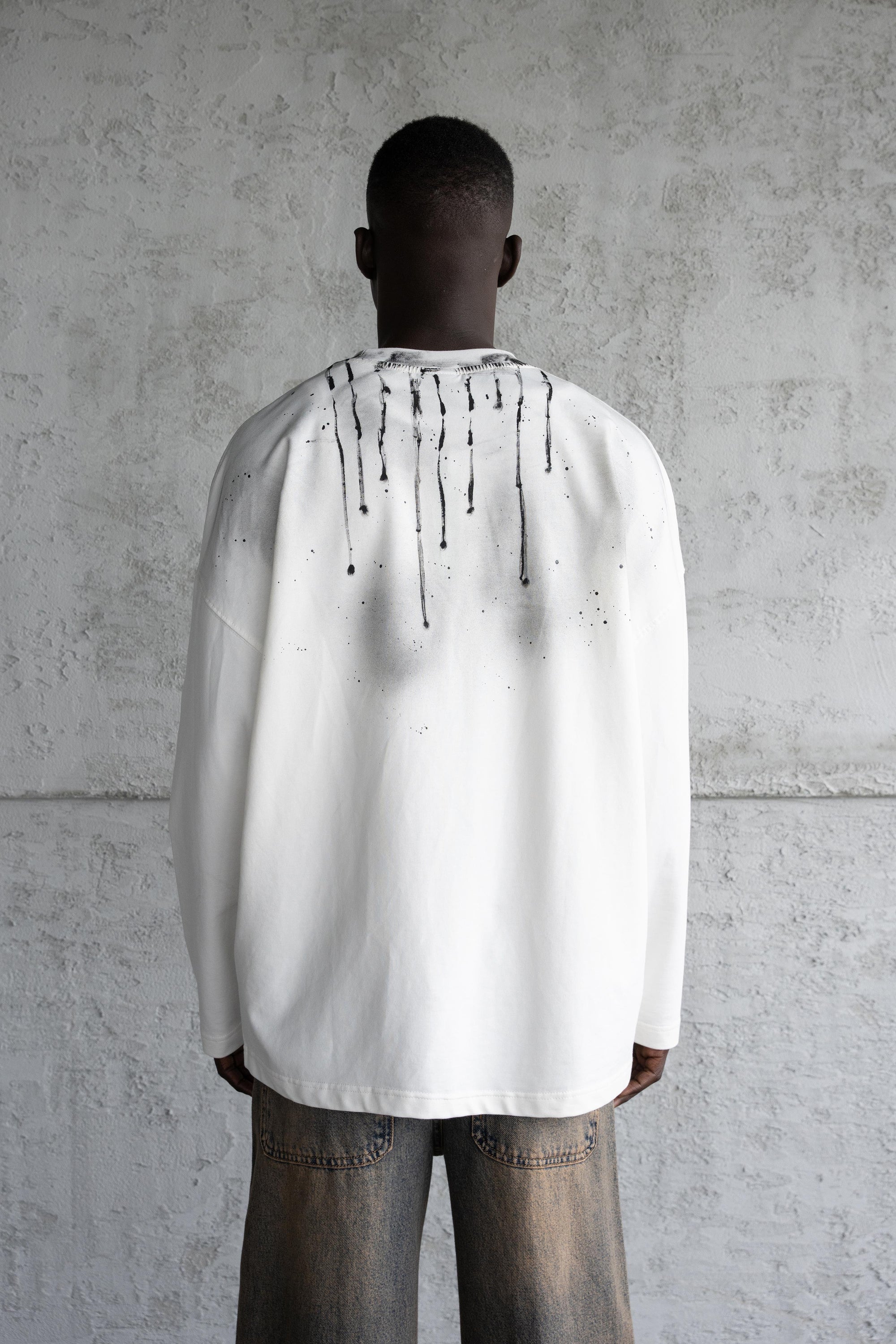 Erkek Hand Made Boya Baskılı Oversize Uzun Kollu Tişört Ekru