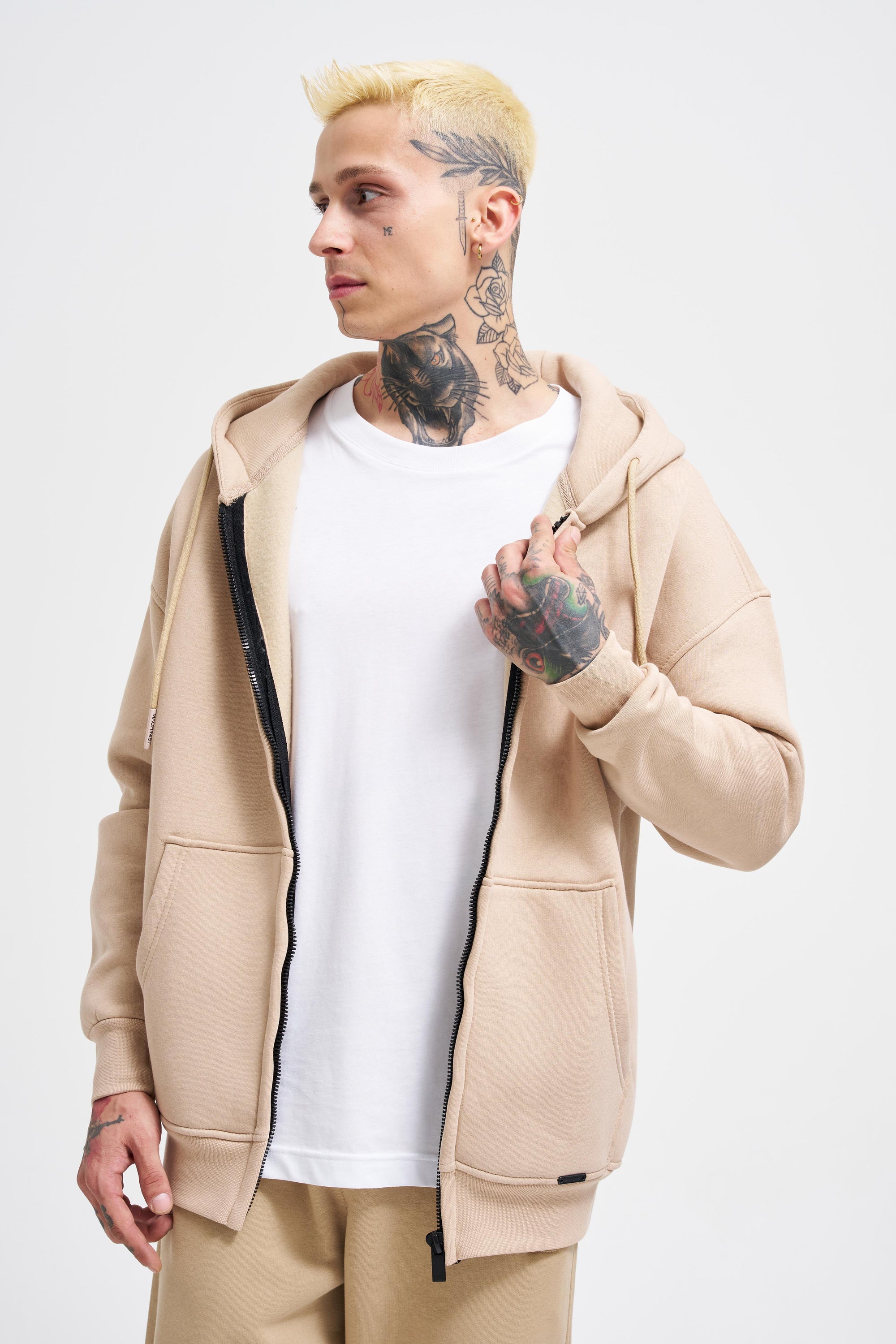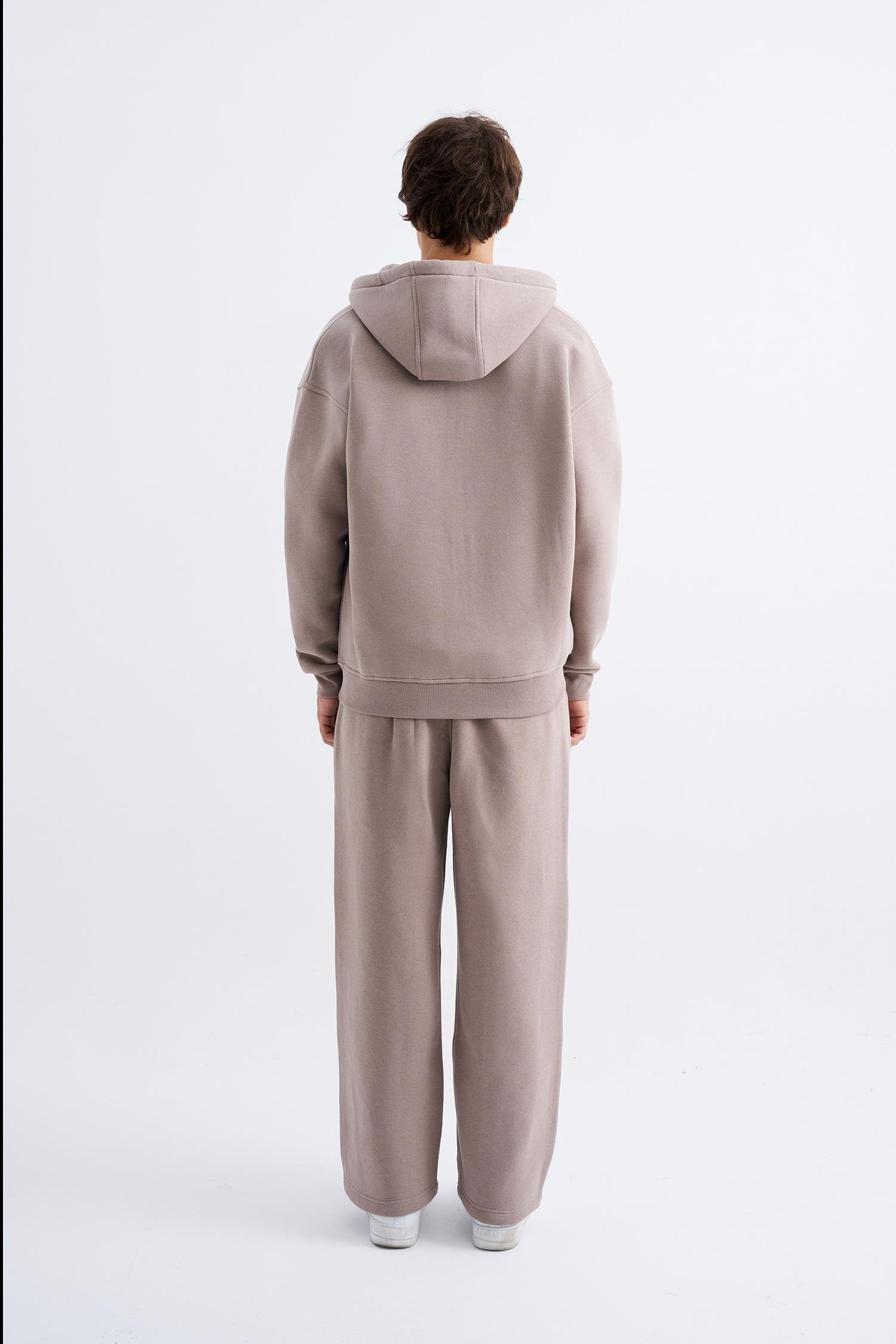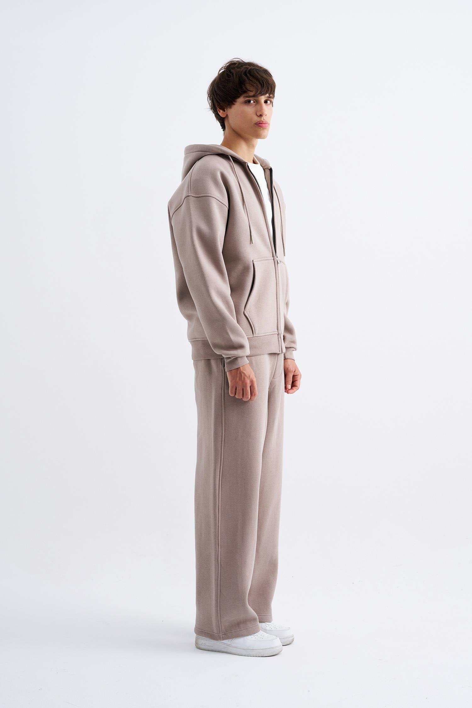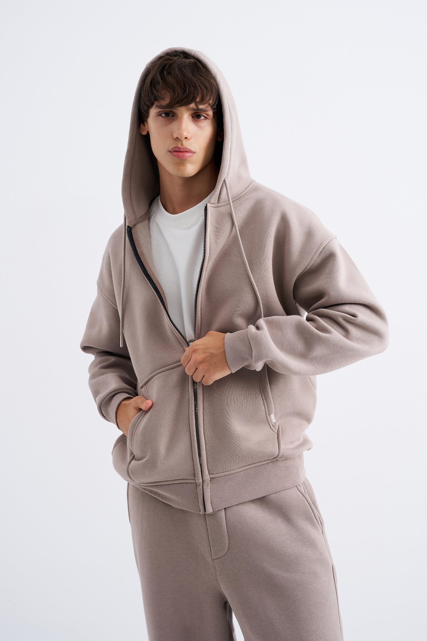 Erkek Oversize Fermuarlı Cepli Kapüşonlu Basic Sweatshirt Bej