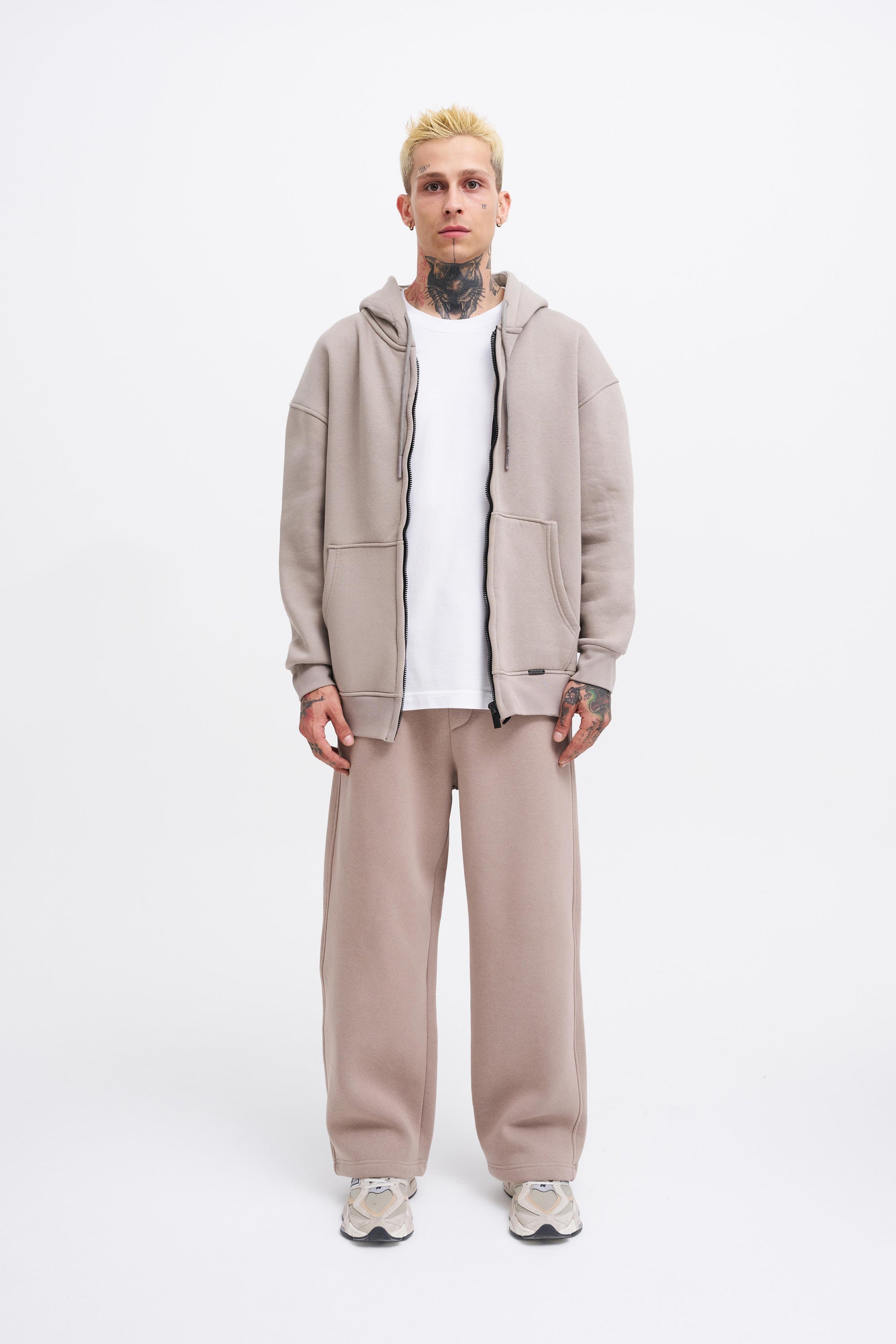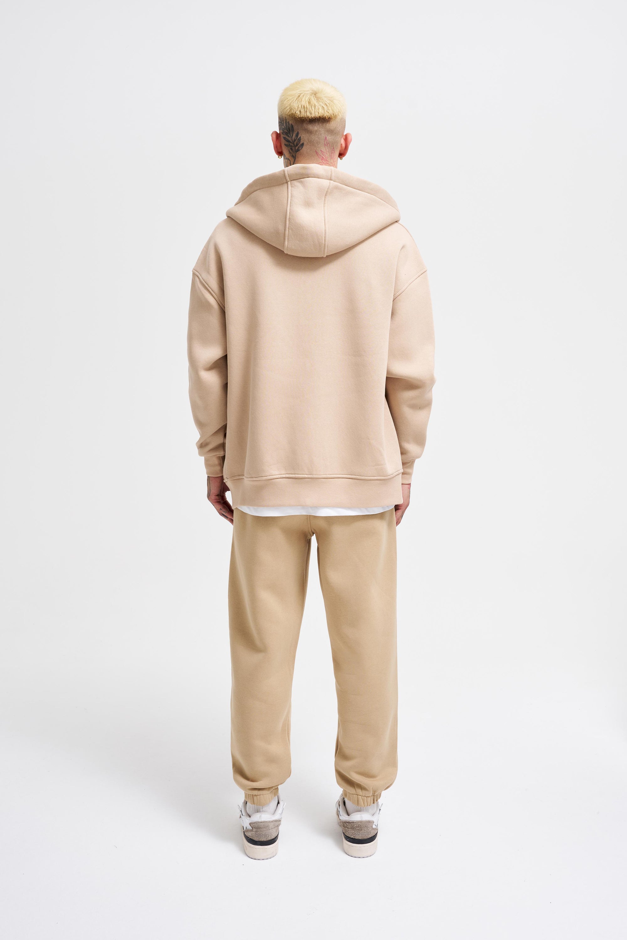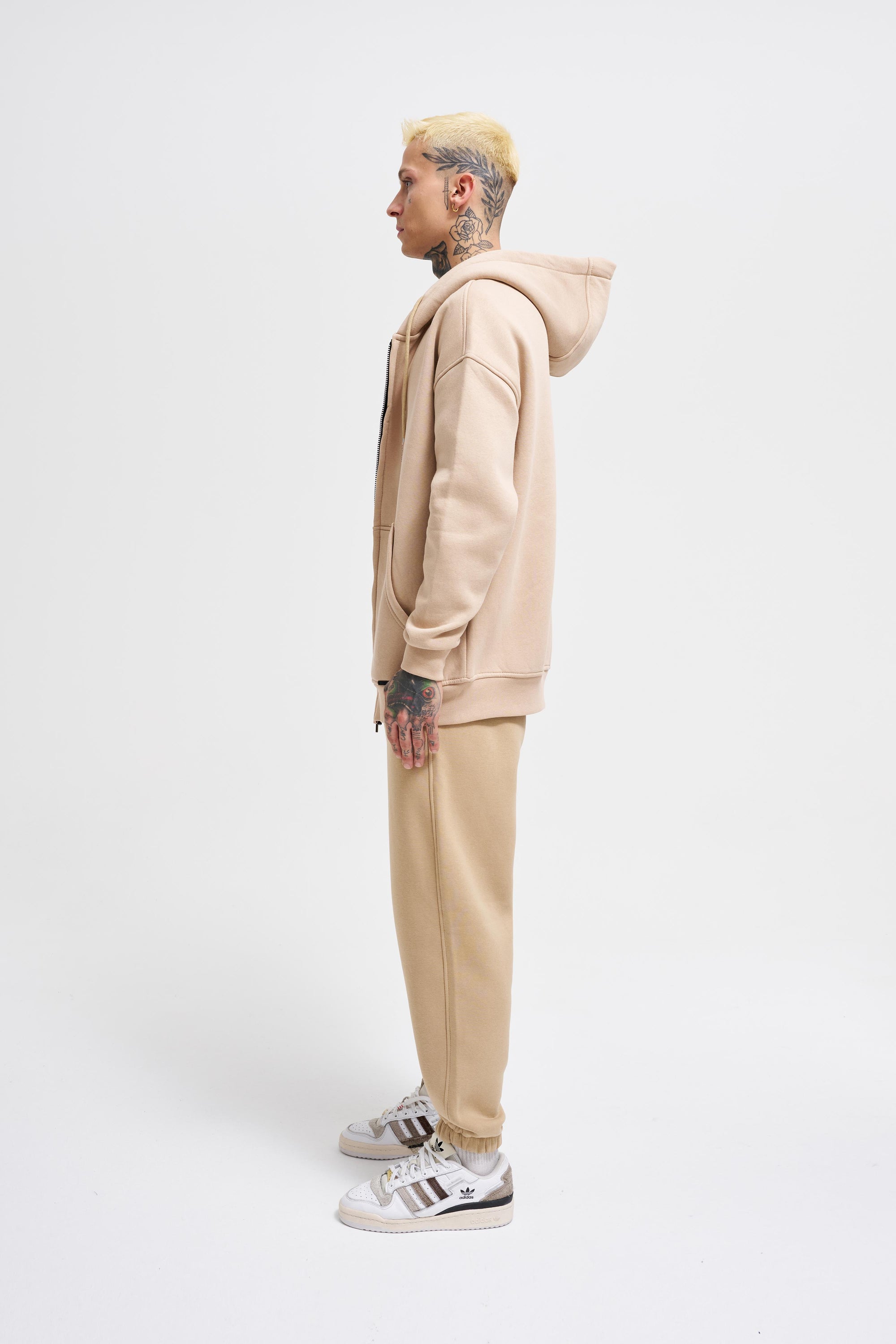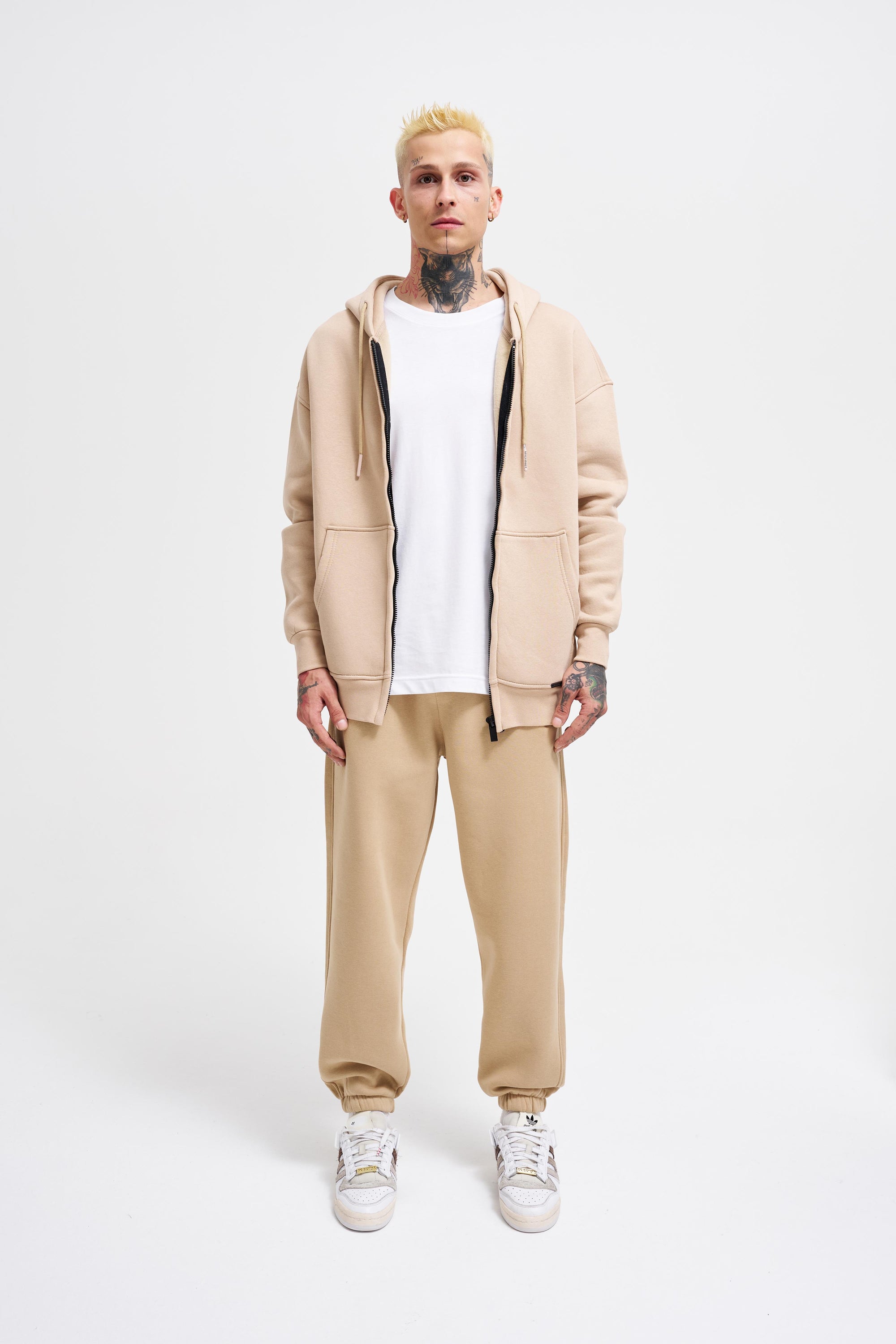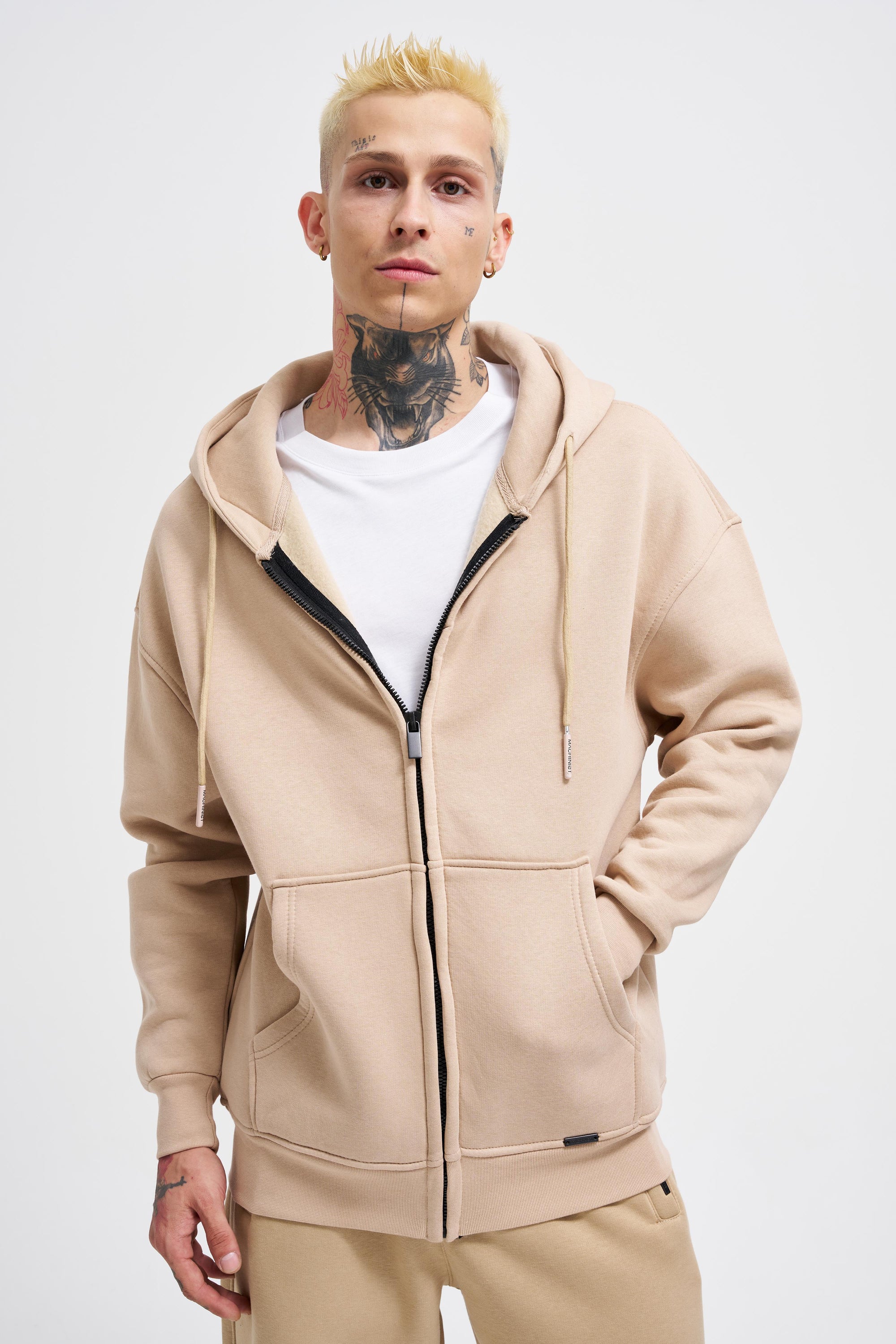 Erkek Oversize Fermuarlı Cepli Kapüşonlu Basic Sweatshirt Bej
