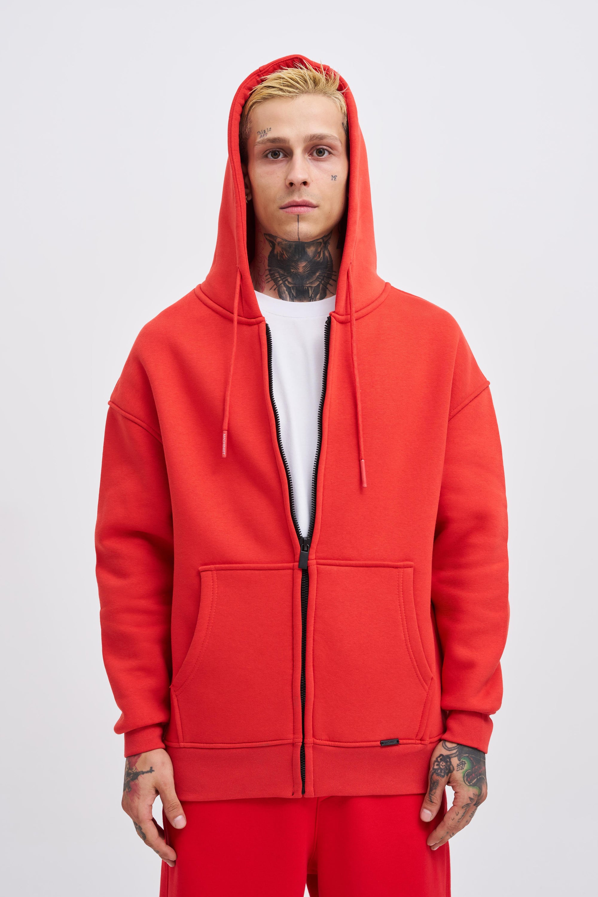Erkek Oversize Fermuarlı Cepli Kapüşonlu Basic Sweatshirt Açık Kırmızı