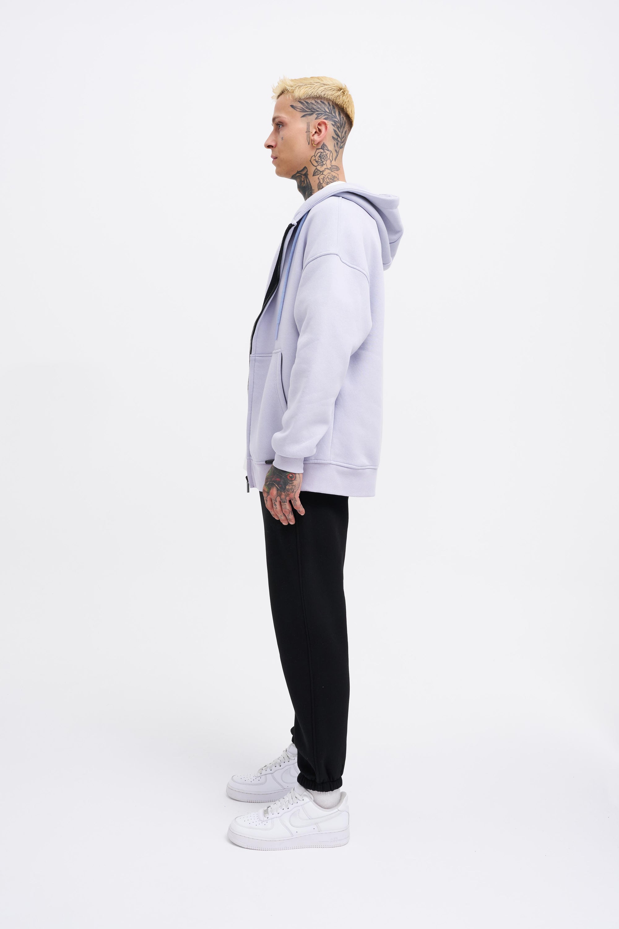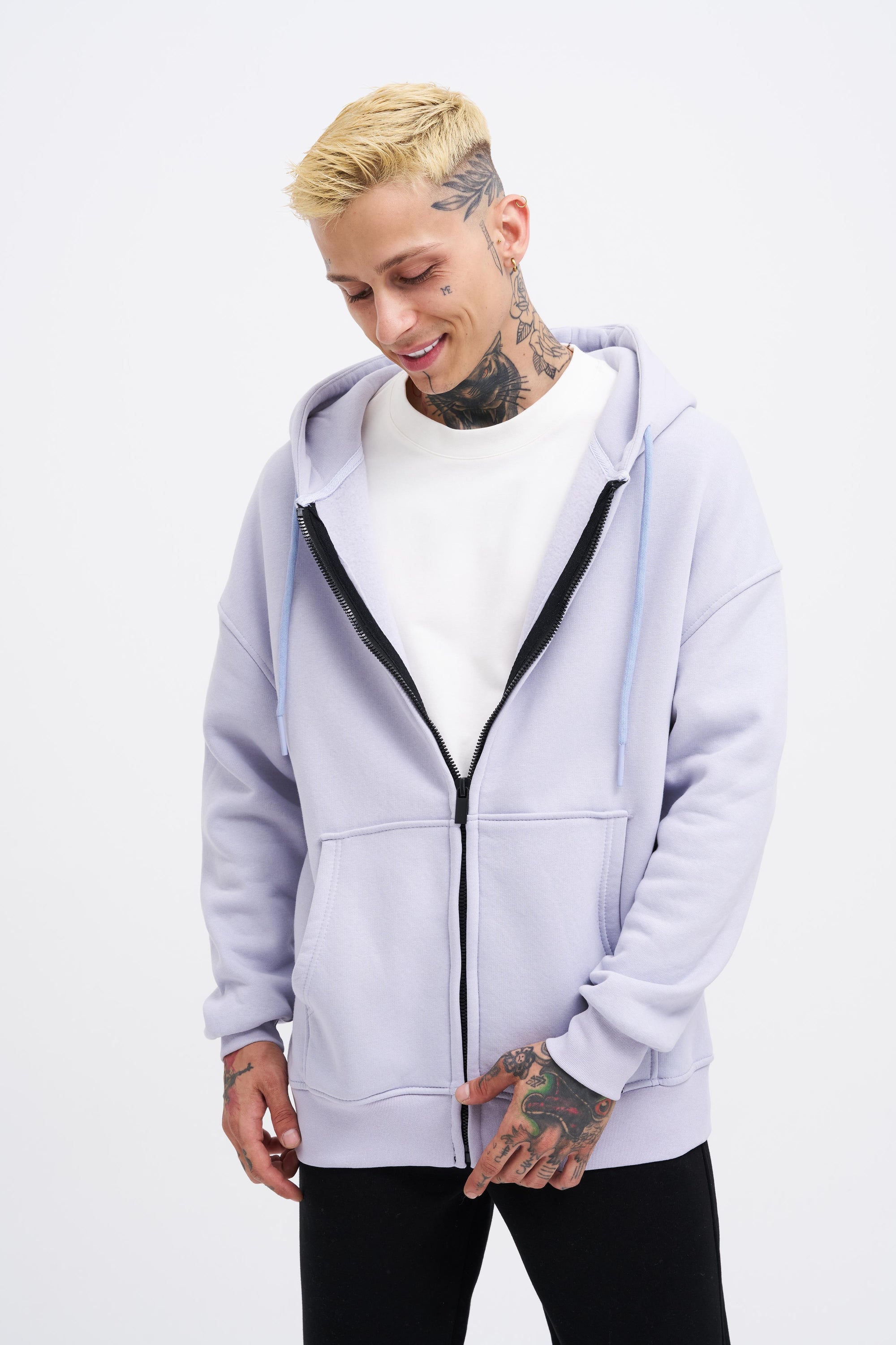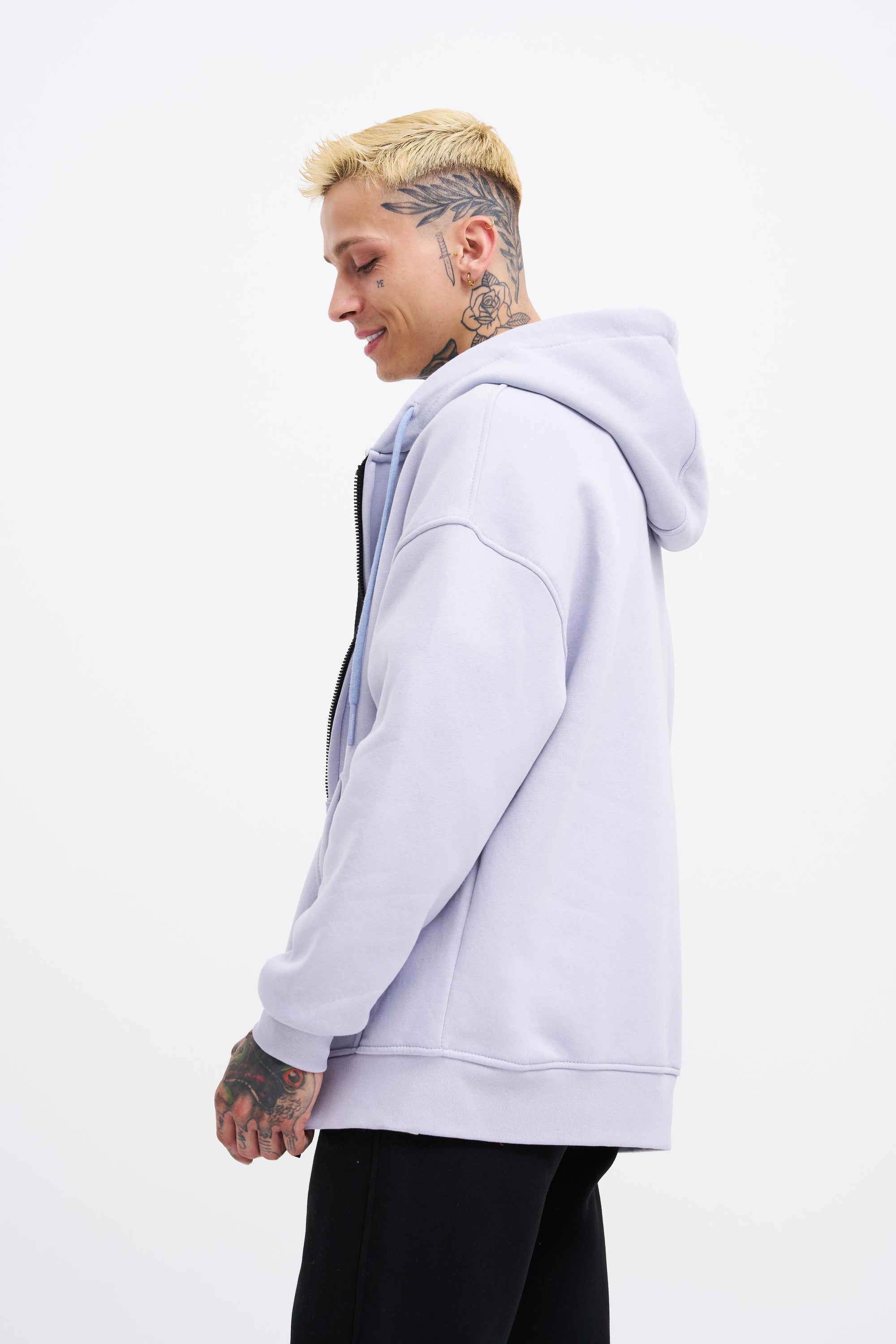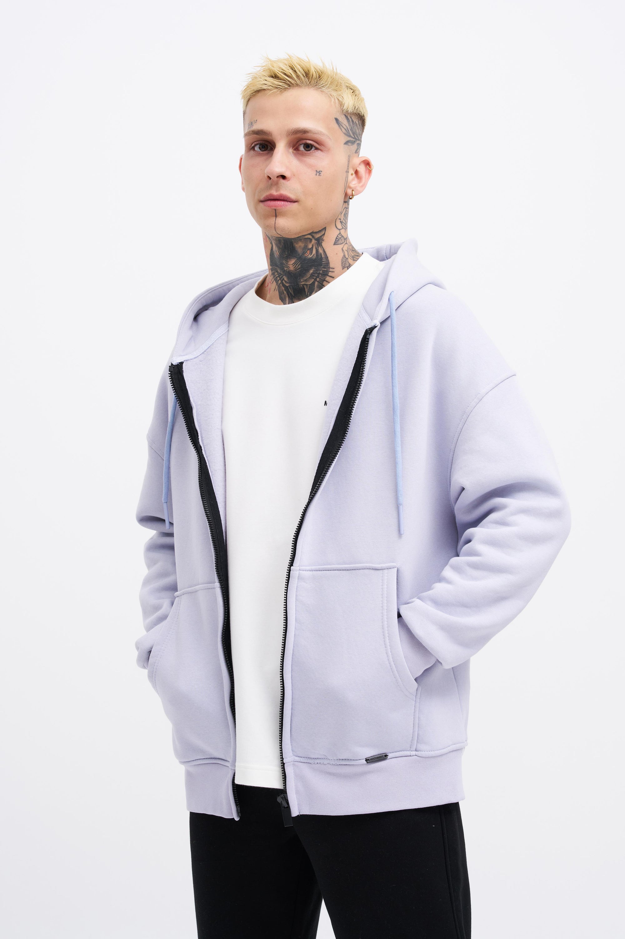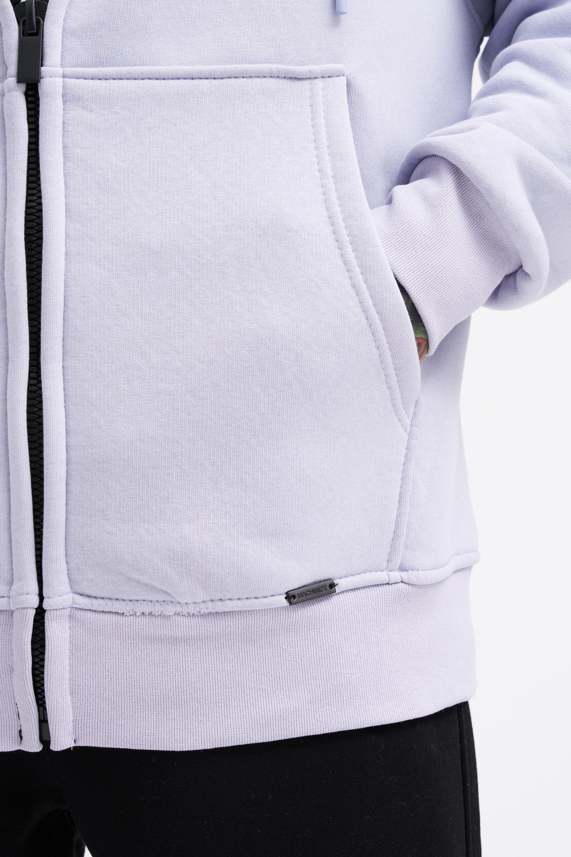 Erkek Oversize Fermuarlı Cepli Kapüşonlu Basic Sweatshirt Açık Lila