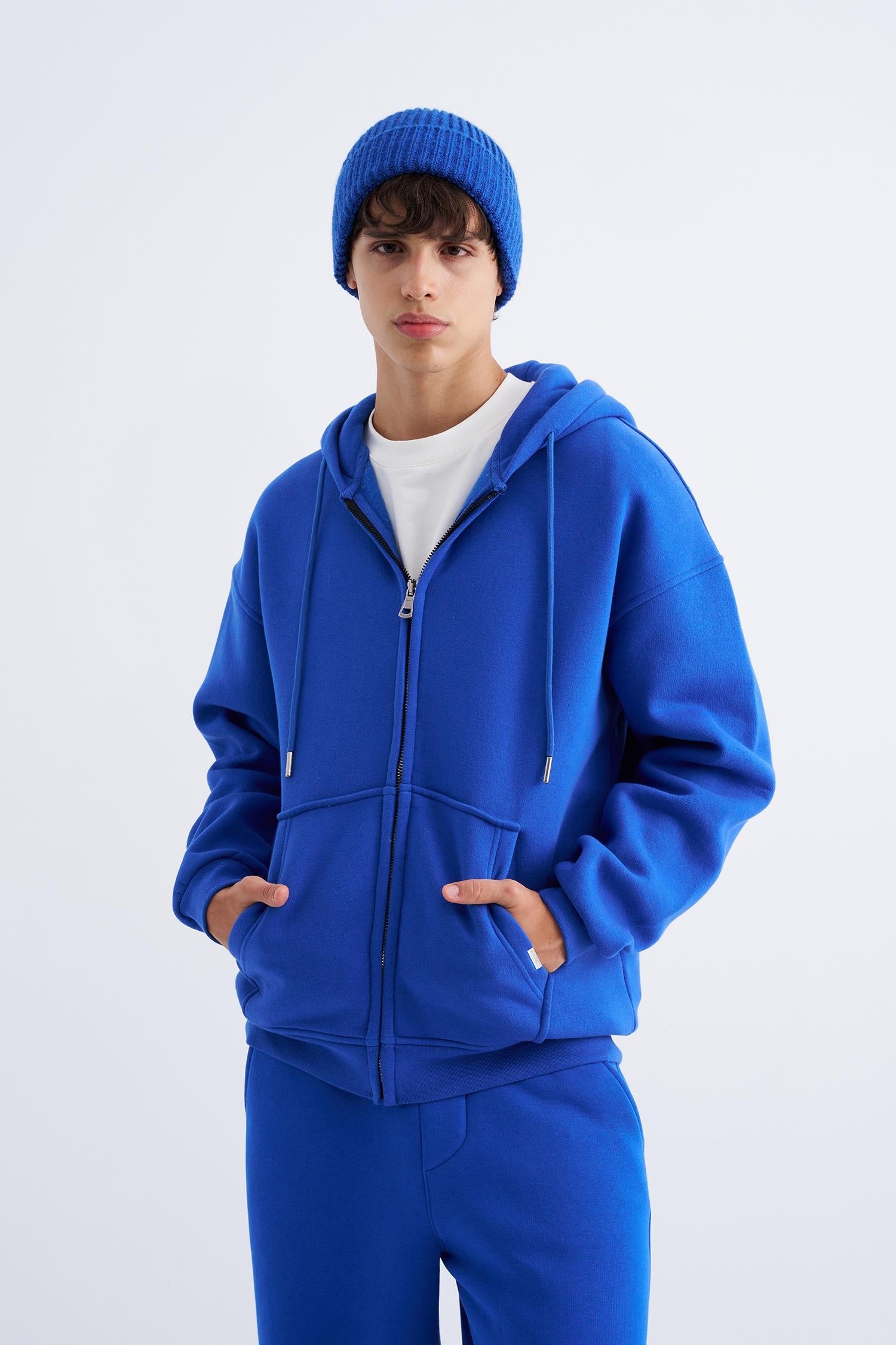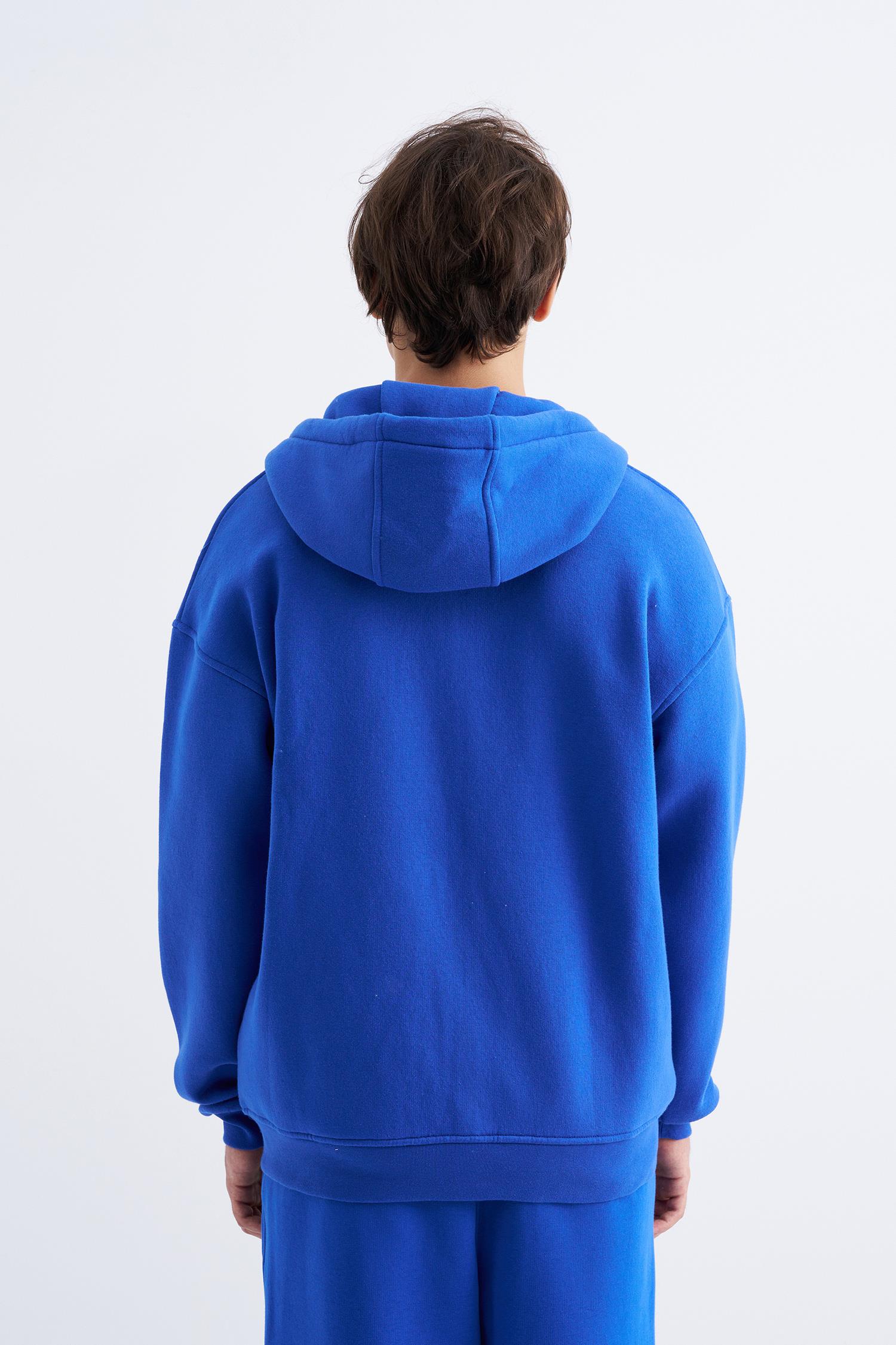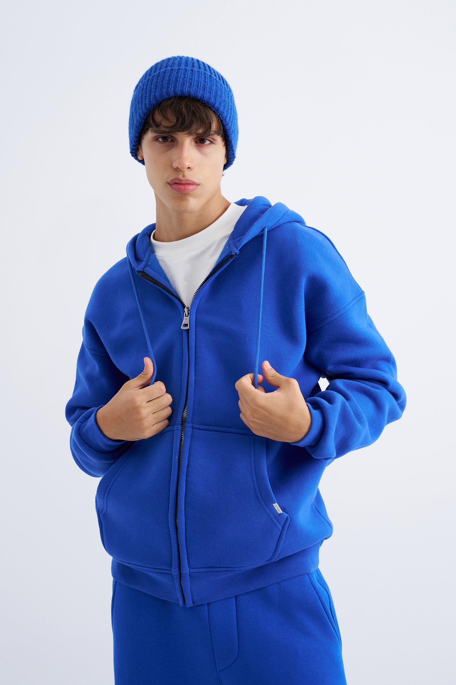 Erkek Oversize Fermuarlı Cepli Kapüşonlu Basic Sweatshirt Saks Mavi