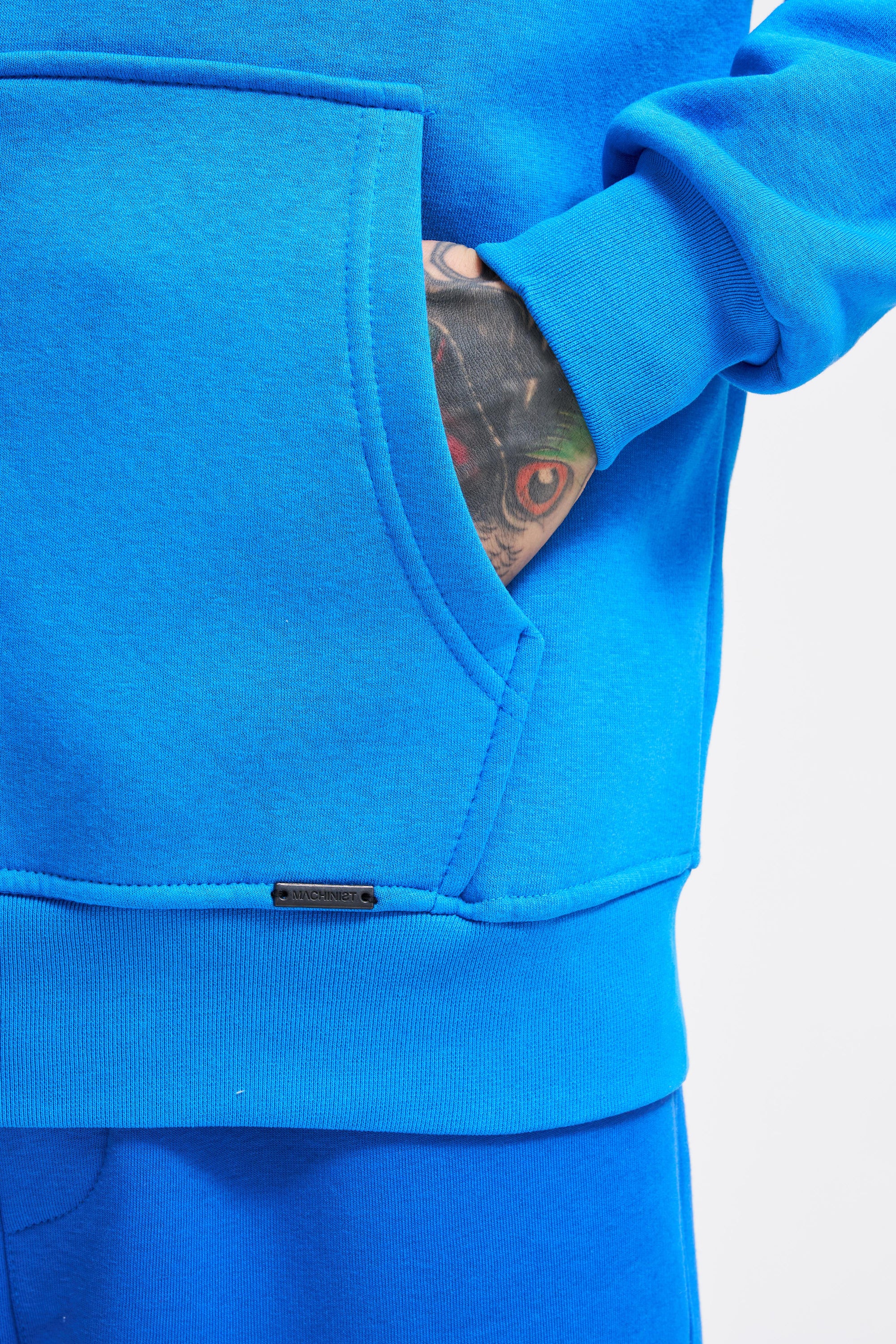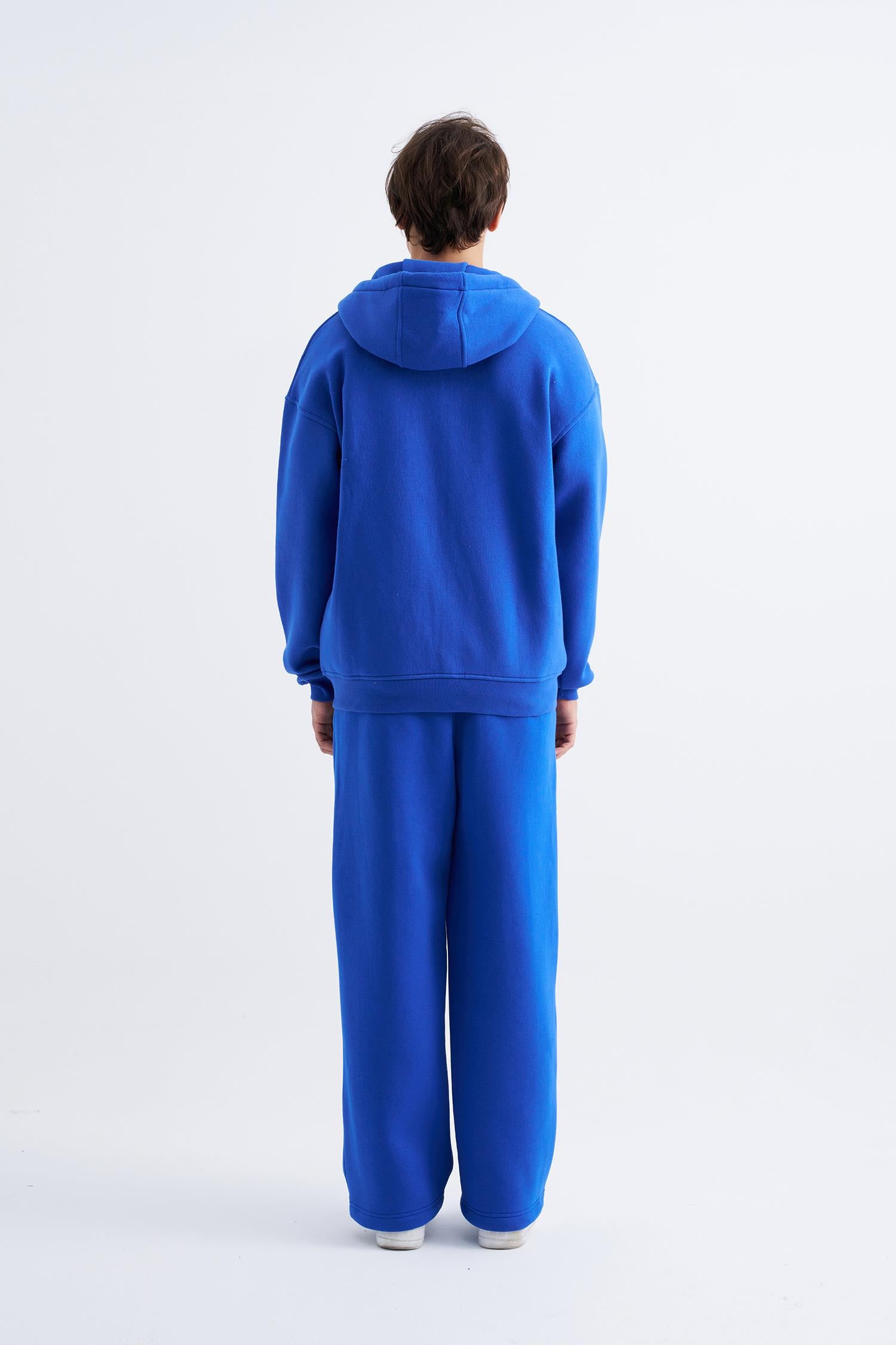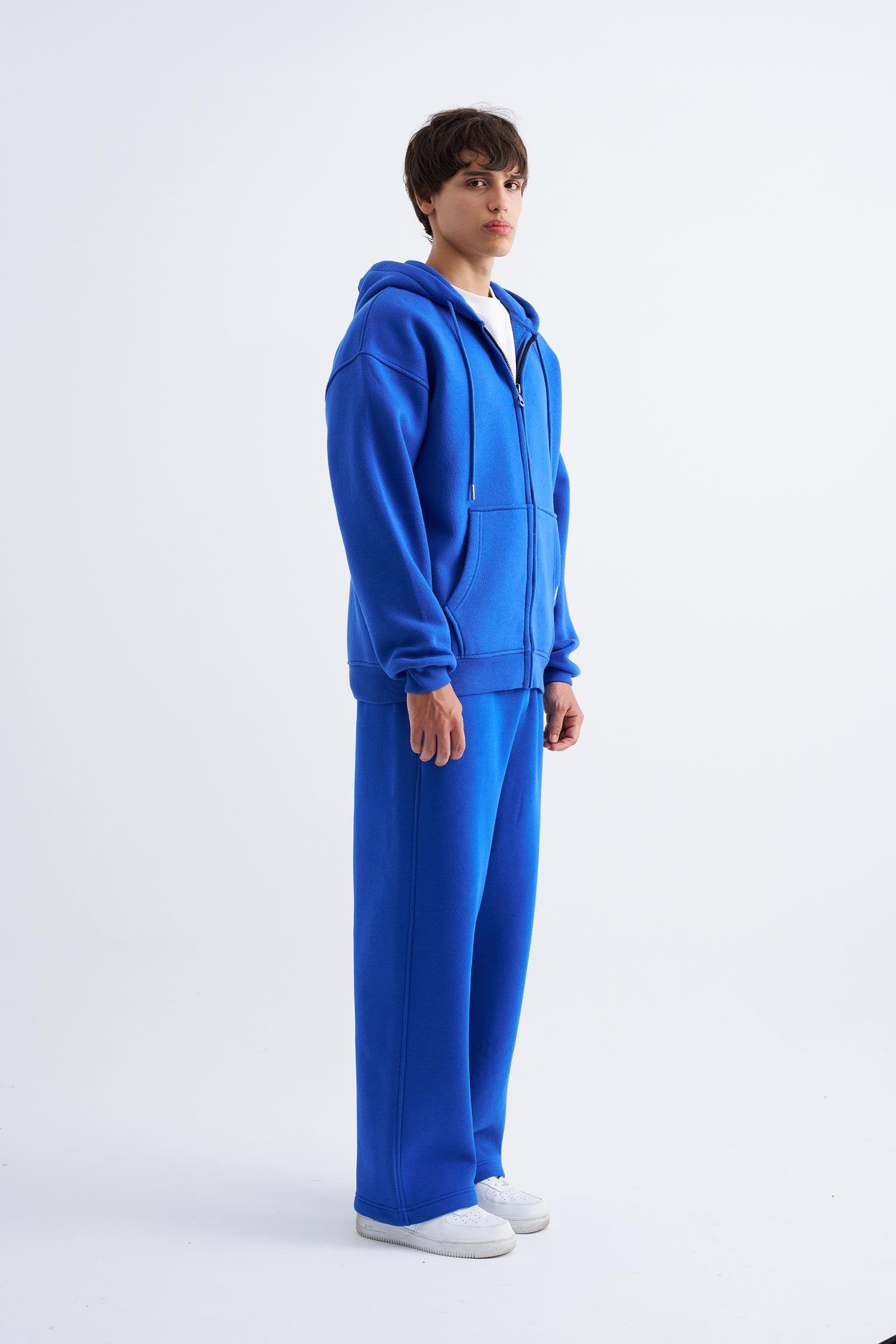 Erkek Oversize Fermuarlı Cepli Kapüşonlu Basic Sweatshirt Saks Mavi