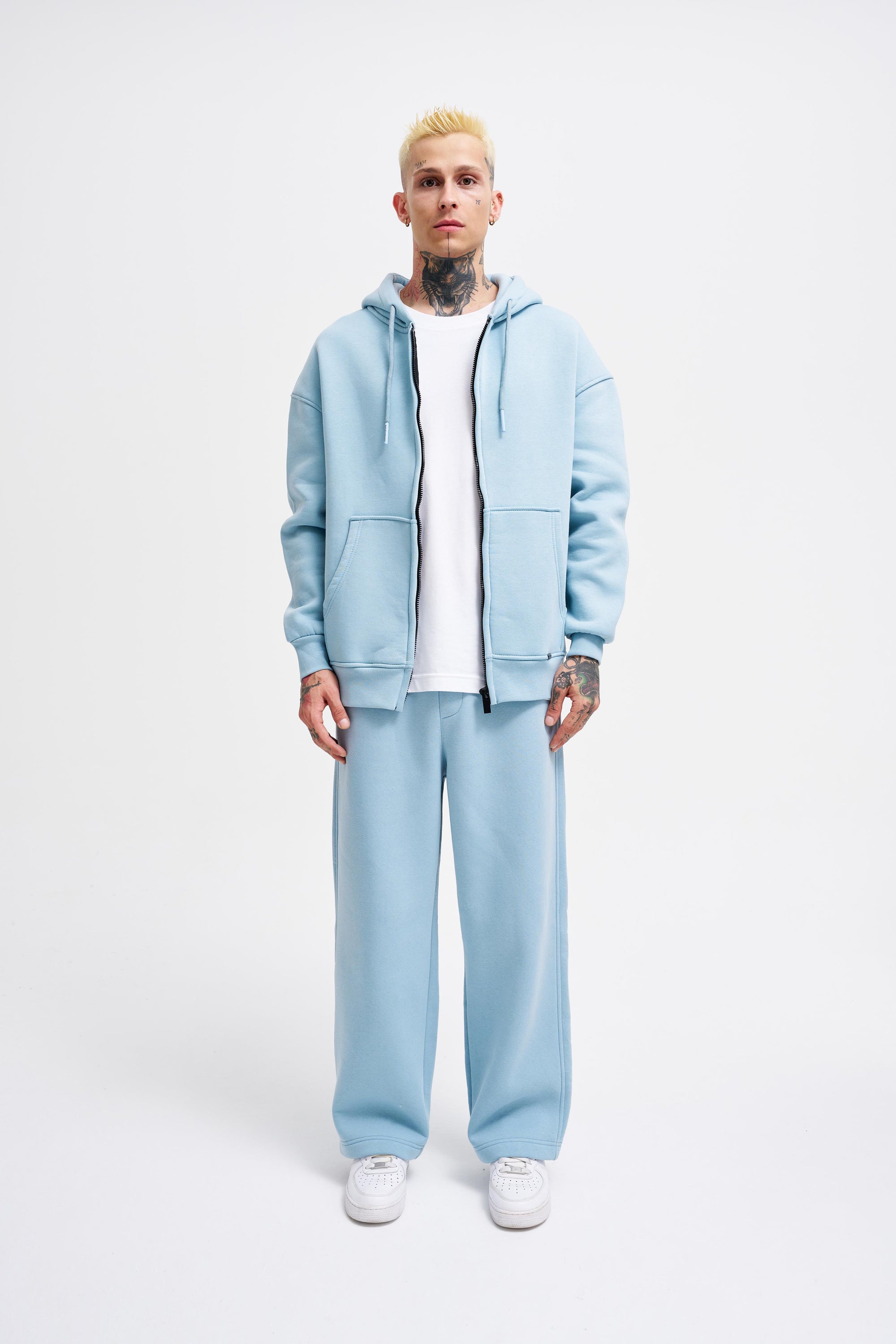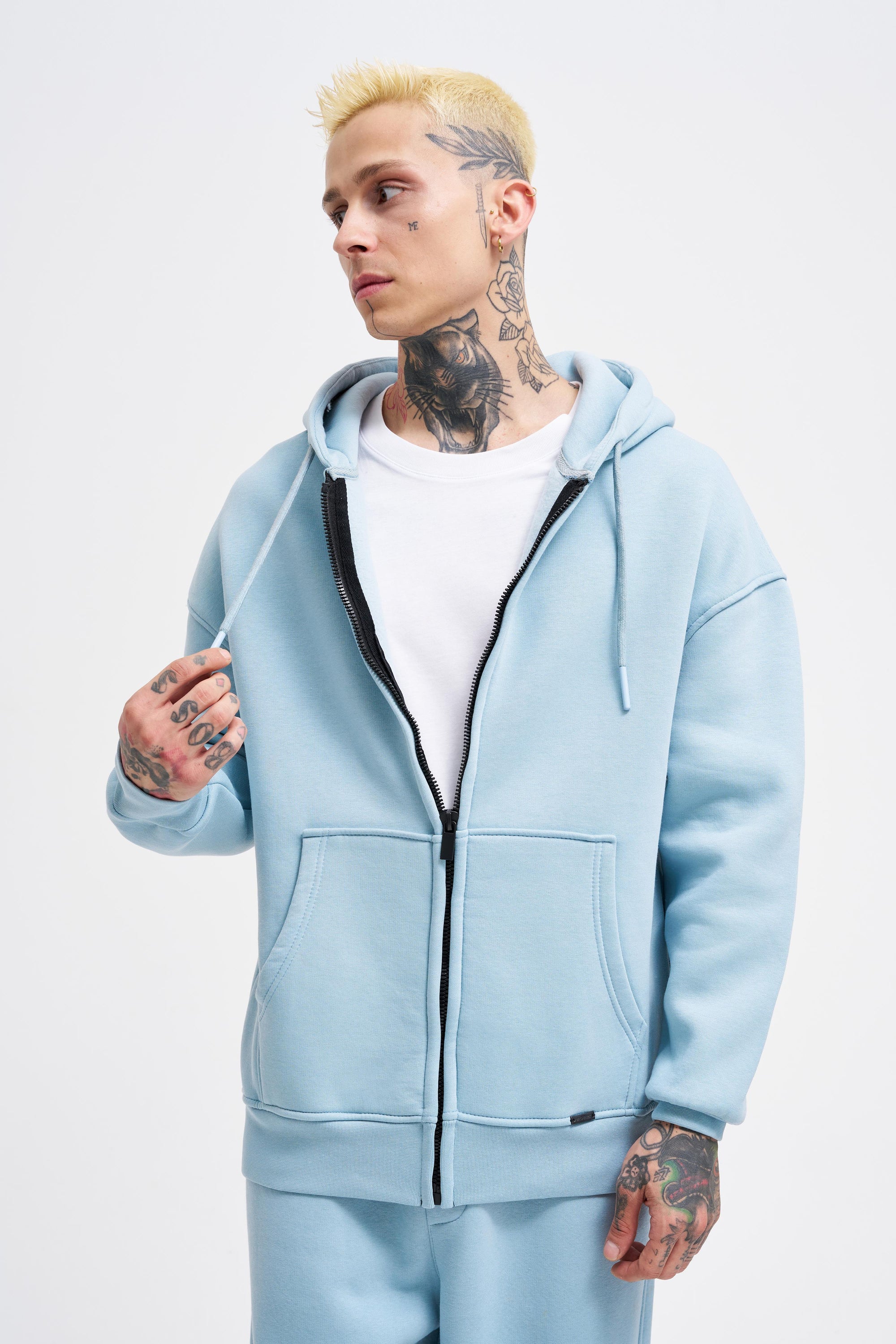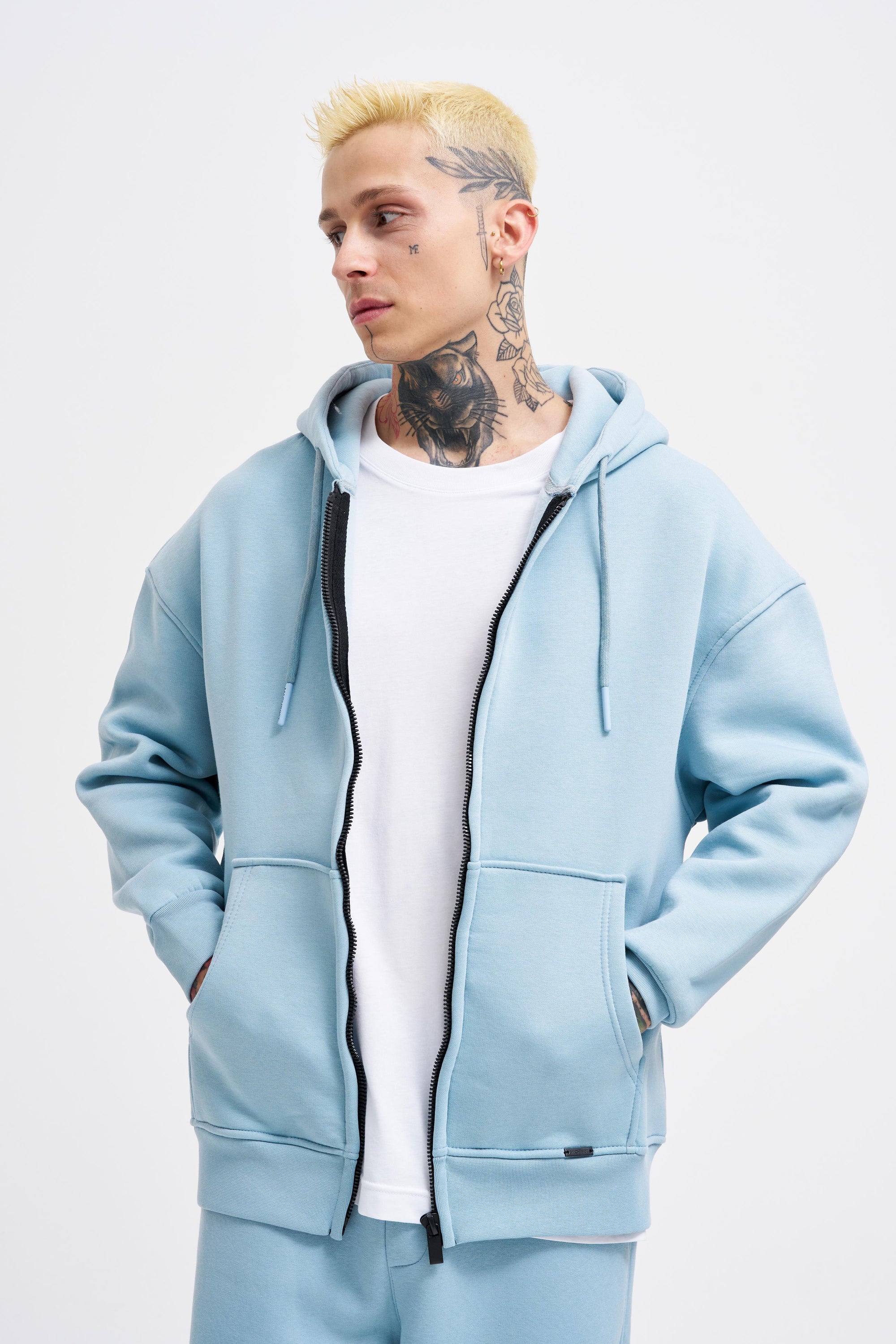Erkek Oversize Fermuarlı Cepli Kapüşonlu Basic Sweatshirt Açık Mavi
