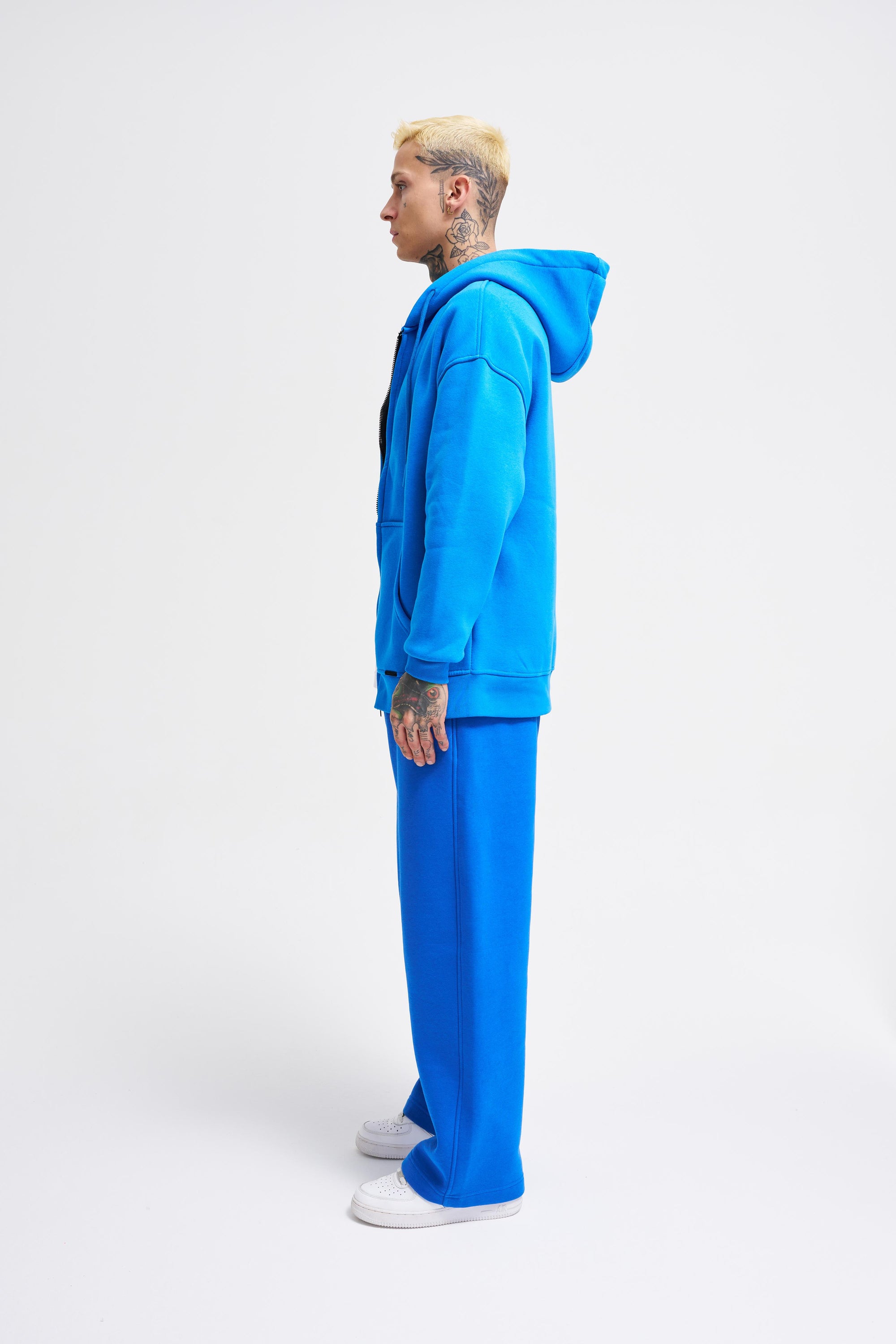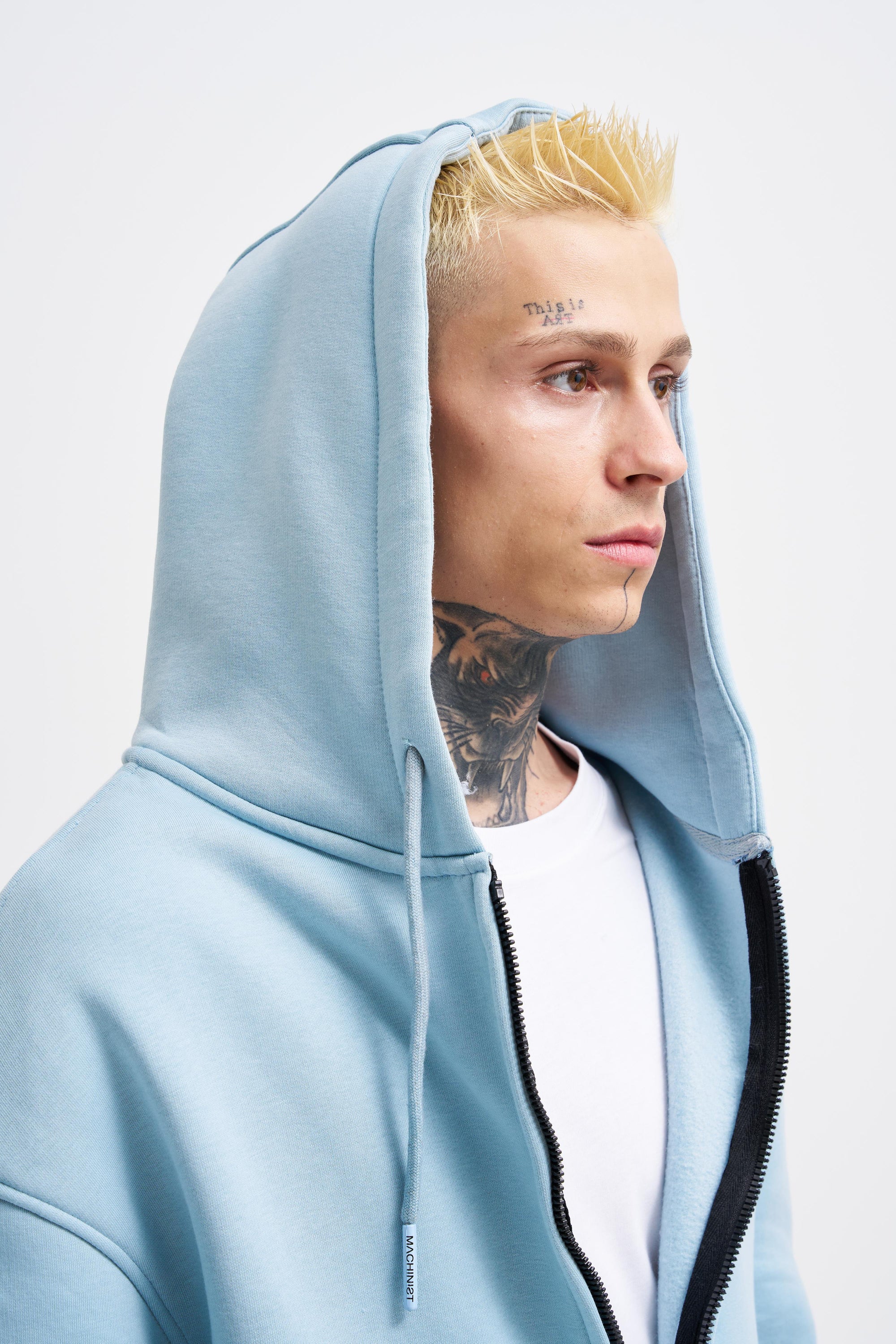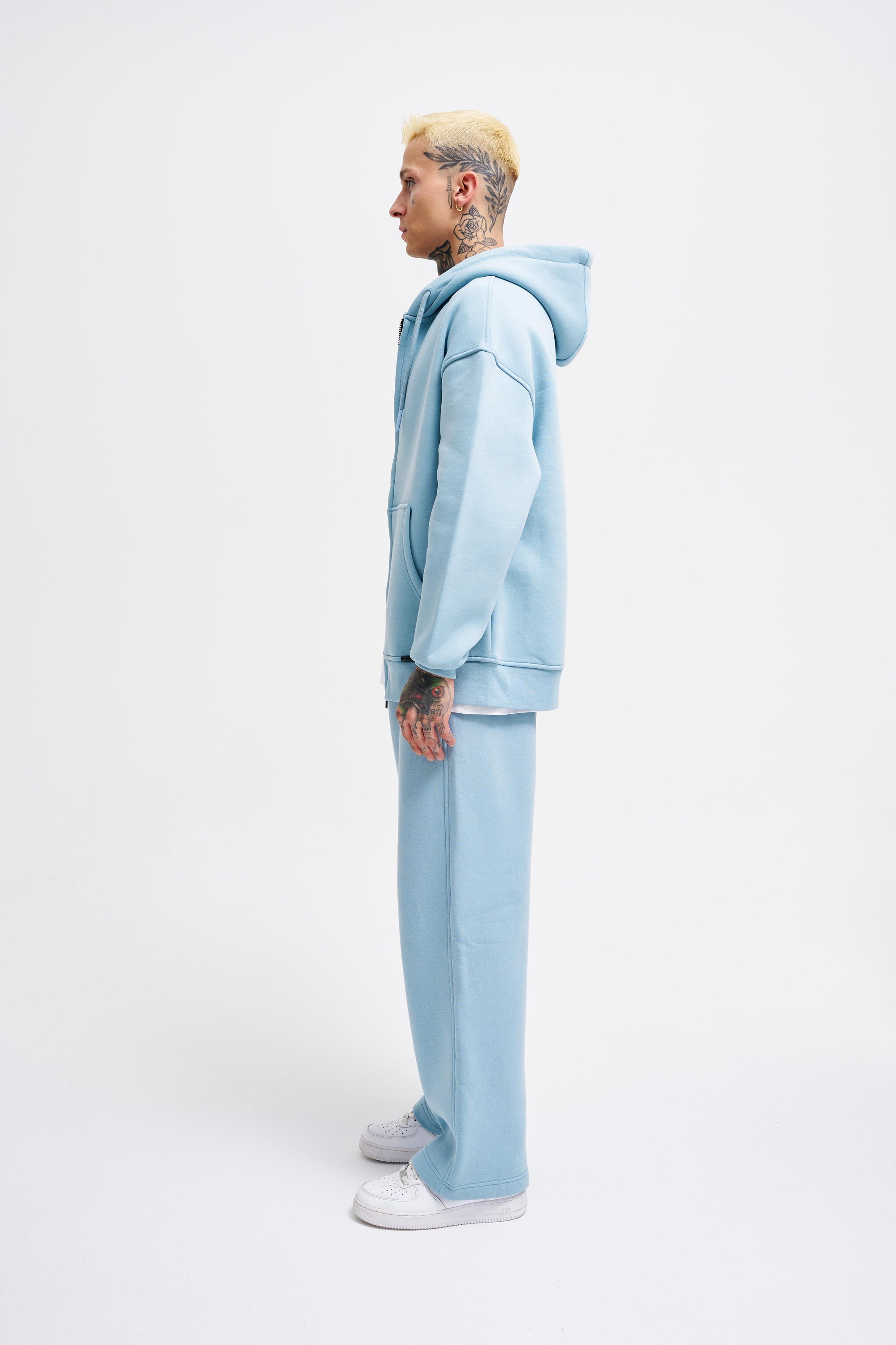 Erkek Oversize Fermuarlı Cepli Kapüşonlu Basic Sweatshirt Açık Mavi