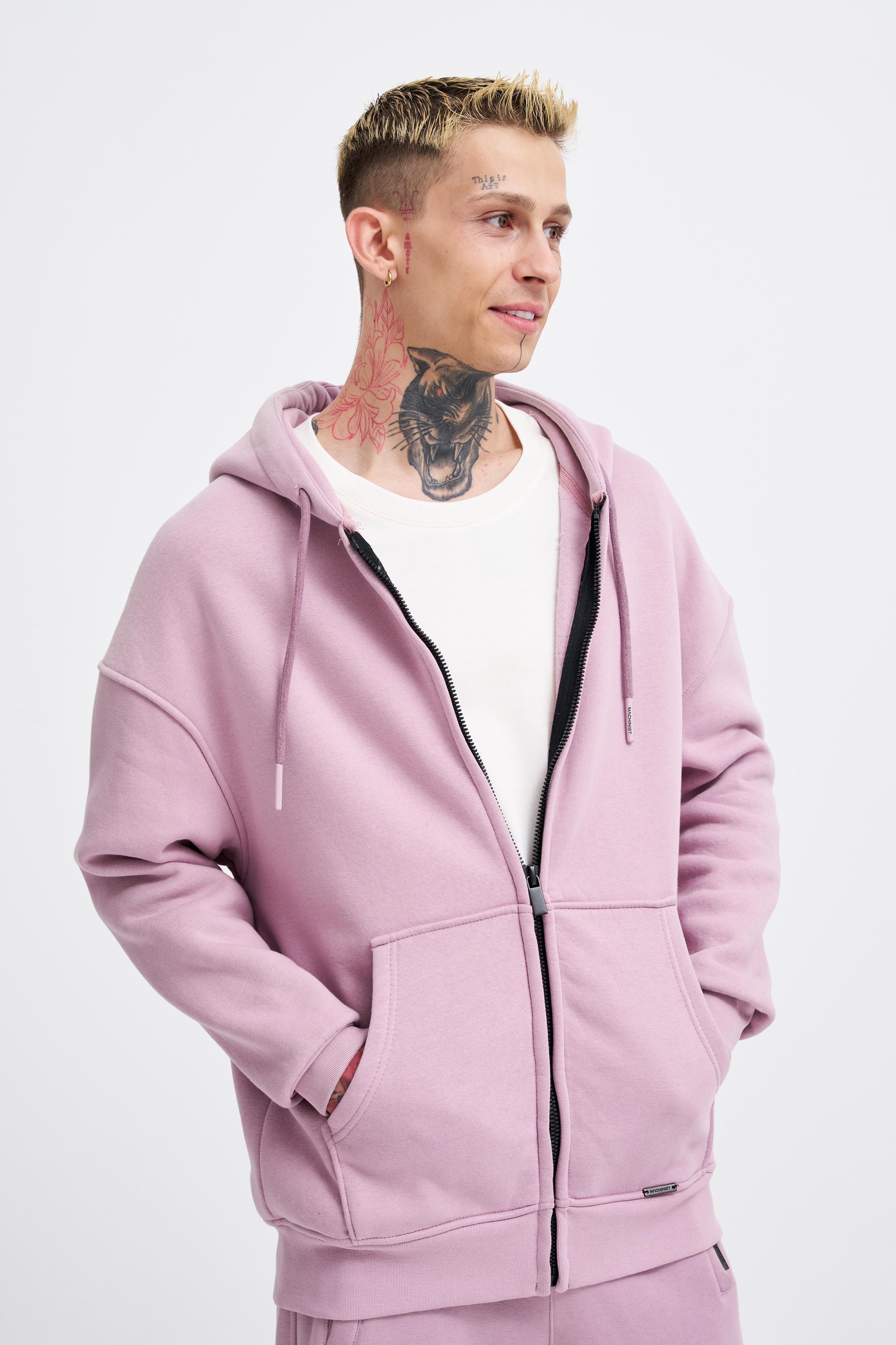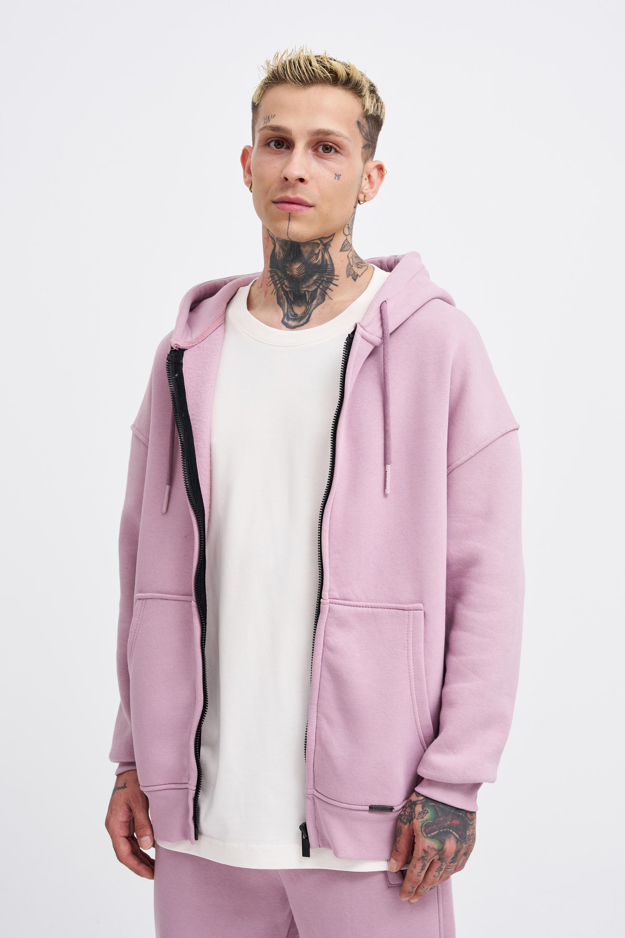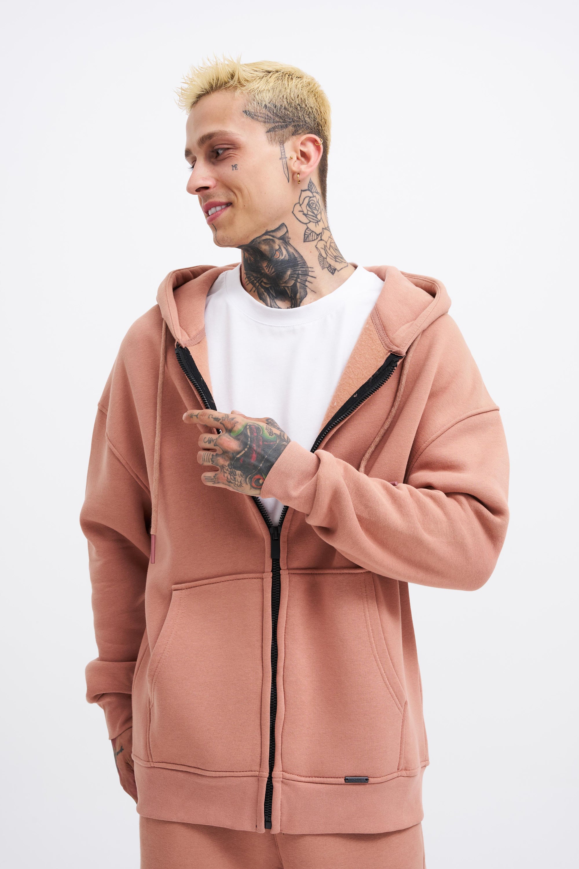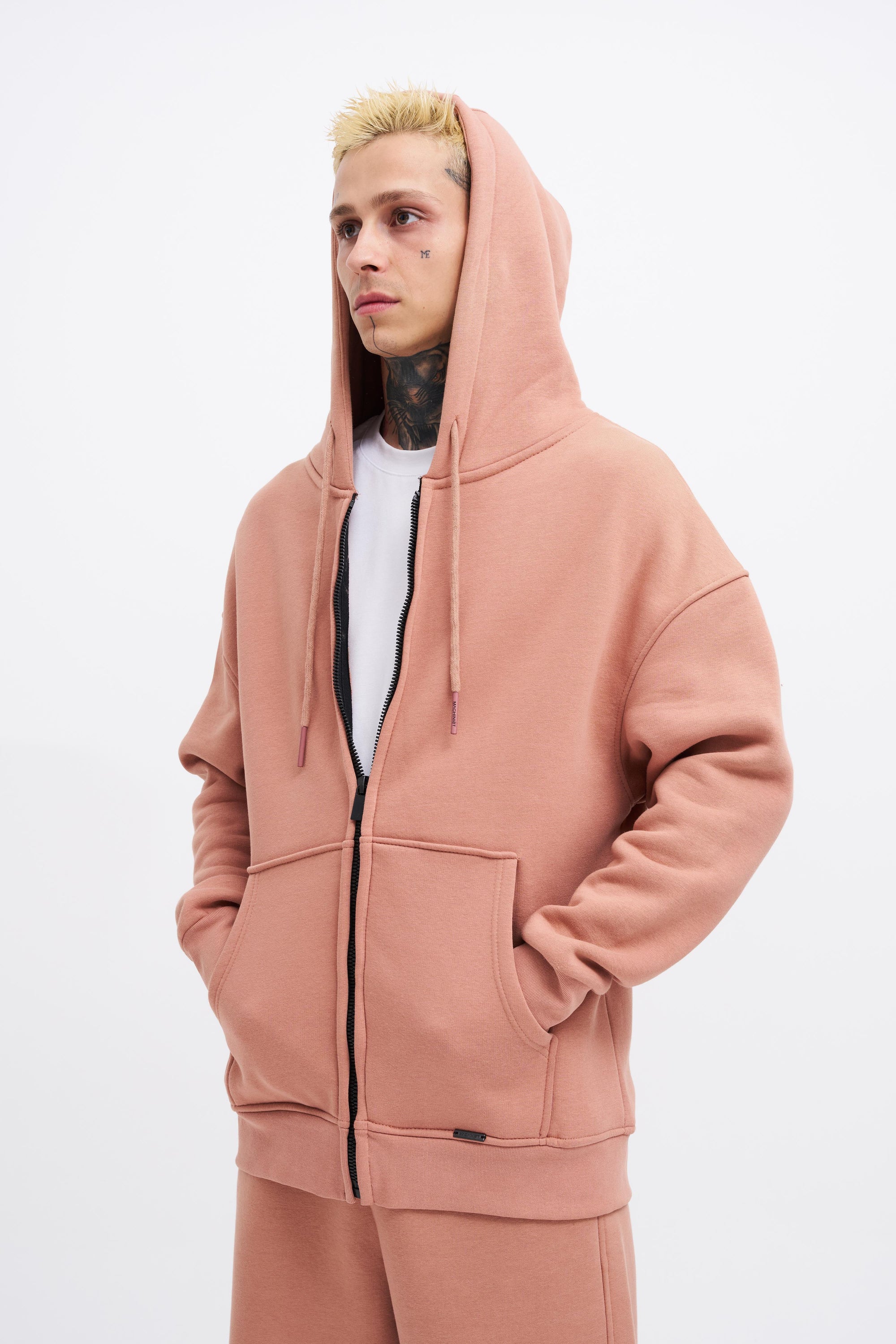 Erkek Oversize Fermuarlı Cepli Kapüşonlu Basic Sweatshirt Kirli Pembe