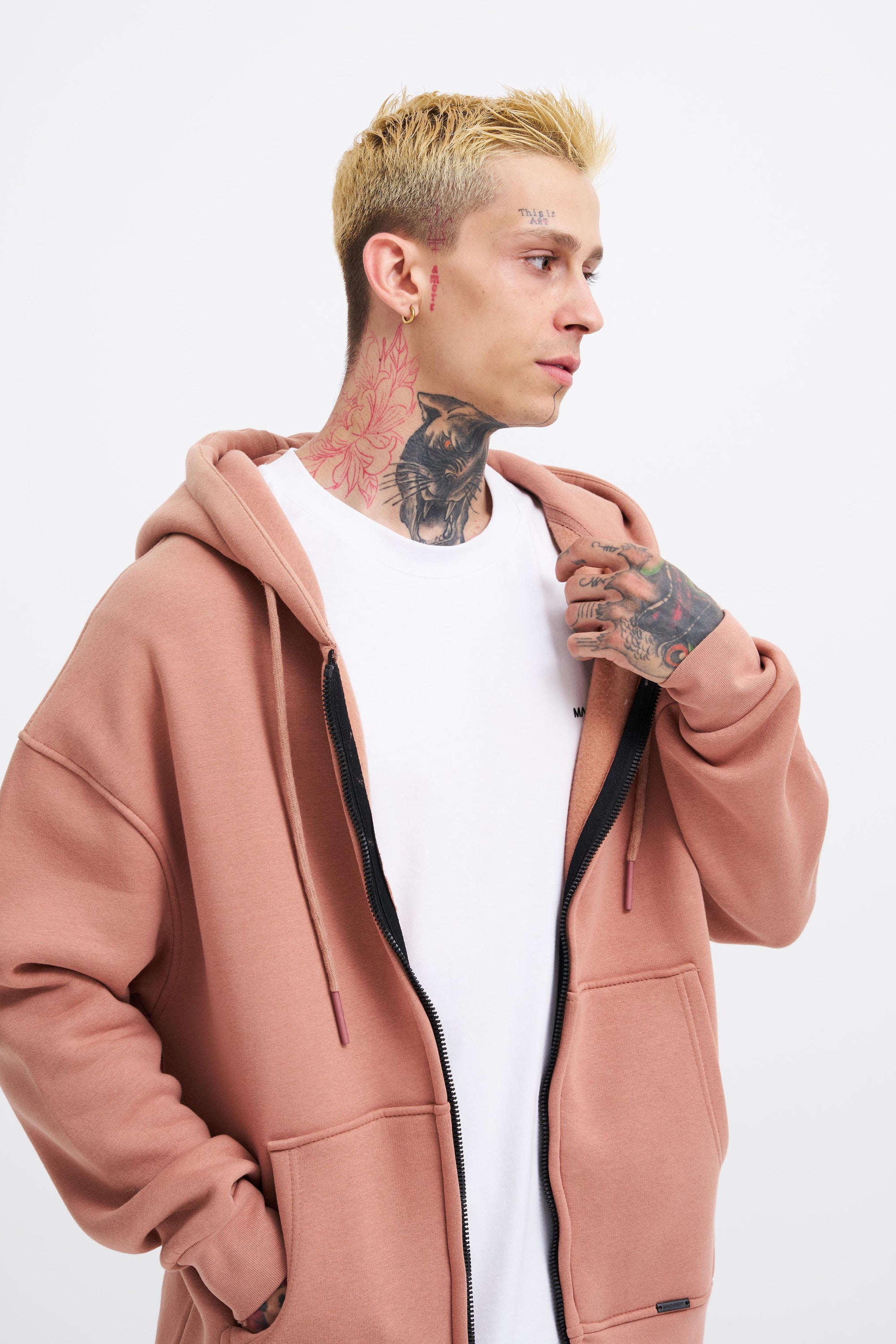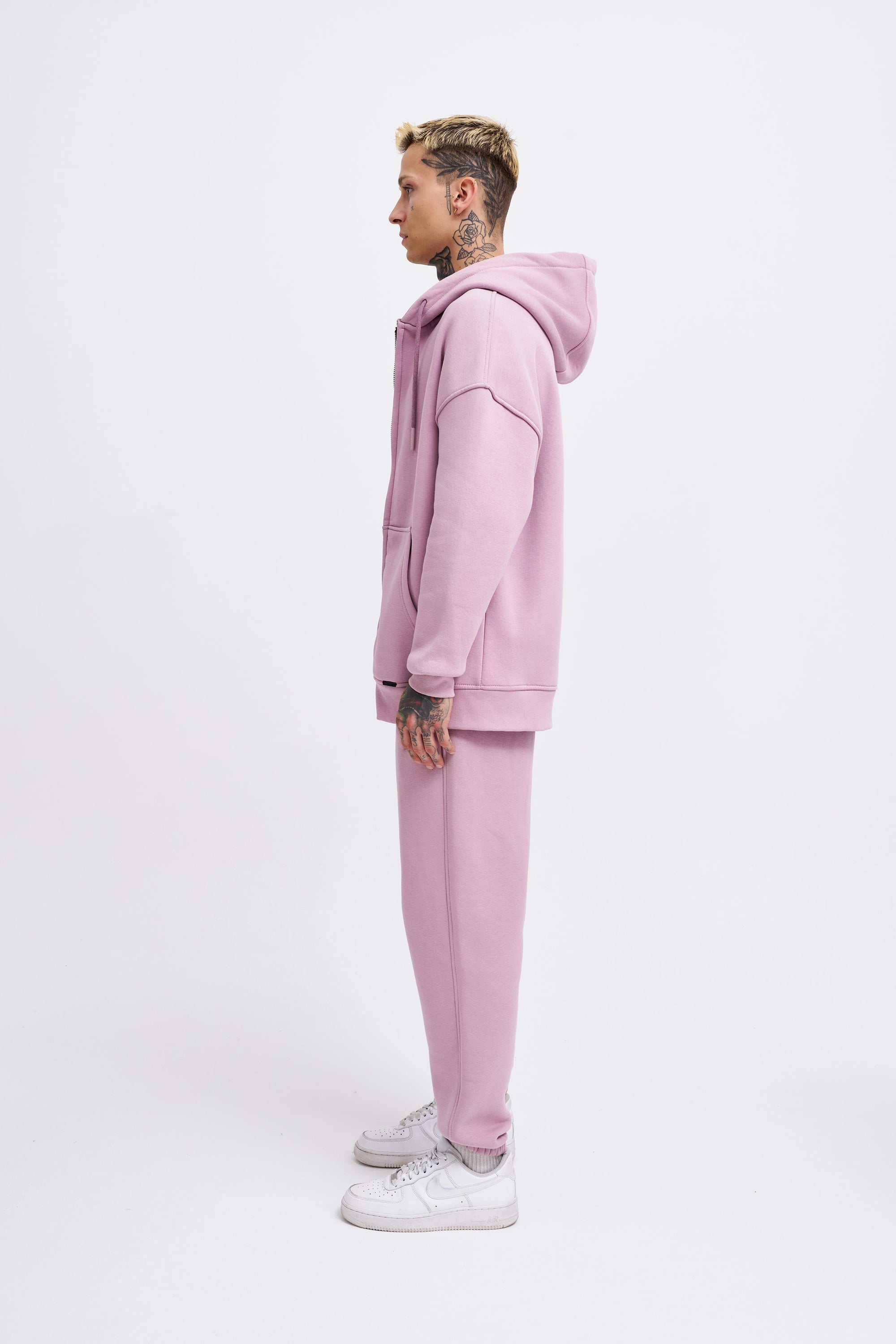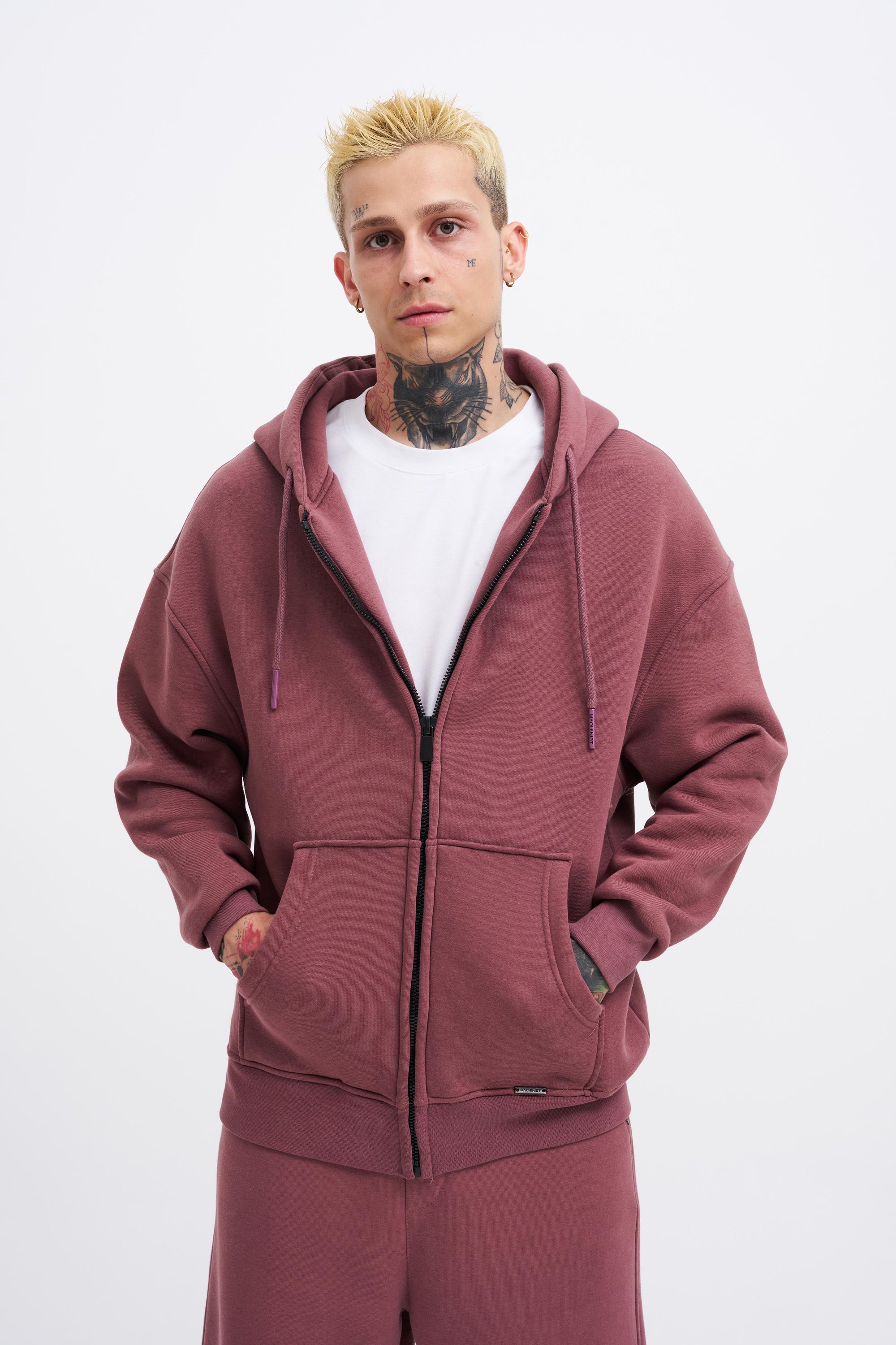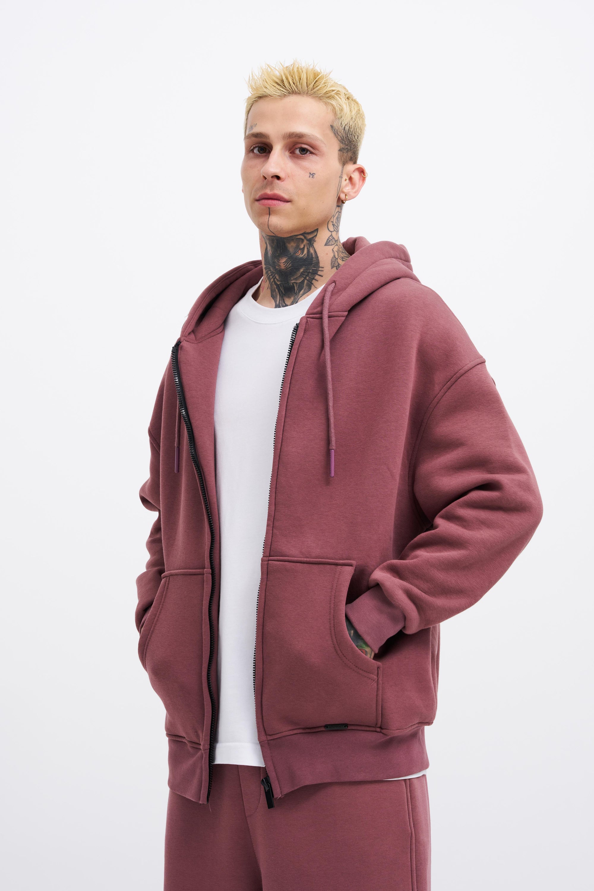 Erkek Oversize Fermuarlı Cepli Kapüşonlu Basic Sweatshirt Kirli Pembe