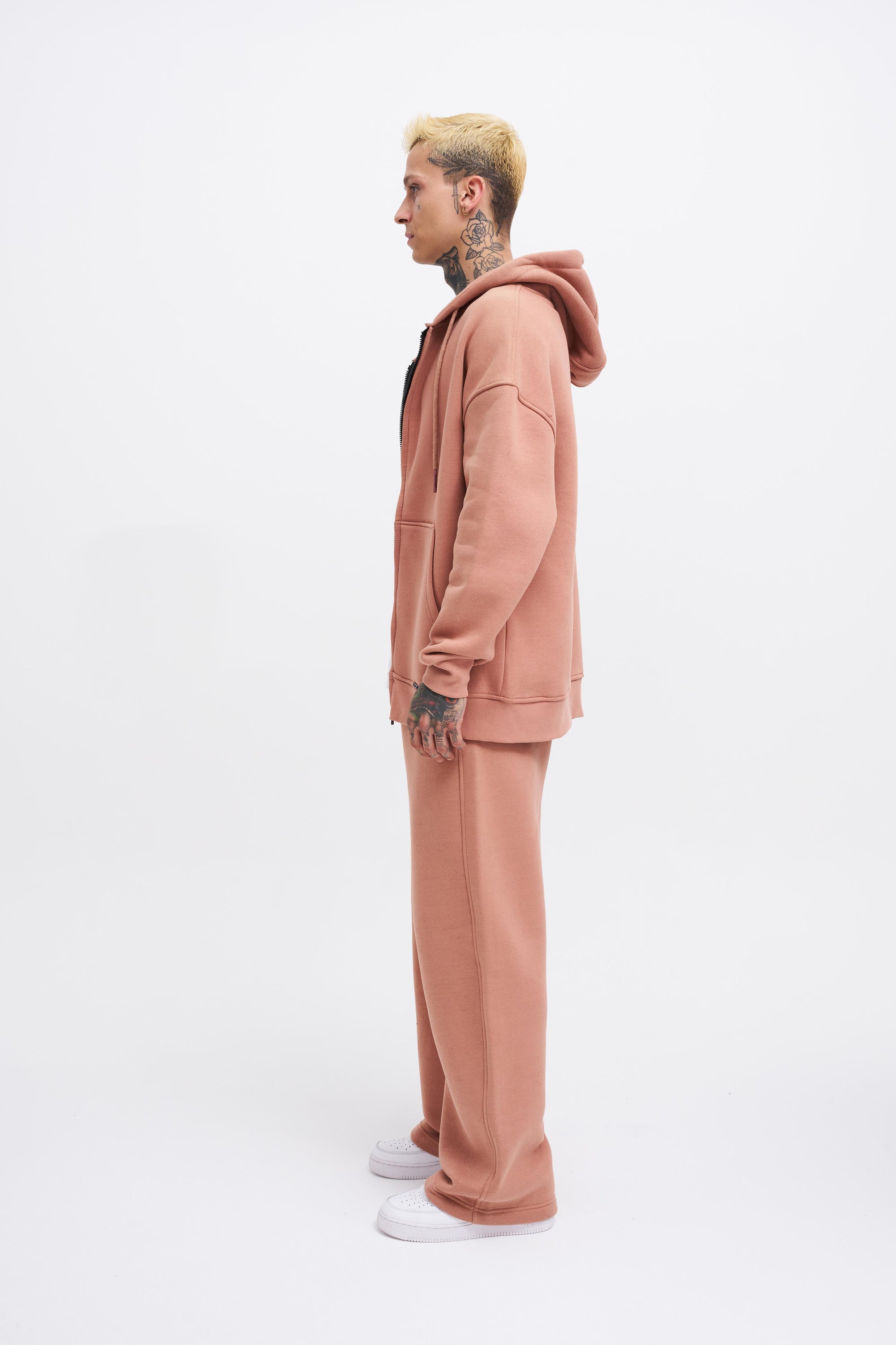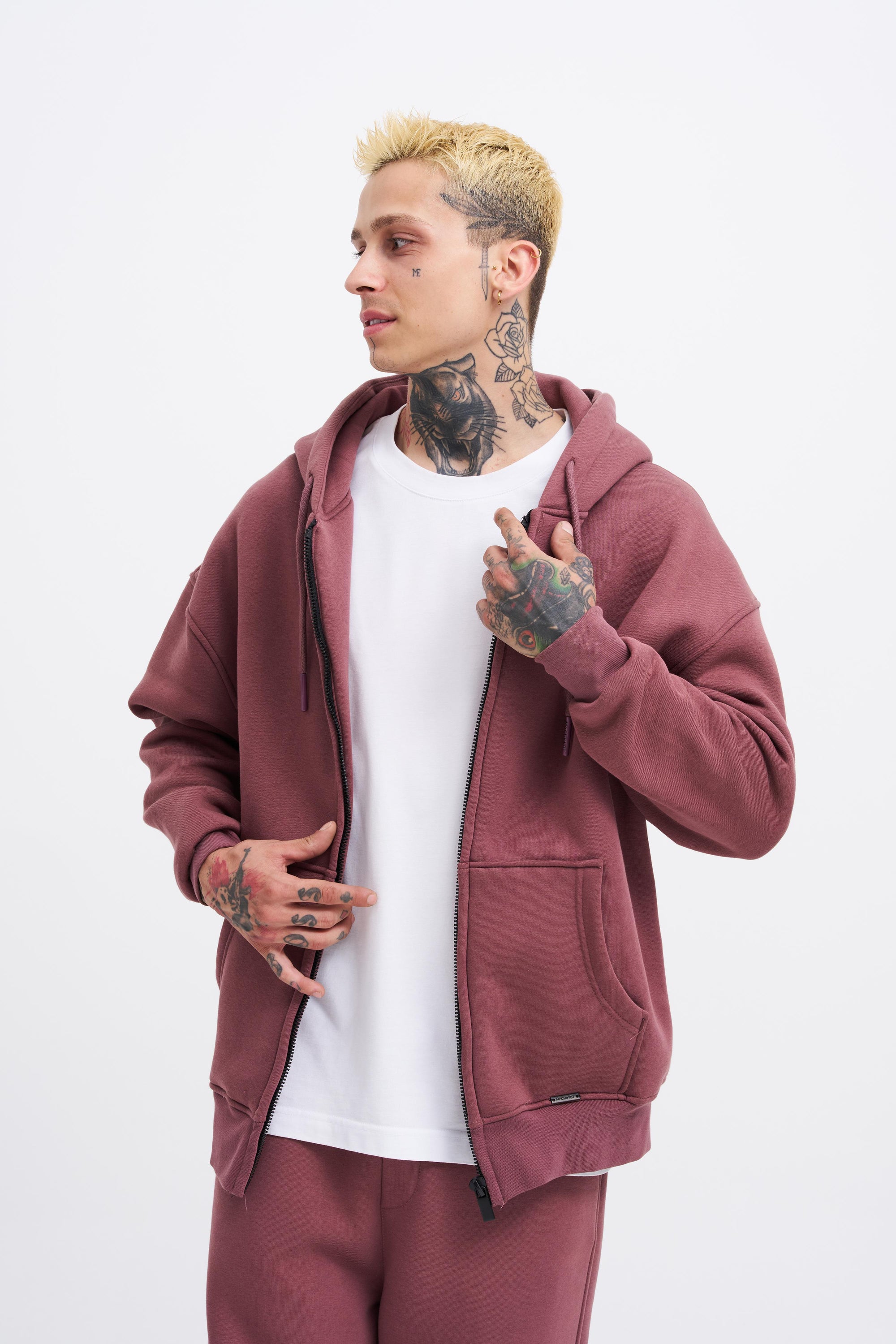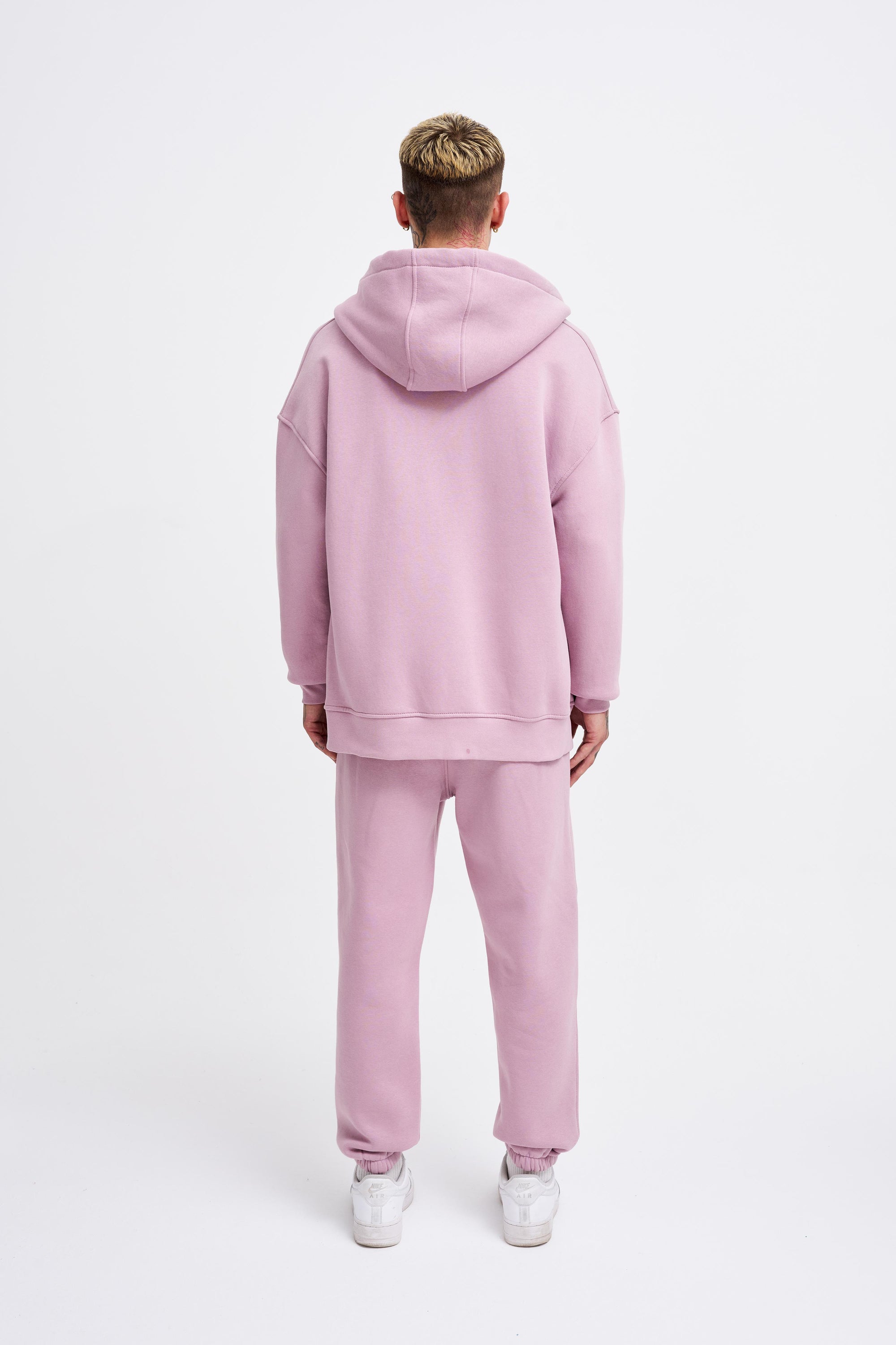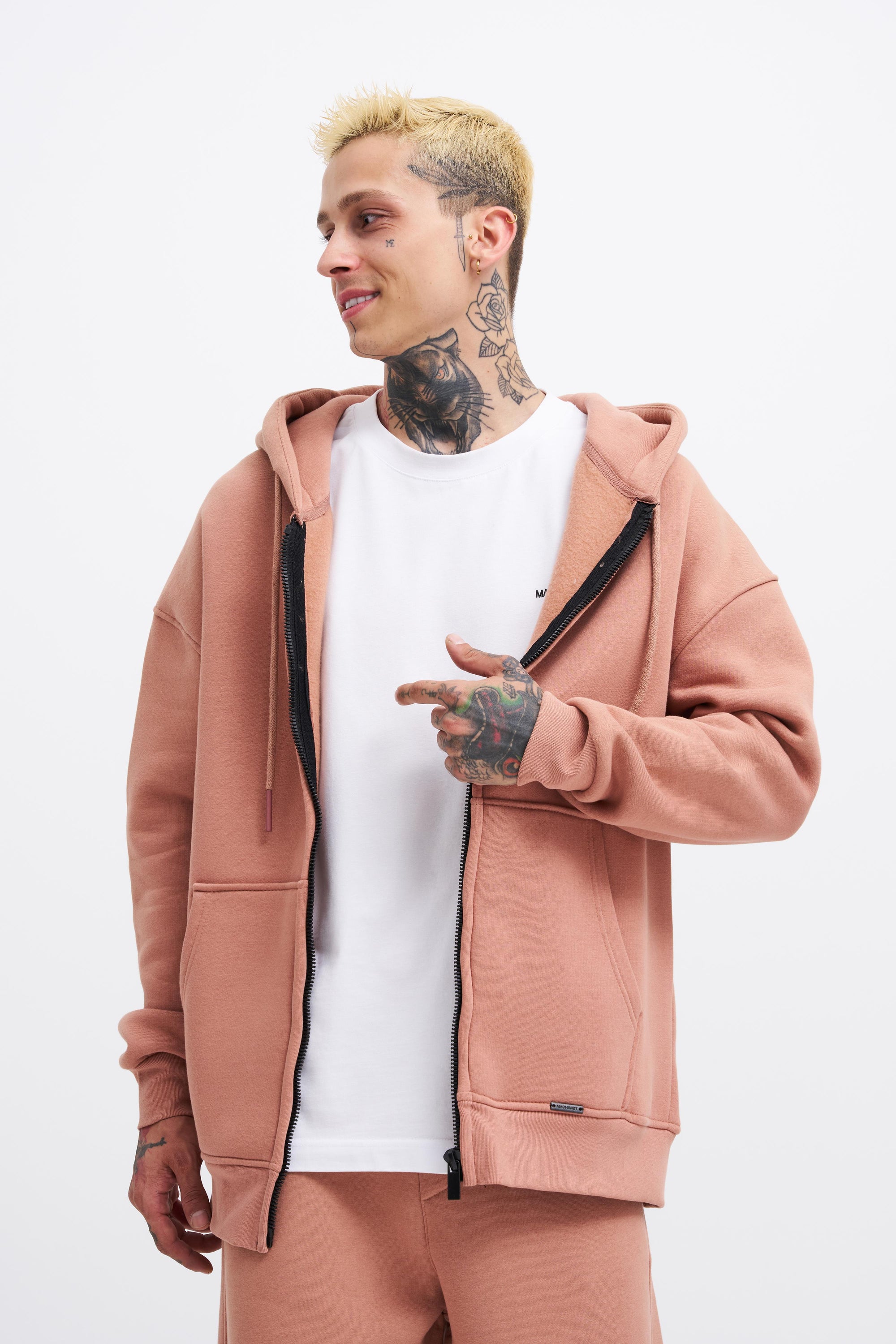 Erkek Oversize Fermuarlı Cepli Kapüşonlu Basic Sweatshirt Kirli Pembe