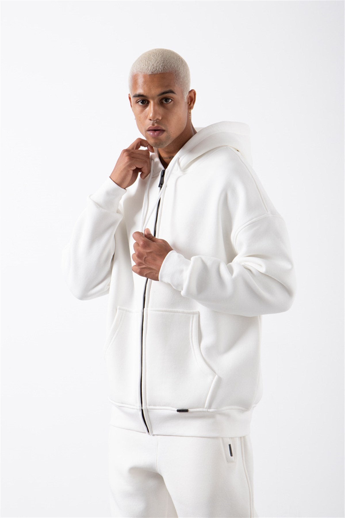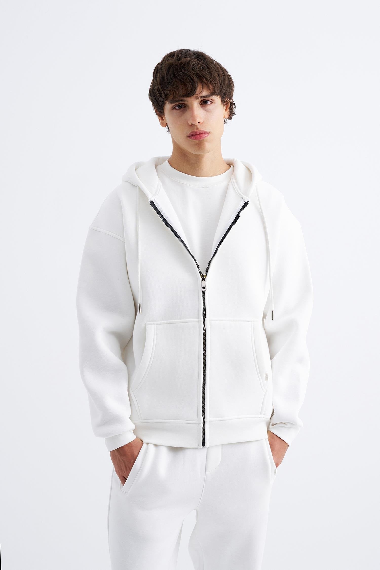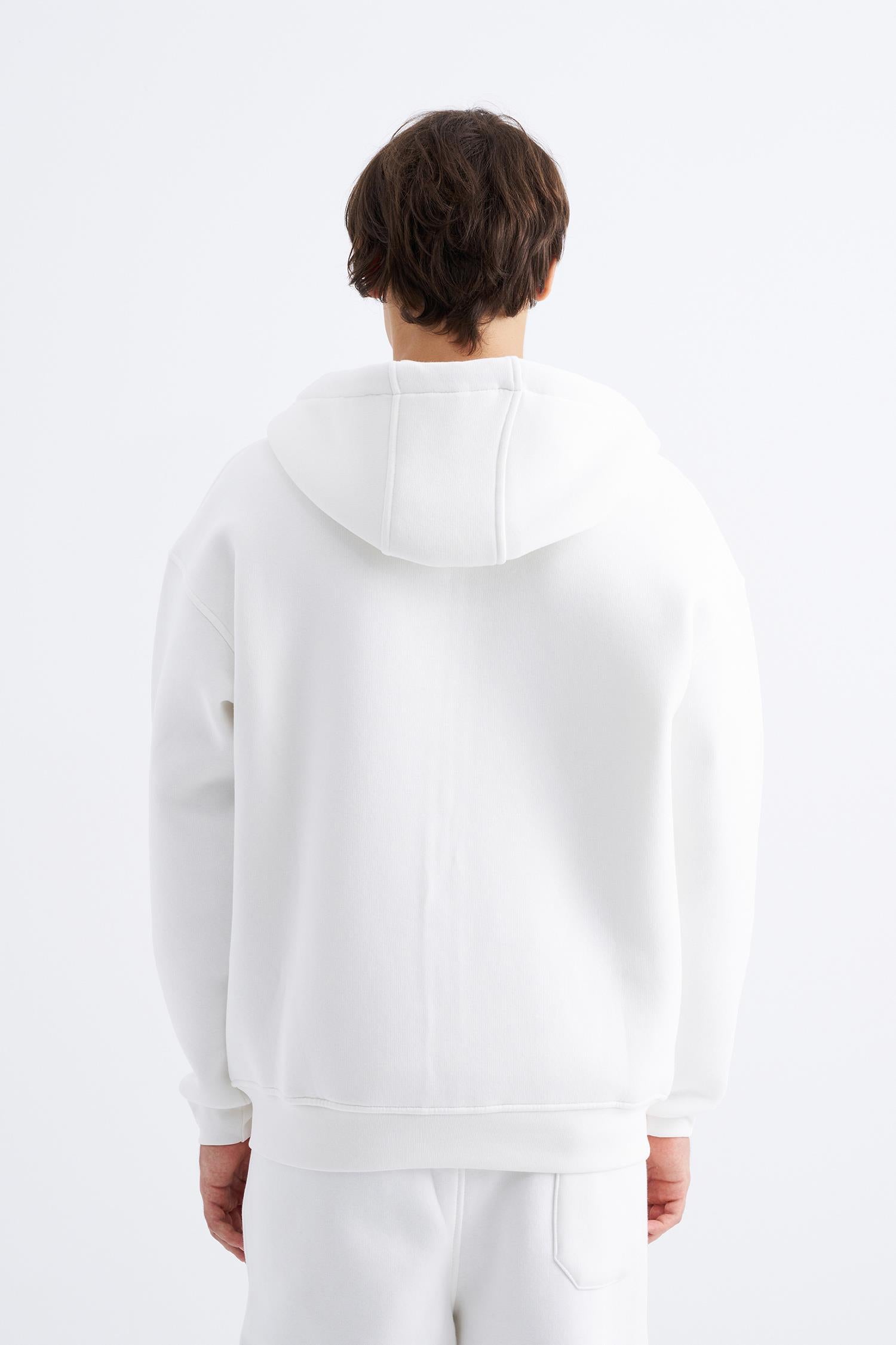 Erkek Oversize Fermuarlı Cepli Kapüşonlu Basic Sweatshirt Ekru