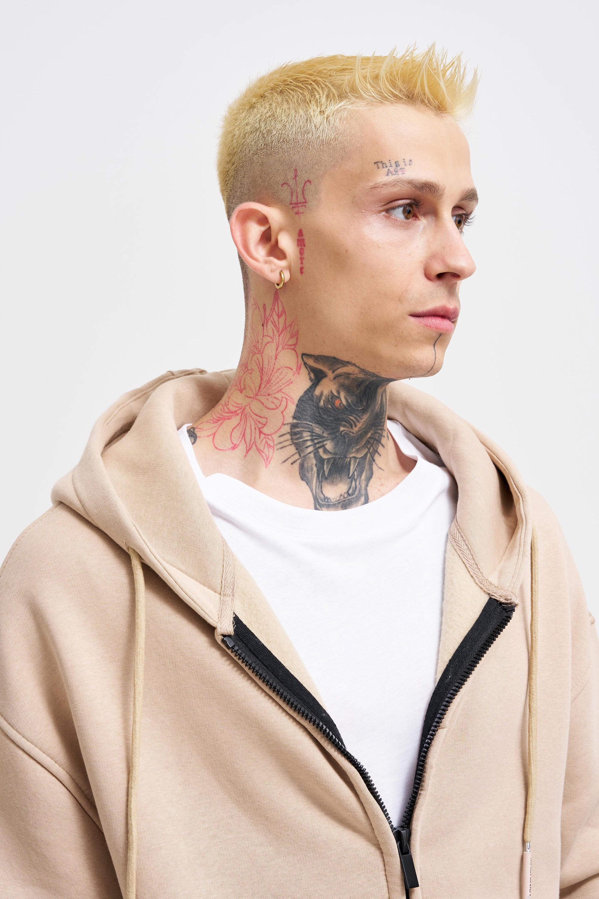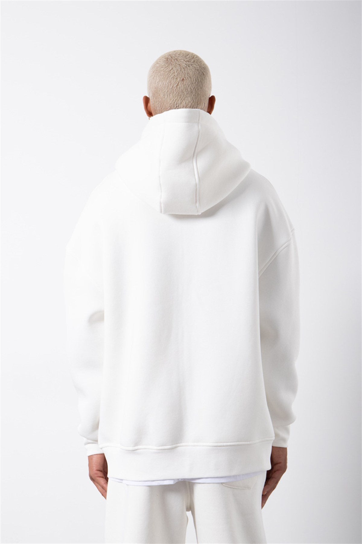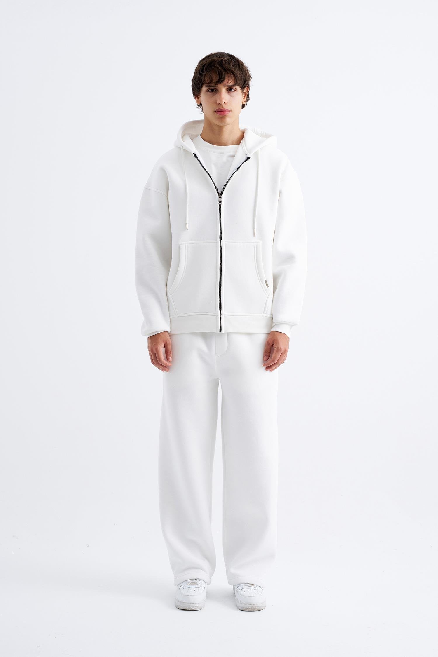 Erkek Oversize Fermuarlı Cepli Kapüşonlu Basic Sweatshirt Ekru