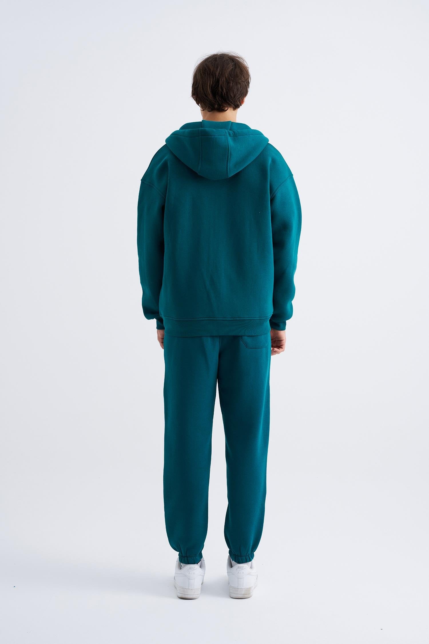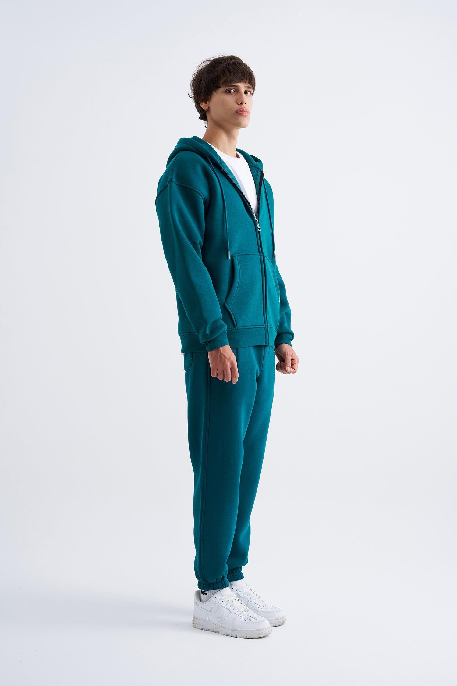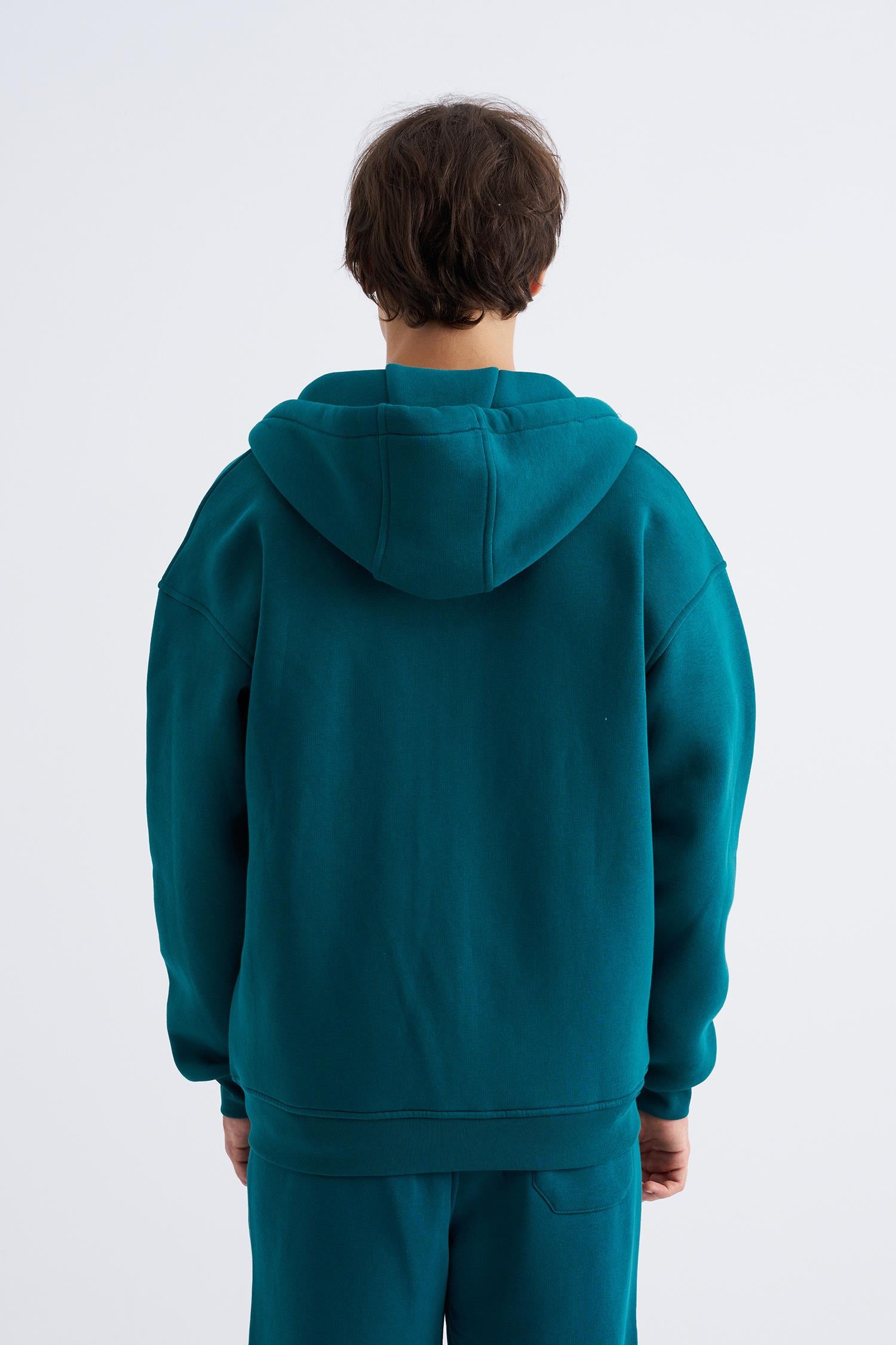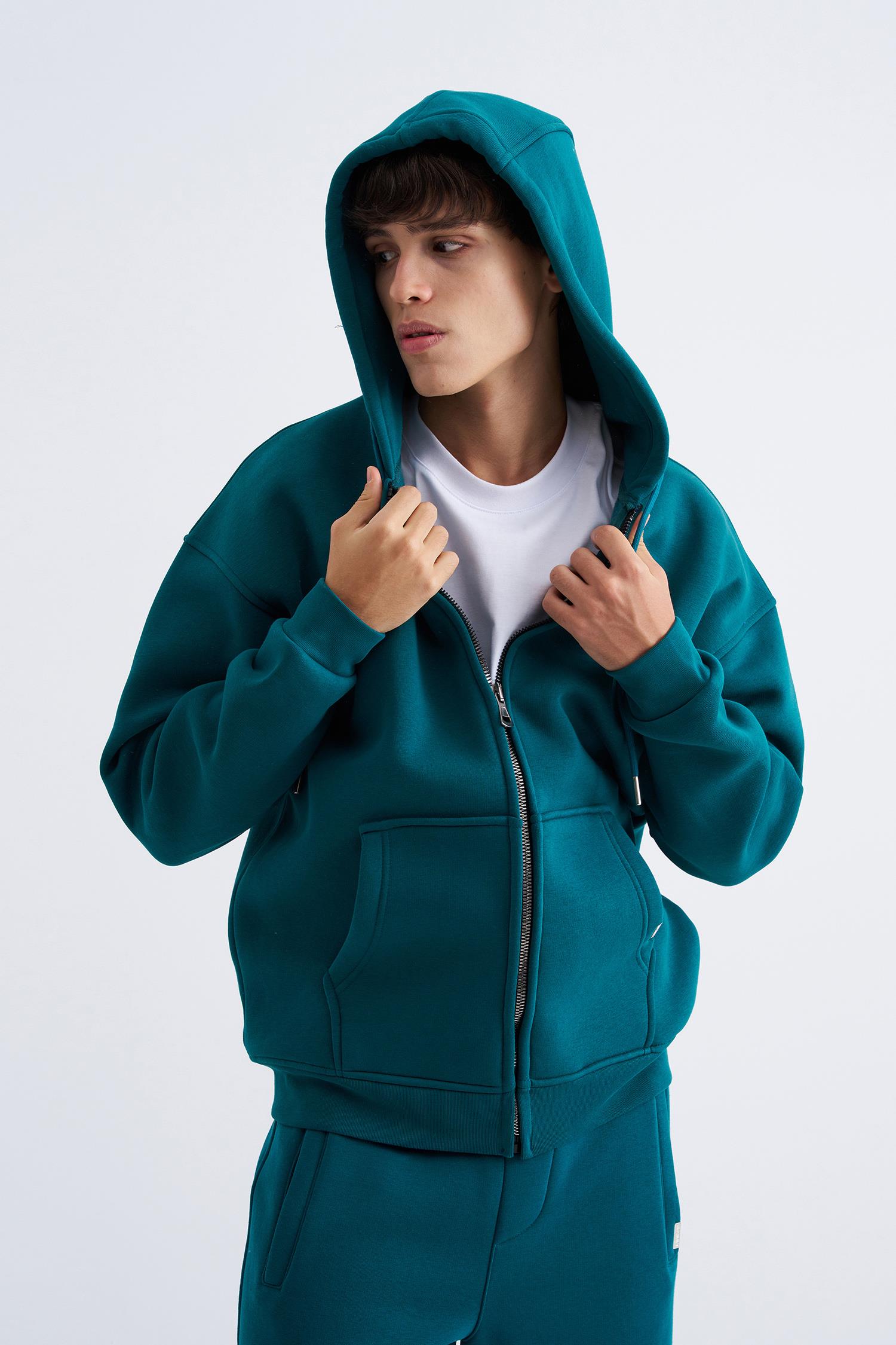 Erkek Oversize Fermuarlı Cepli Kapüşonlu Basic Sweatshirt Aqua