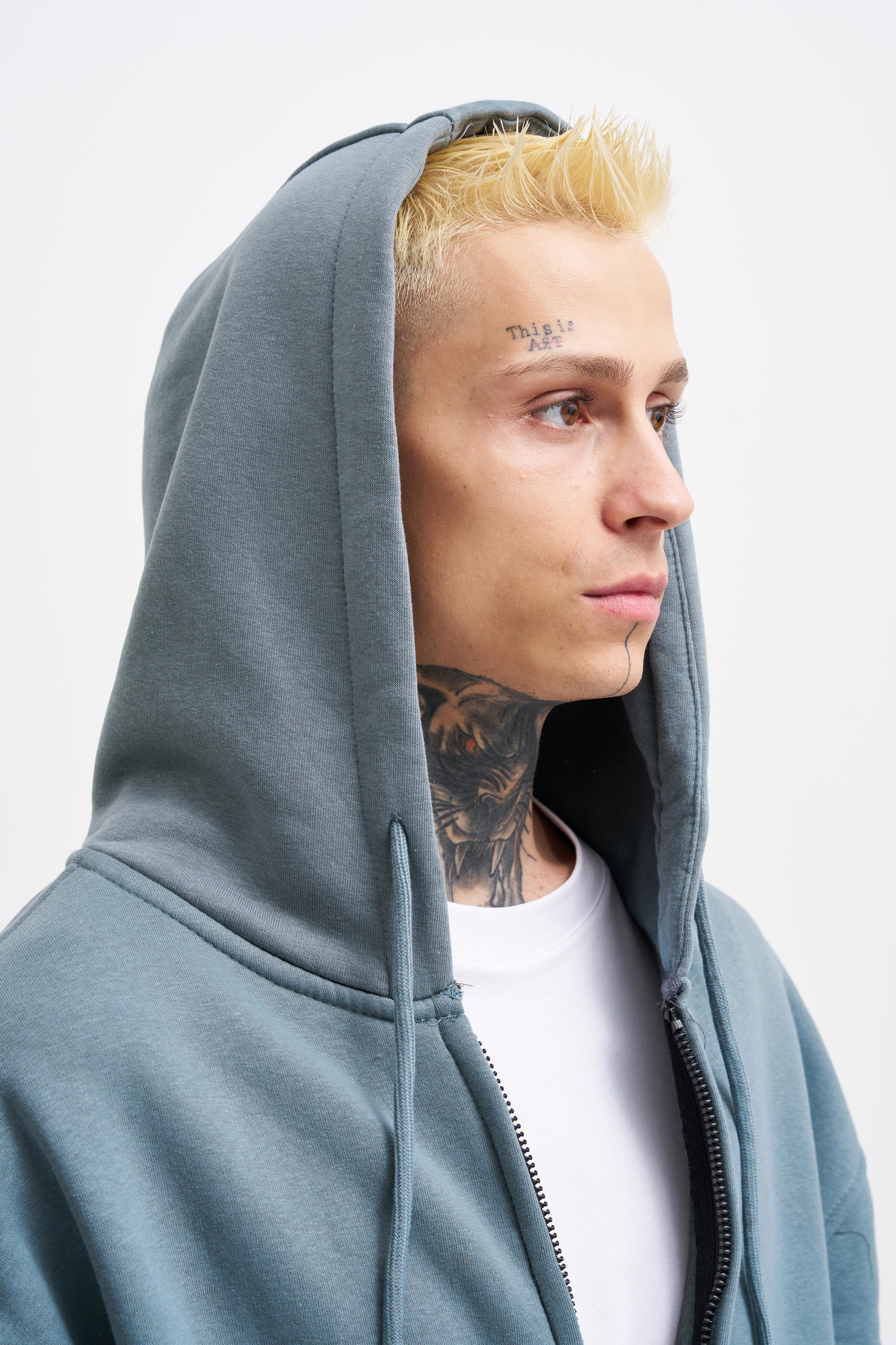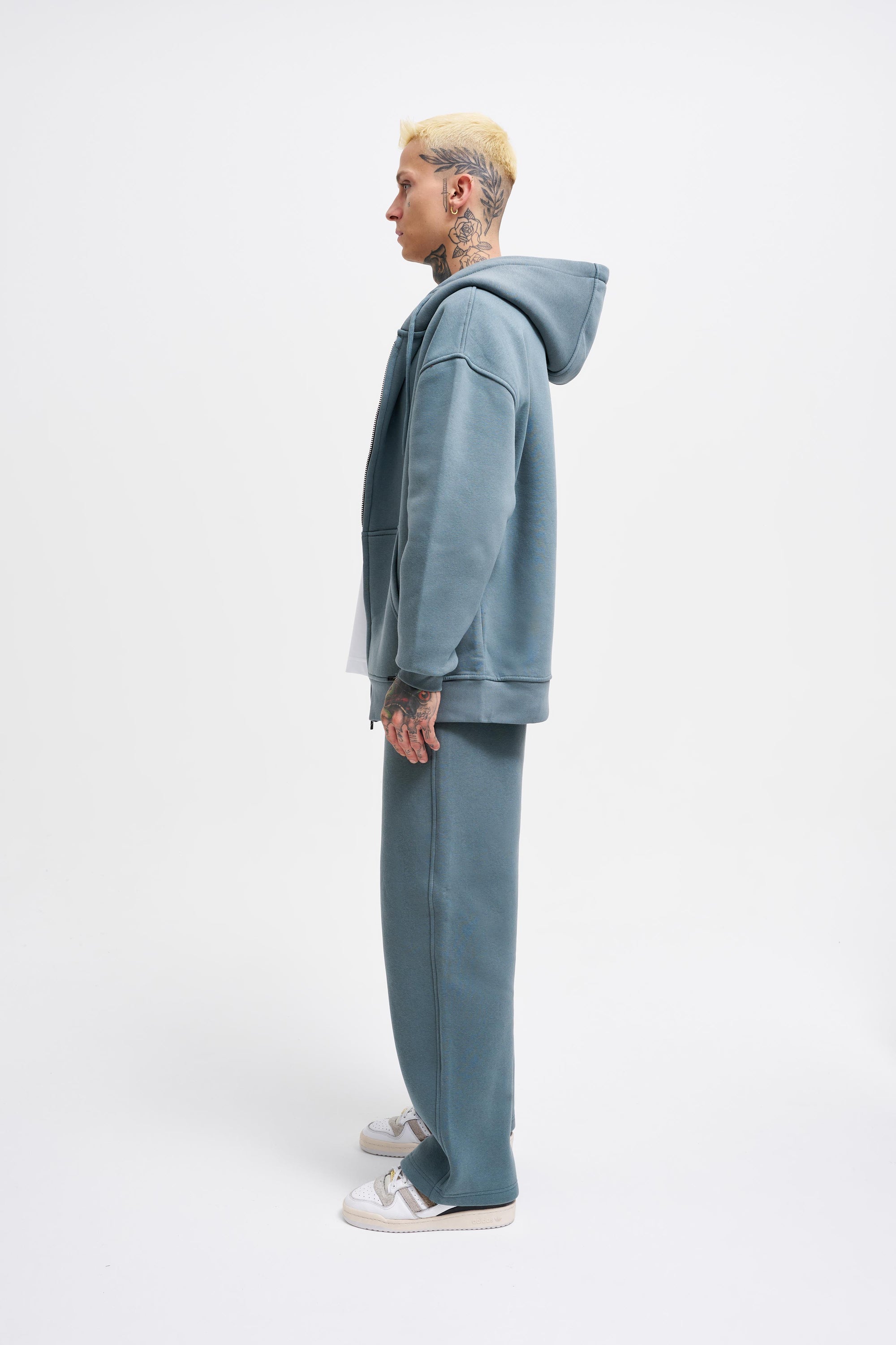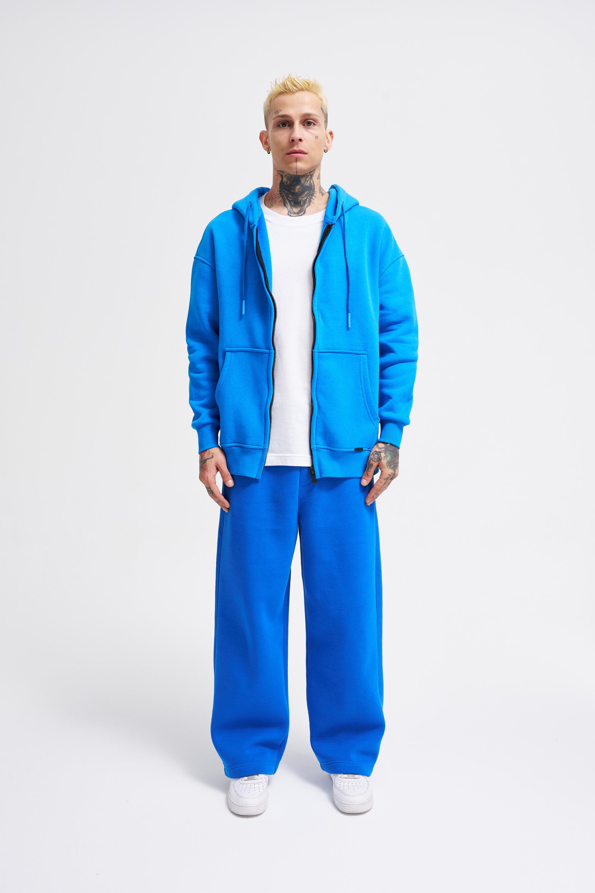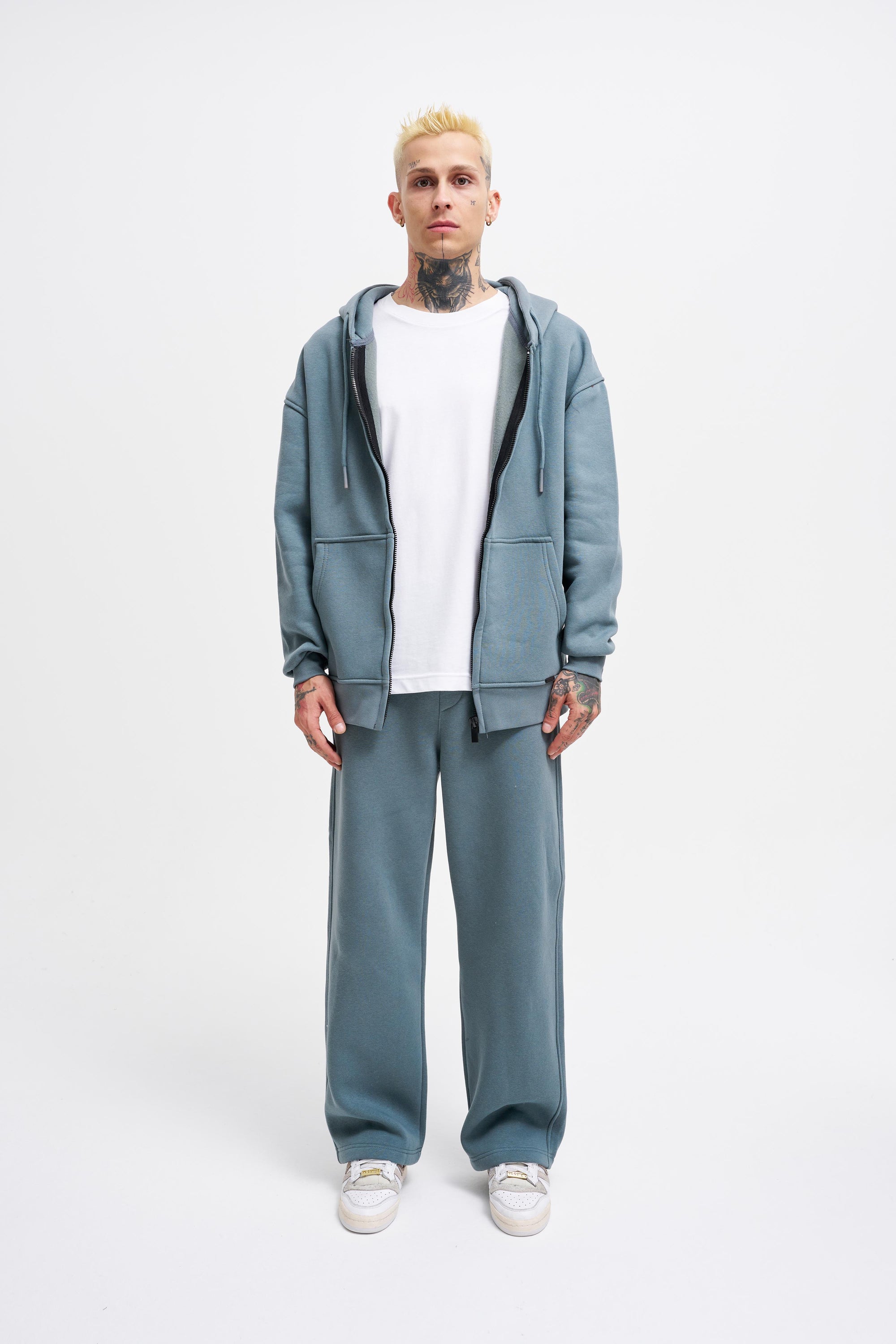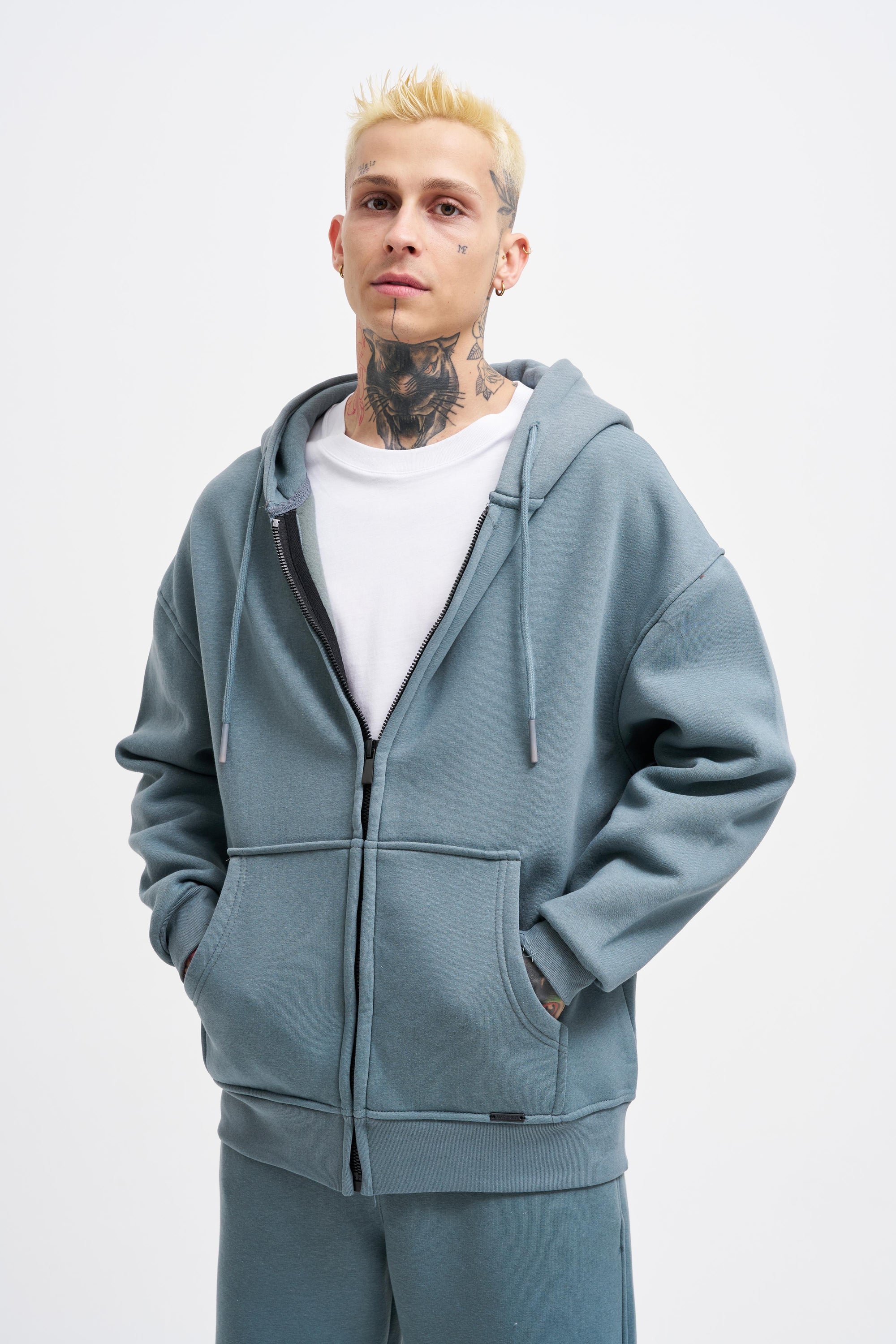 Erkek Oversize Fermuarlı Cepli Kapüşonlu Basic Sweatshirt Aqua