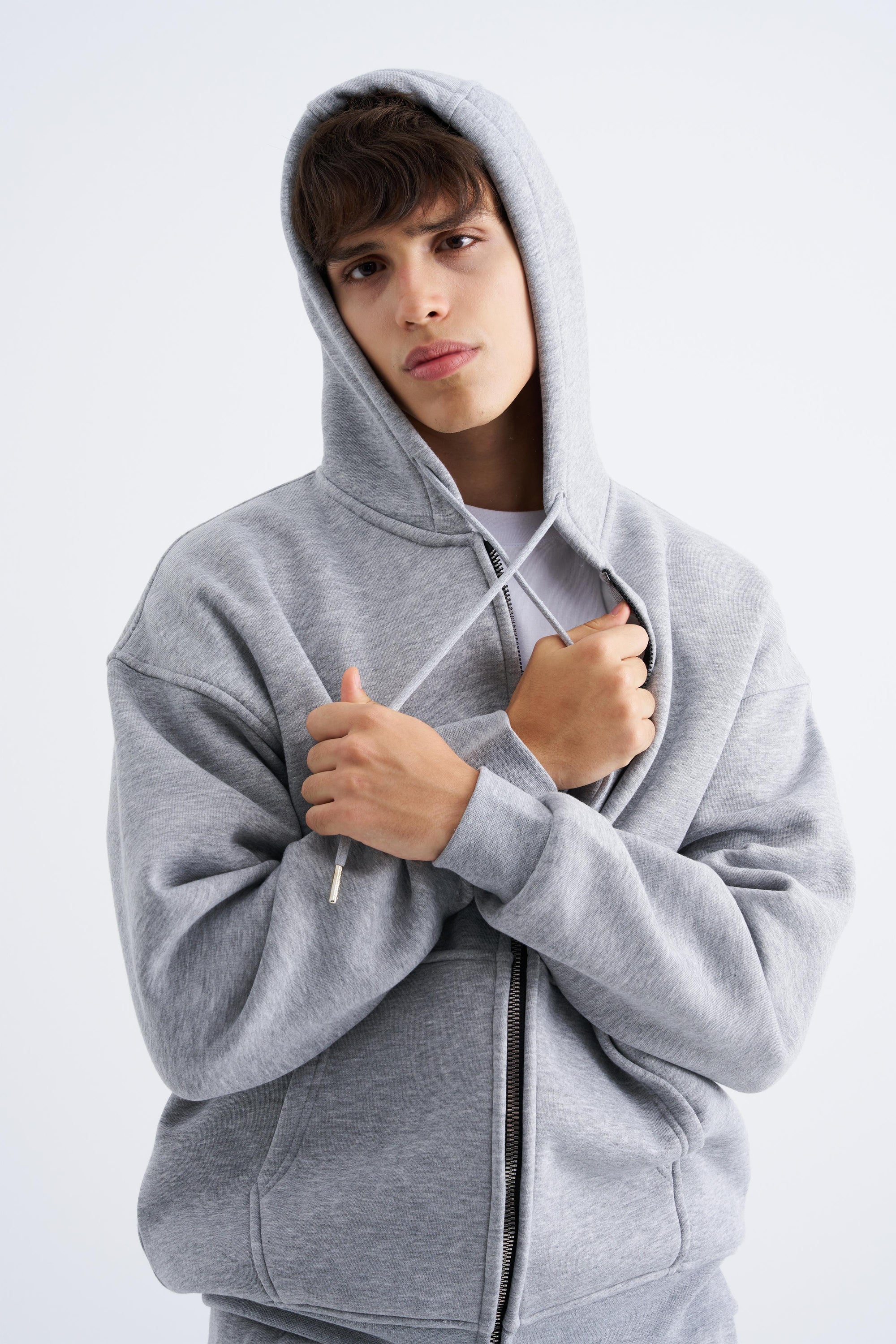 Erkek Oversize Fermuarlı Cepli Kapüşonlu Basic Sweatshirt Açık Gri