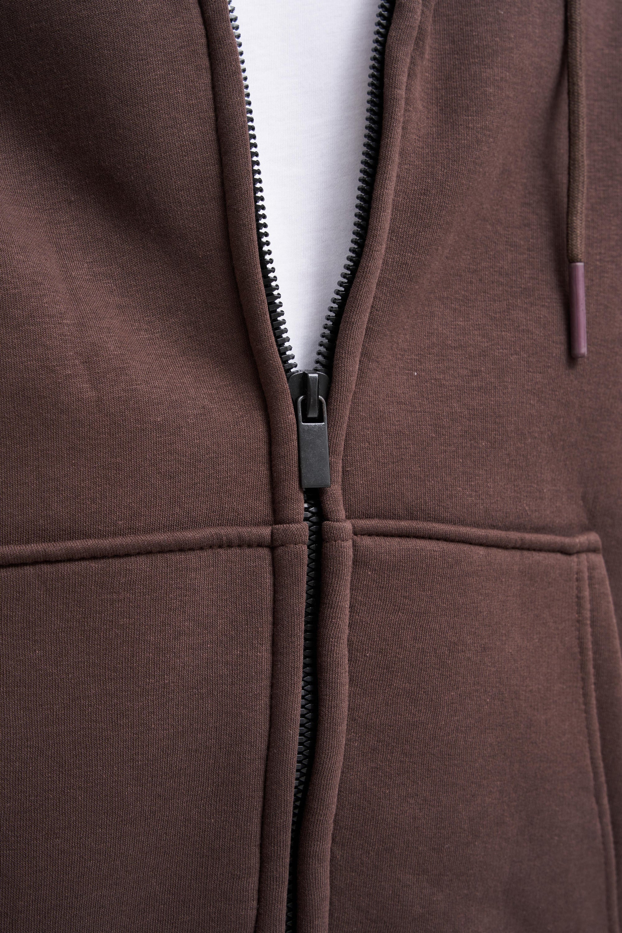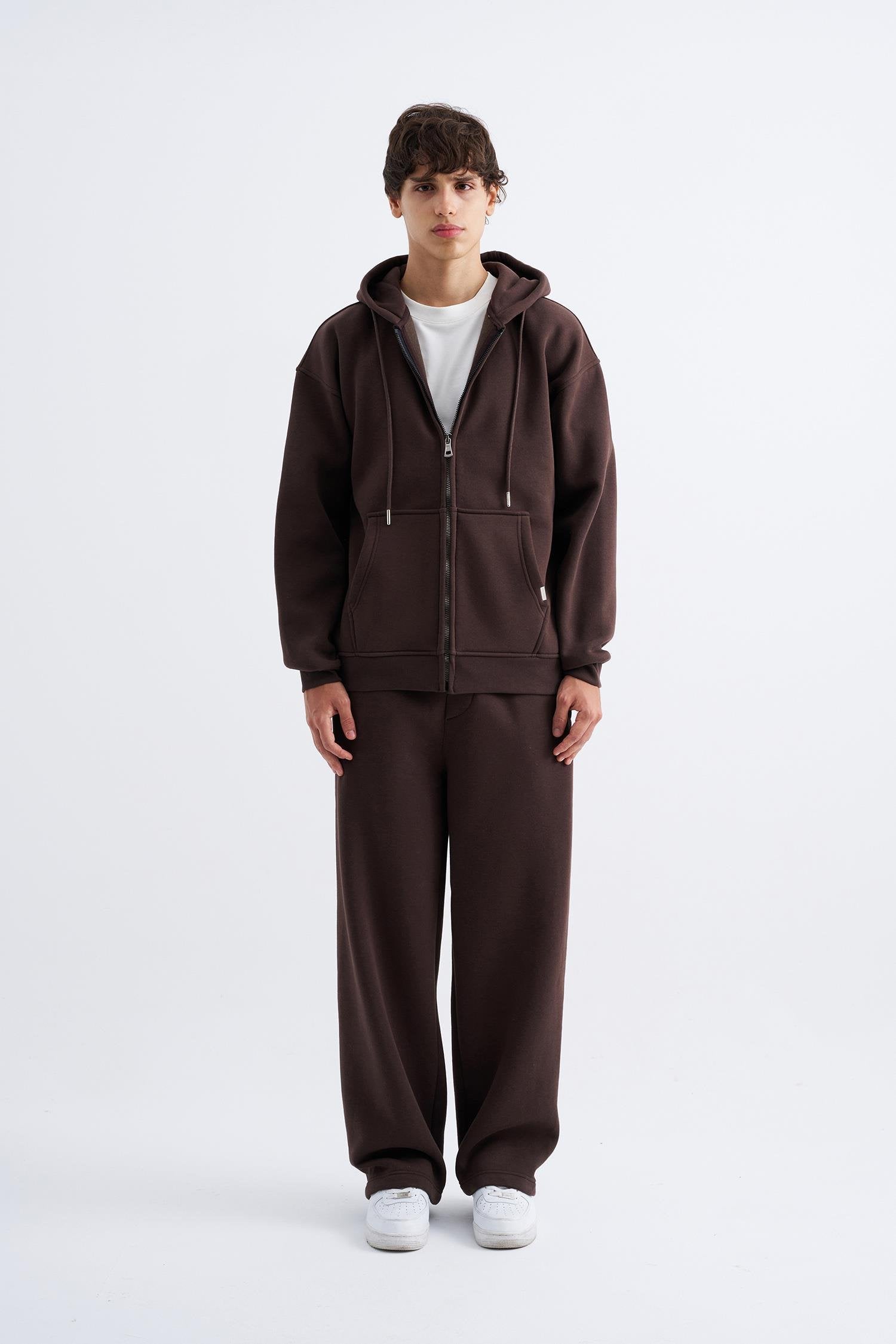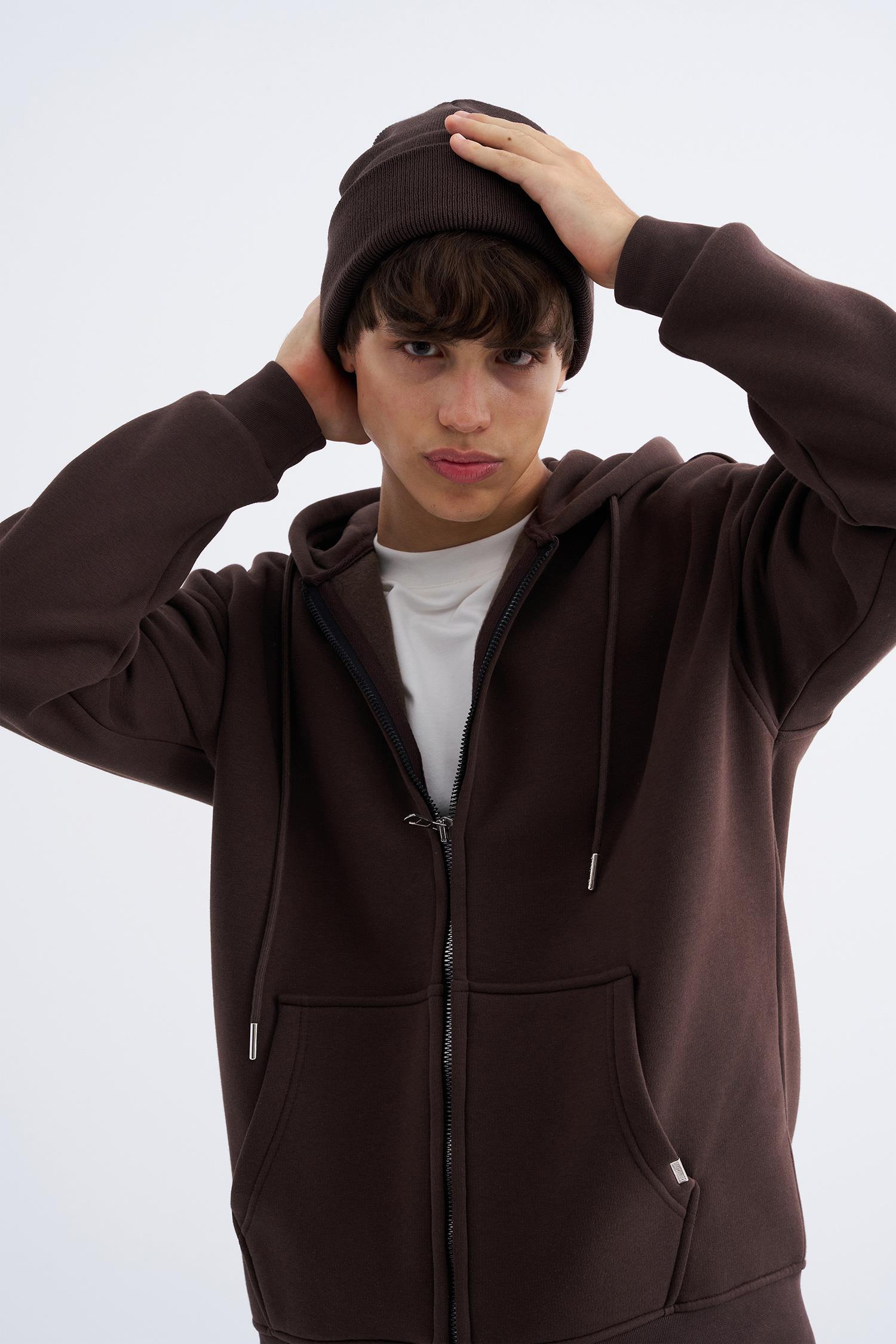 Erkek Oversize Fermuarlı Cepli Kapüşonlu Basic Sweatshirt Koyu Kahverengi