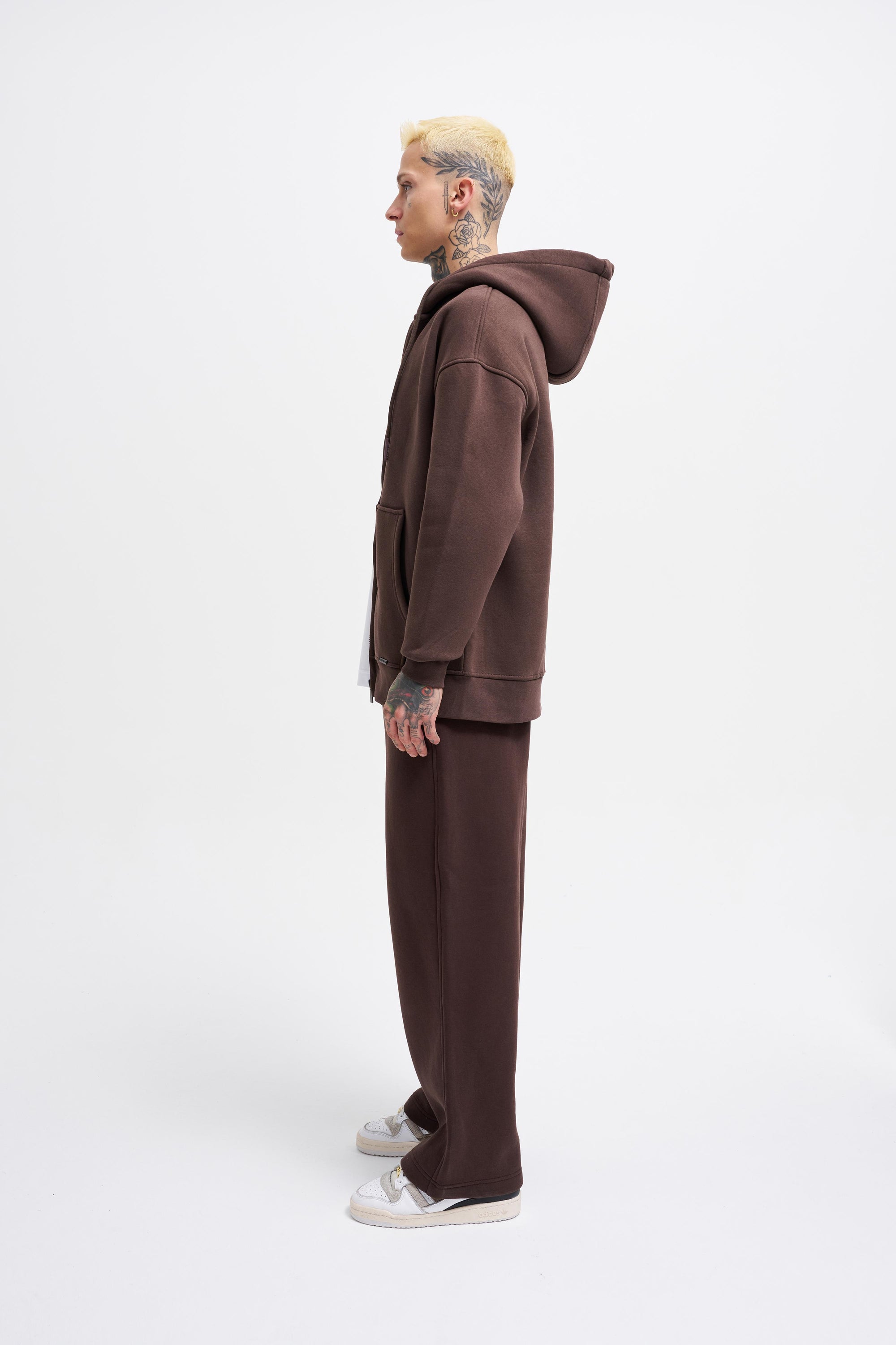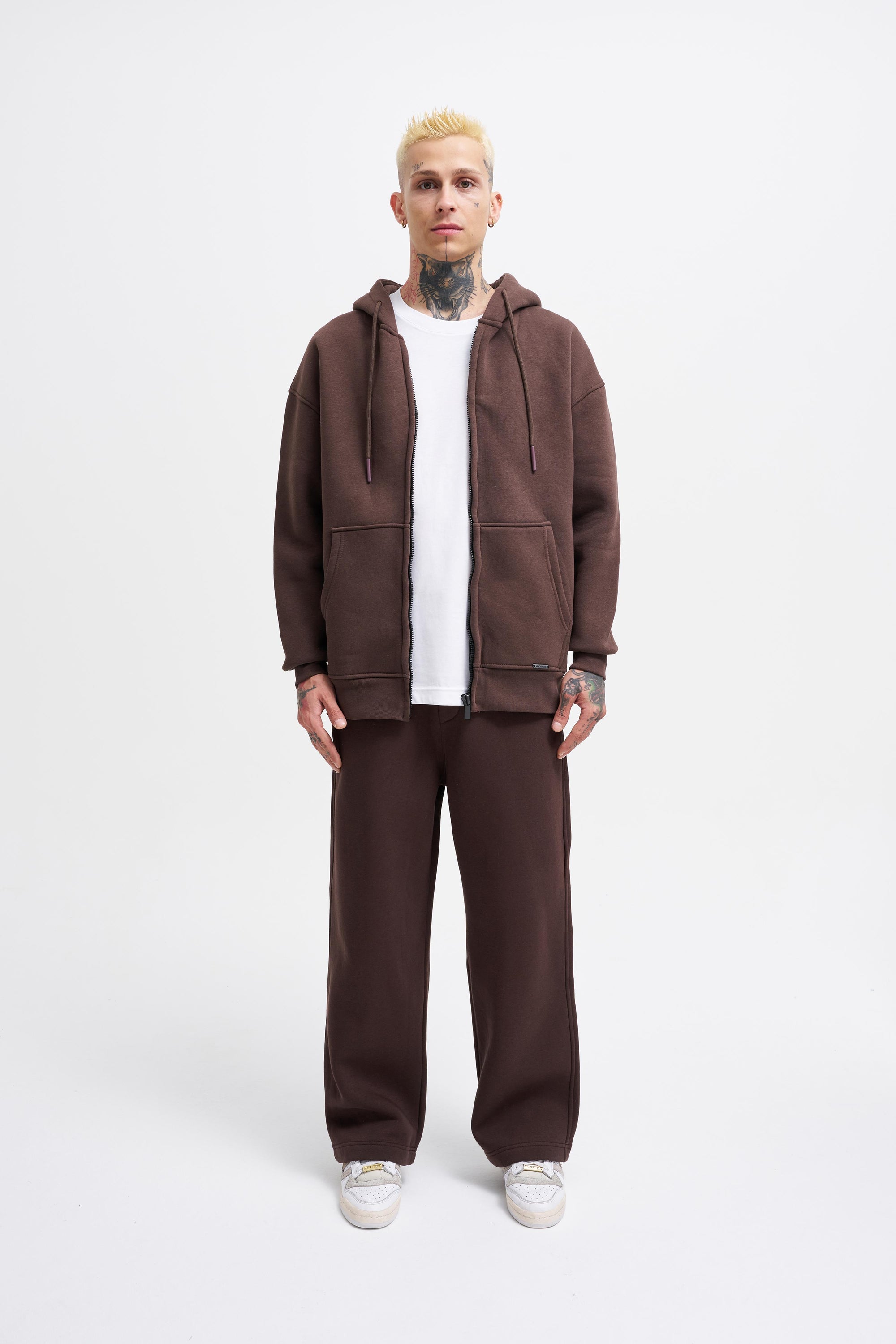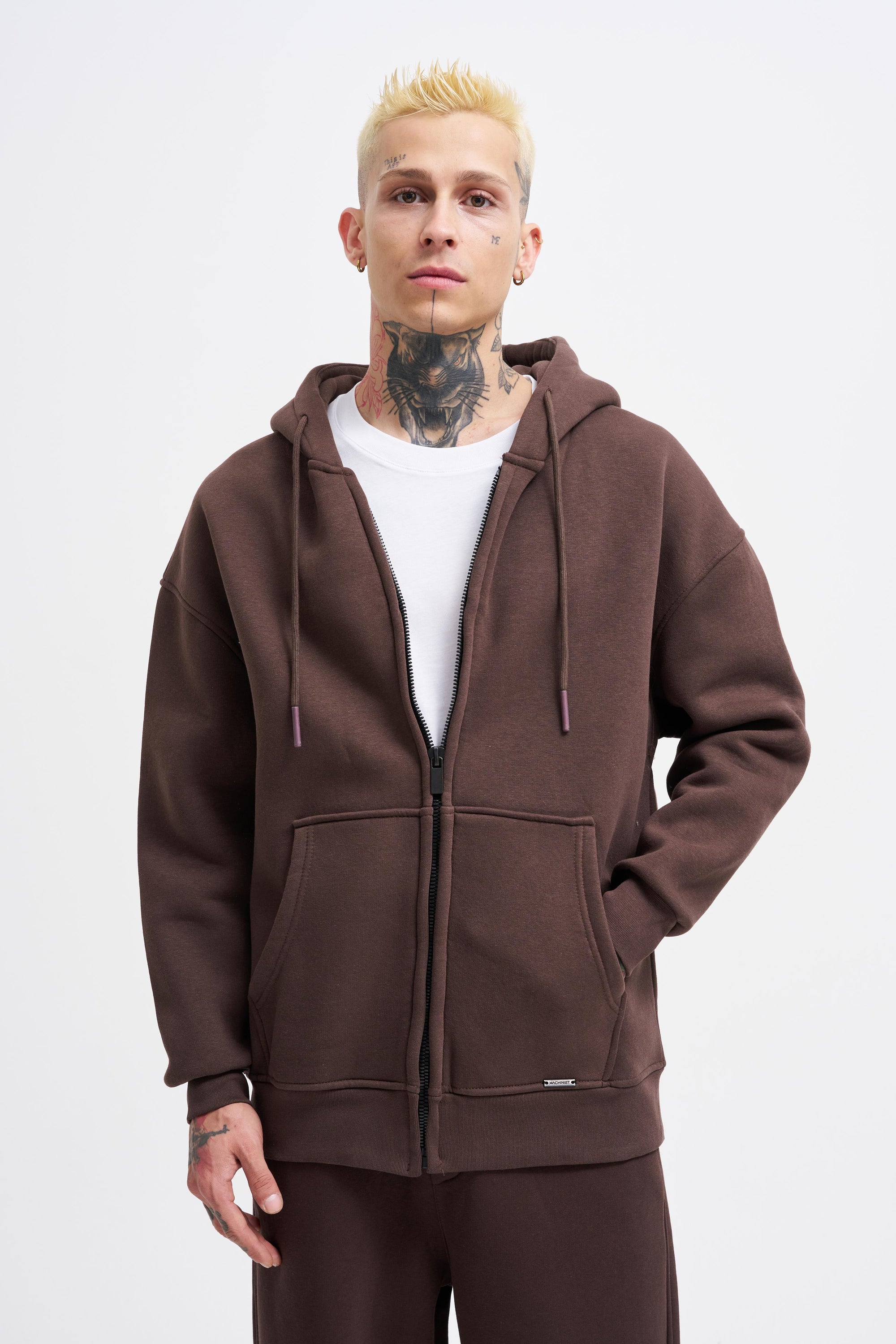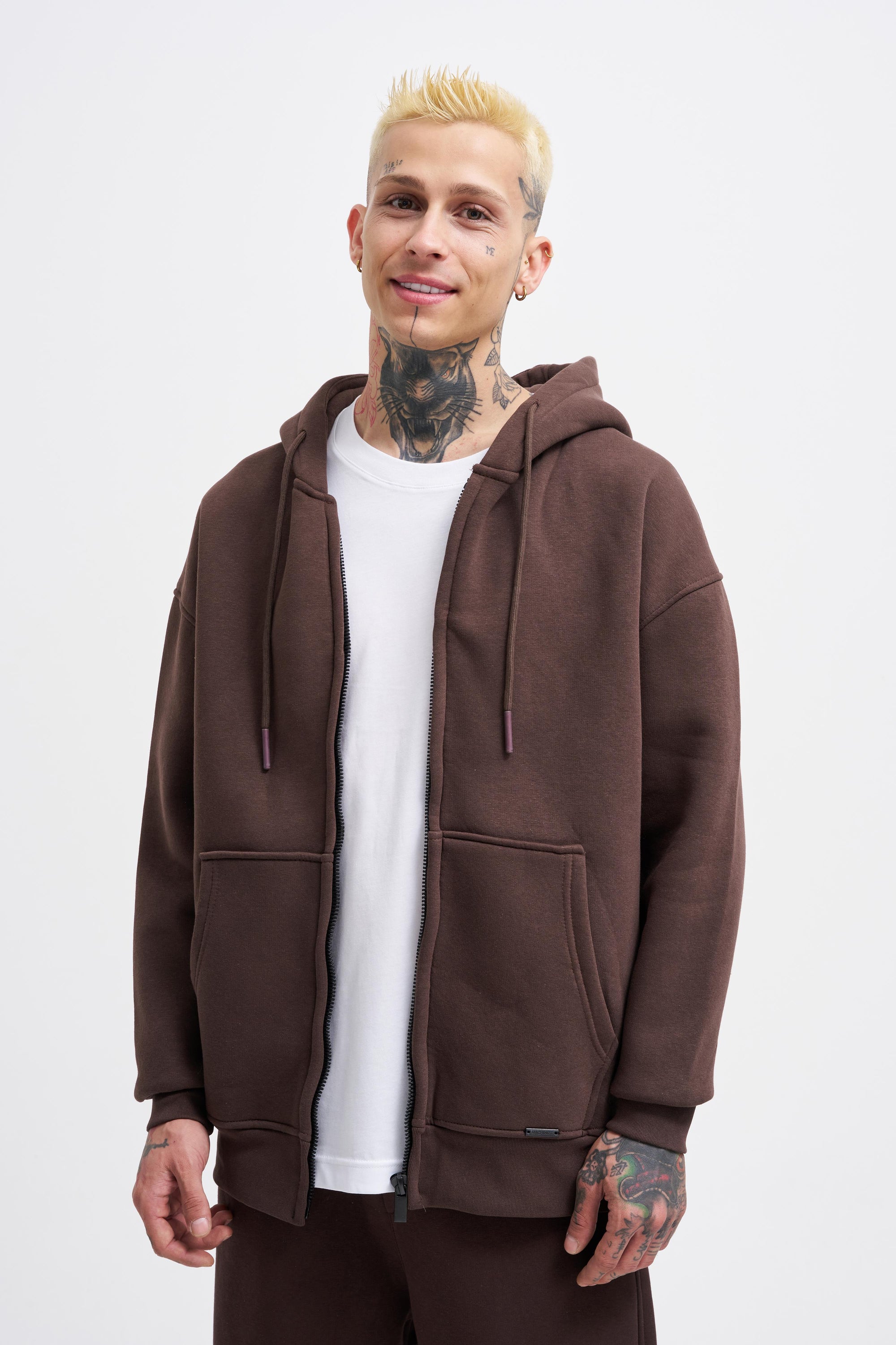 Erkek Oversize Fermuarlı Cepli Kapüşonlu Basic Sweatshirt Koyu Kahverengi