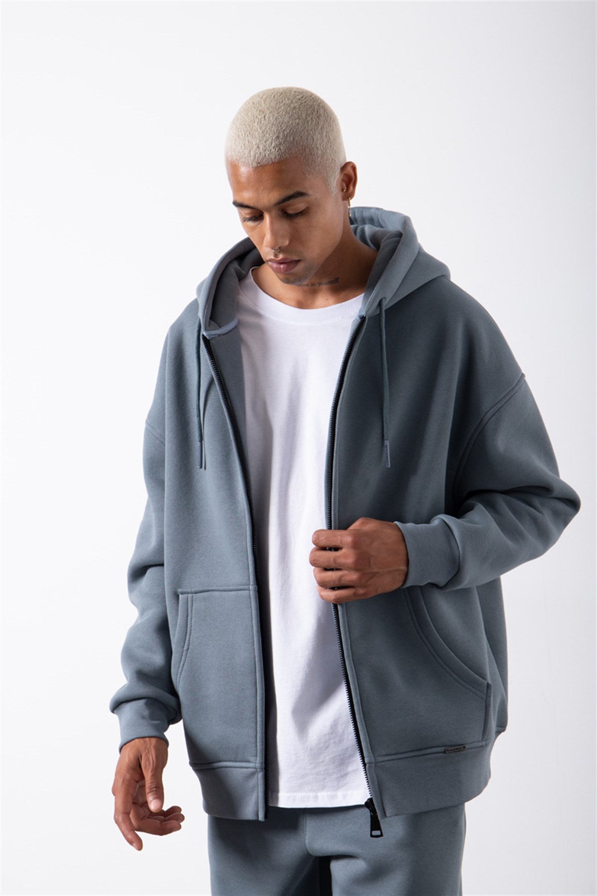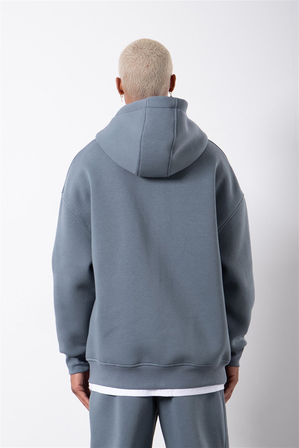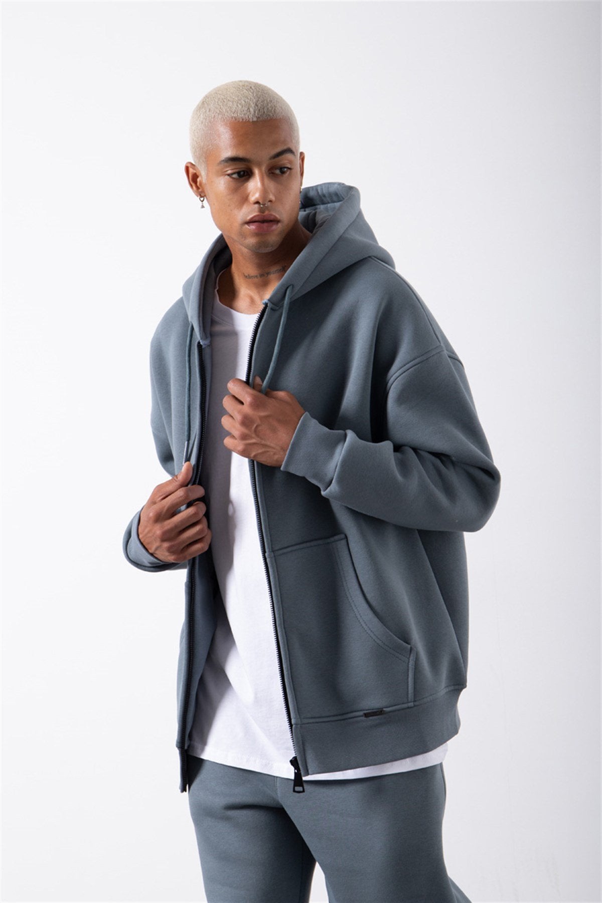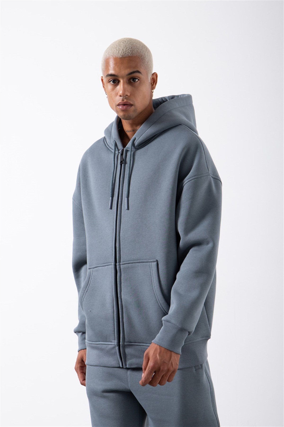 Erkek Oversize Fermuarlı Cepli Kapüşonlu Basic Sweatshirt Mavi Duman