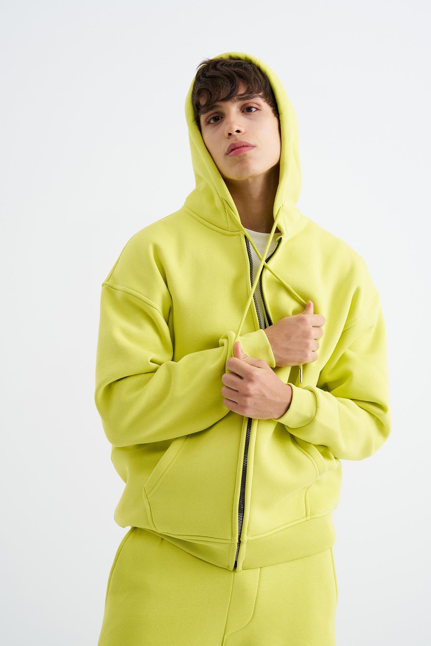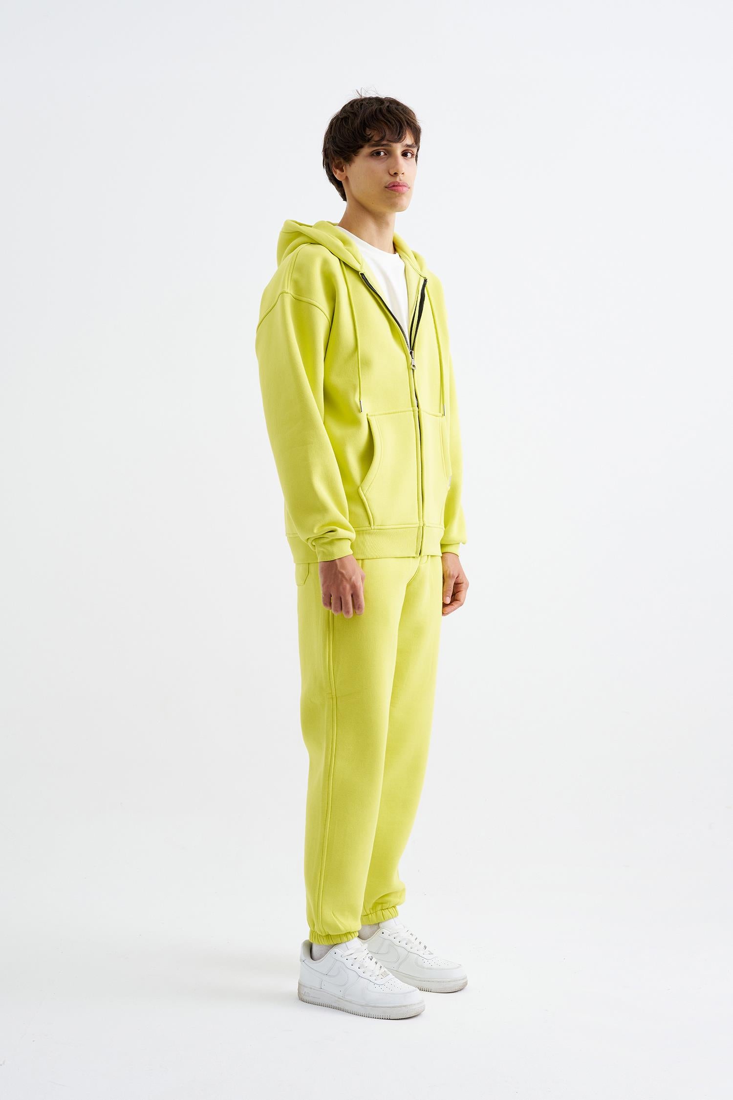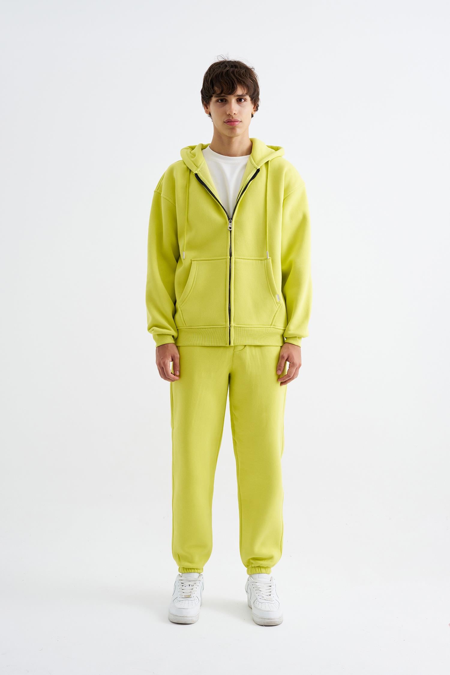 Erkek Oversize Fermuarlı Cepli Kapüşonlu Basic Sweatshirt Neon Sarı