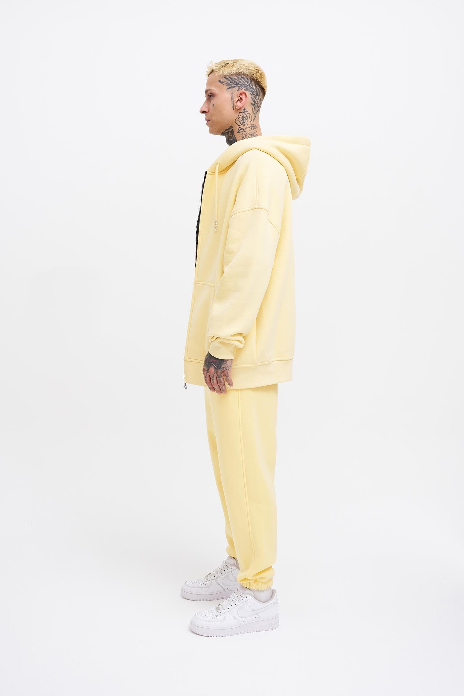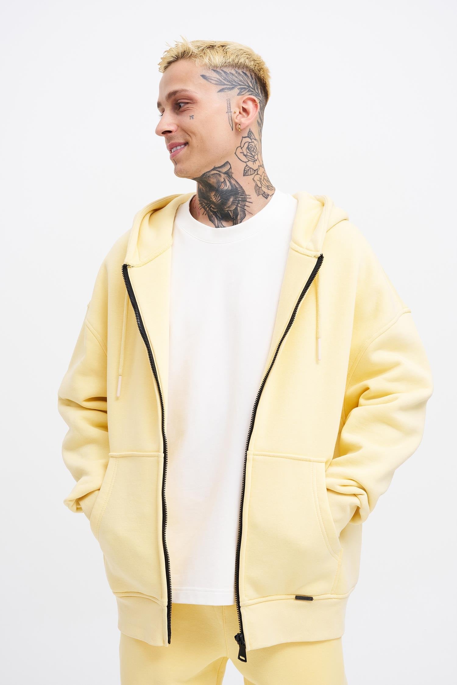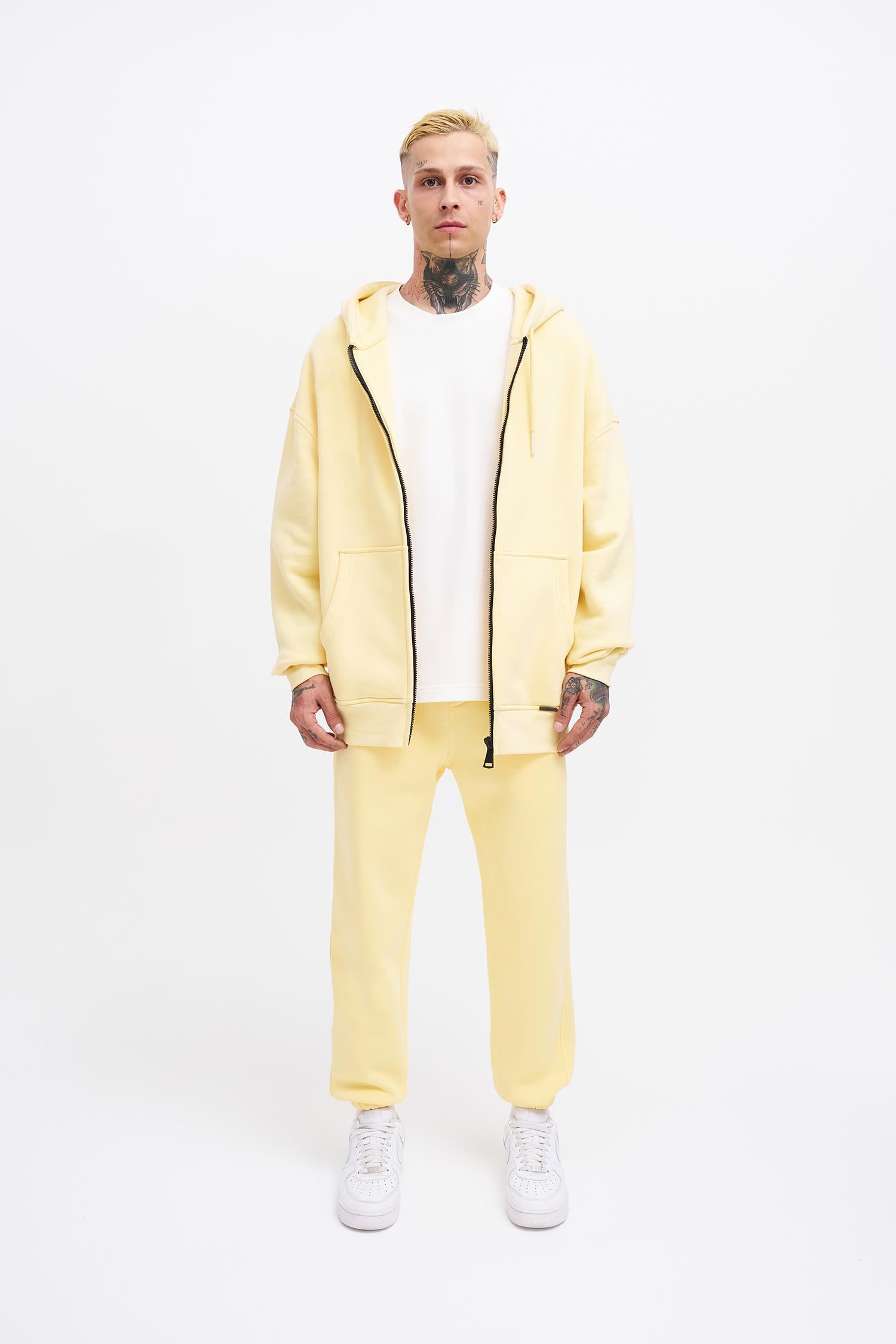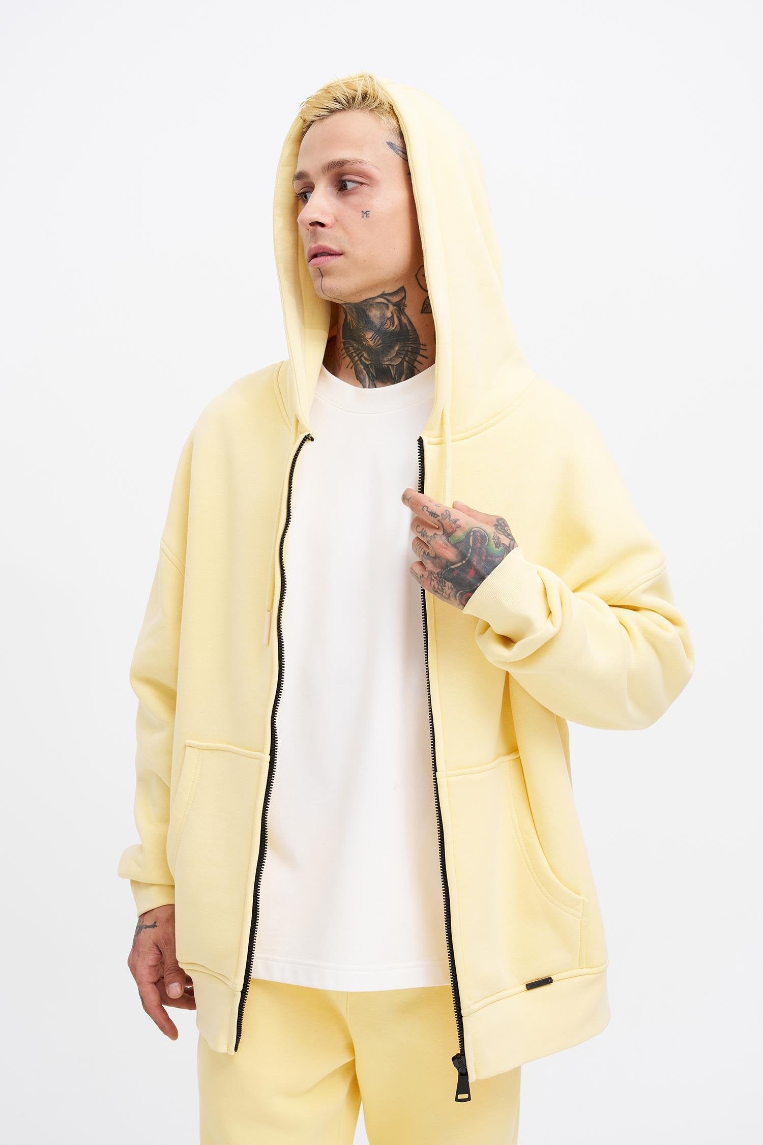 Erkek Oversize Fermuarlı Cepli Kapüşonlu Basic Sweatshirt Sarı