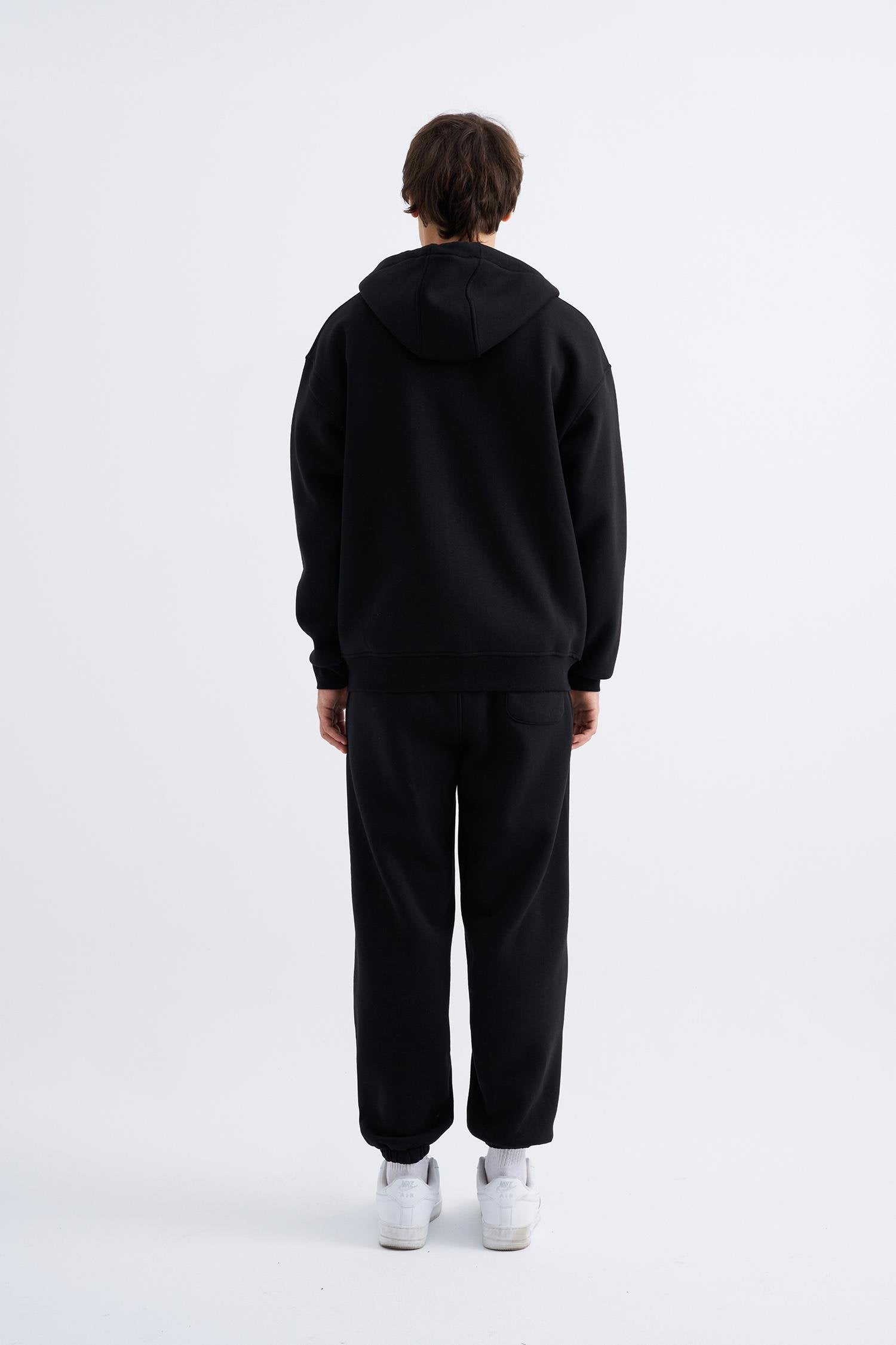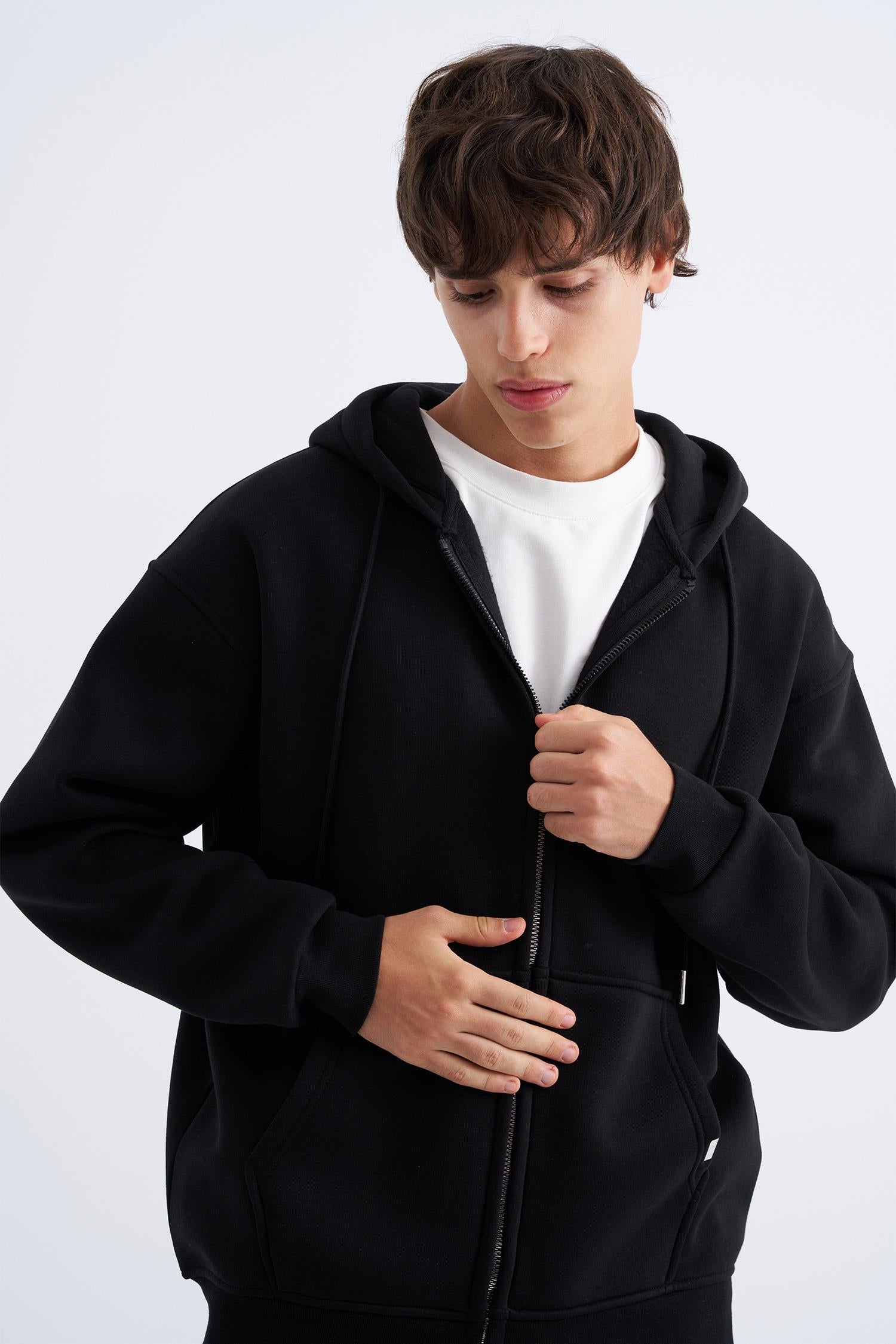 Erkek Oversize Fermuarlı Cepli Kapüşonlu Basic Sweatshirt Siyah