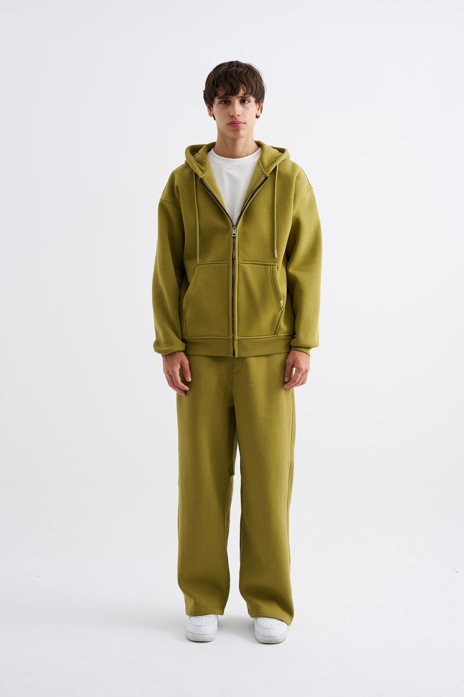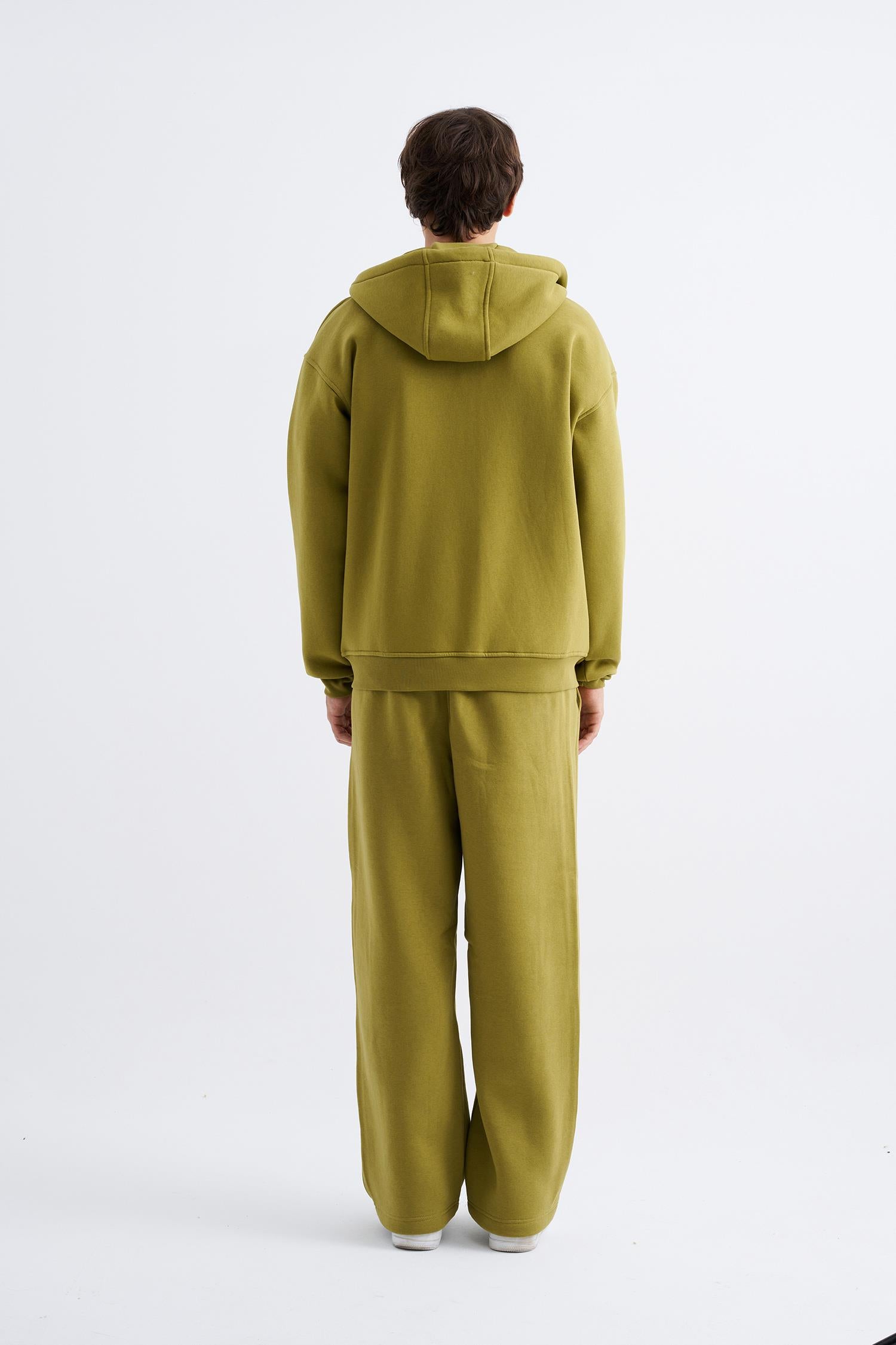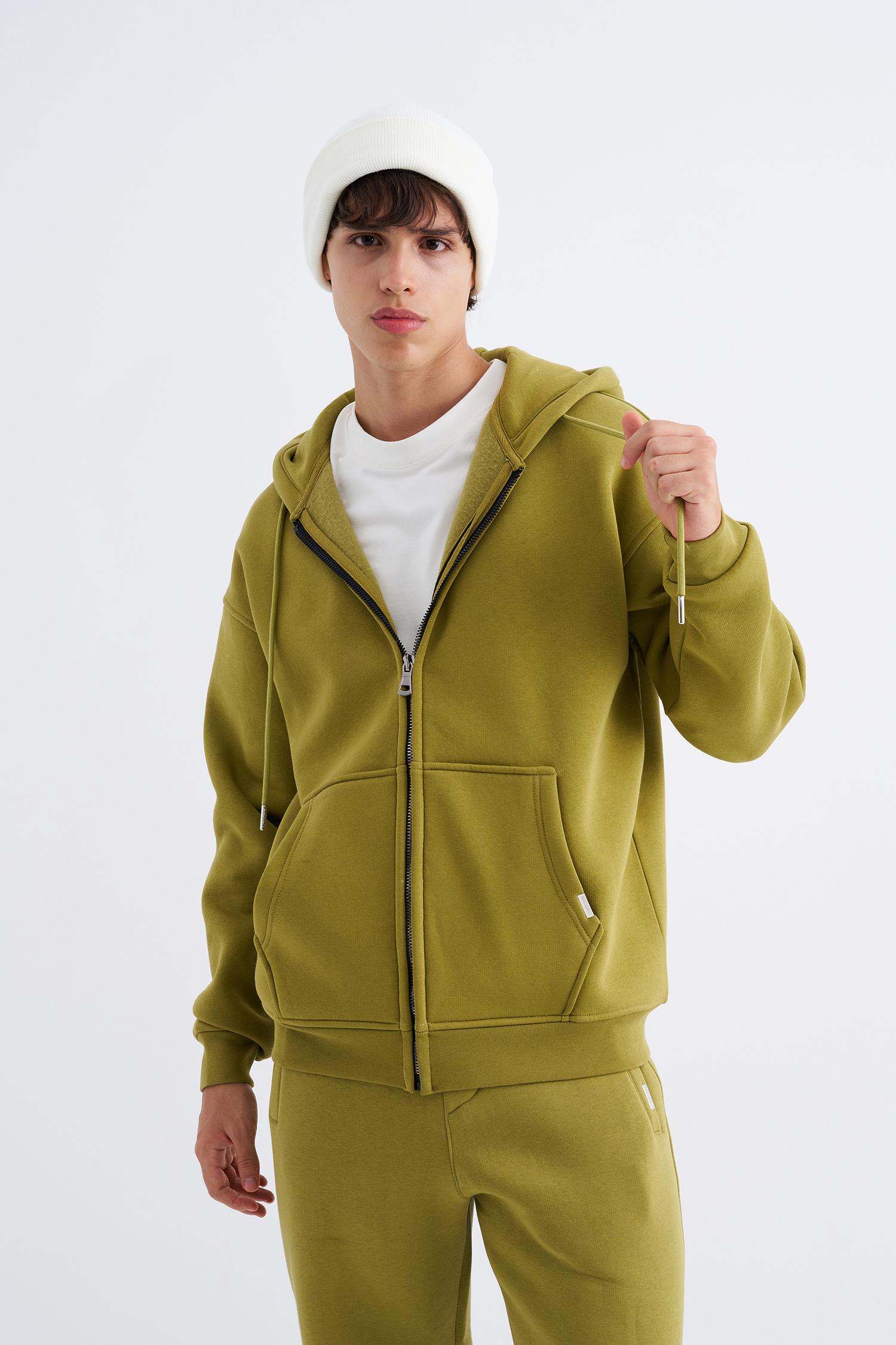 Erkek Oversize Fermuarlı Cepli Kapüşonlu Basic Sweatshirt Yağ Yeşili