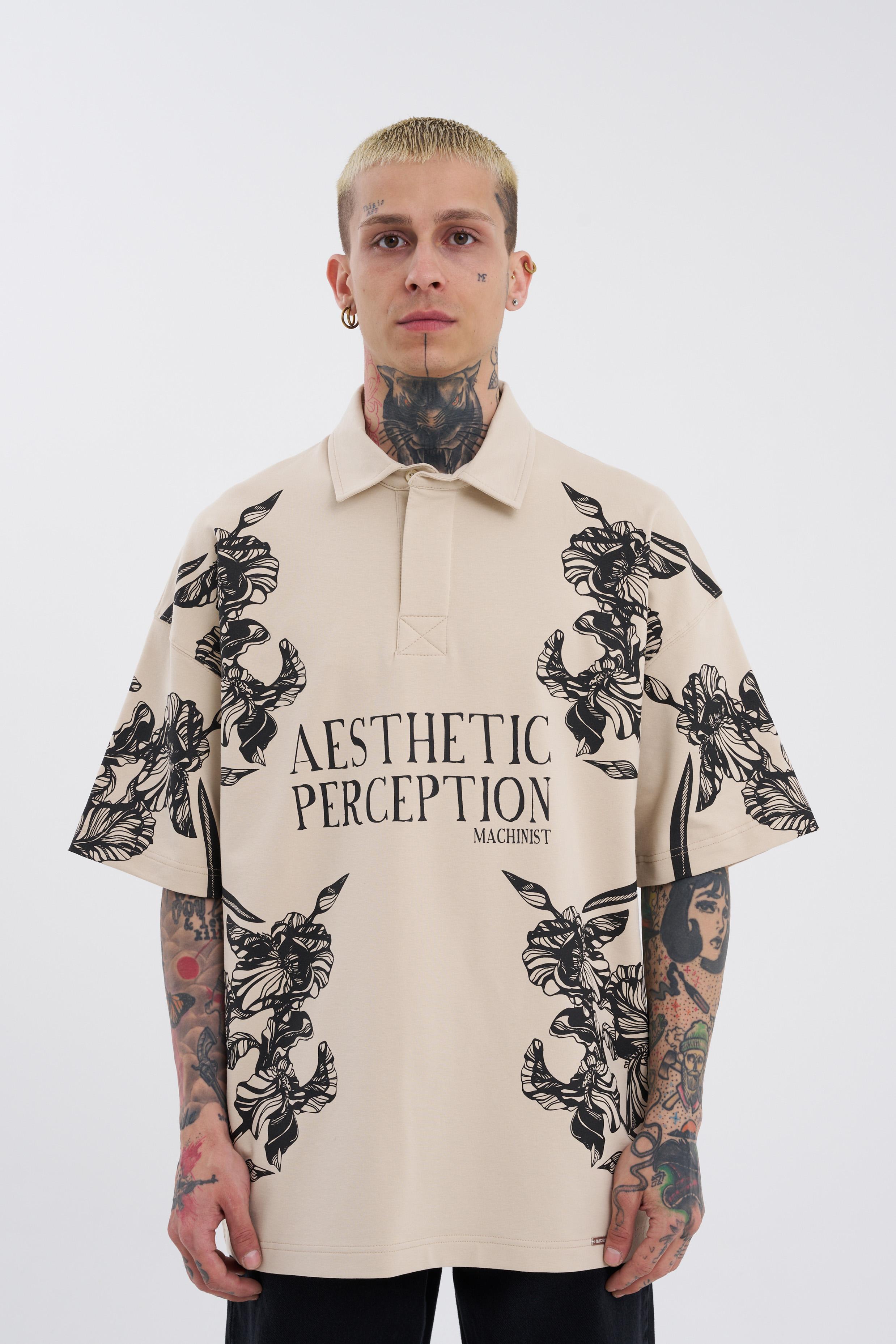 Erkek Aesthetic Flower Baskılı Açık Bej Polo Yaka Tişört